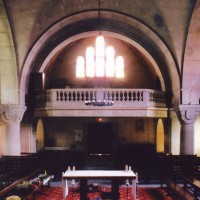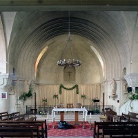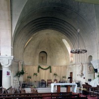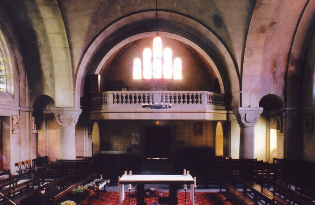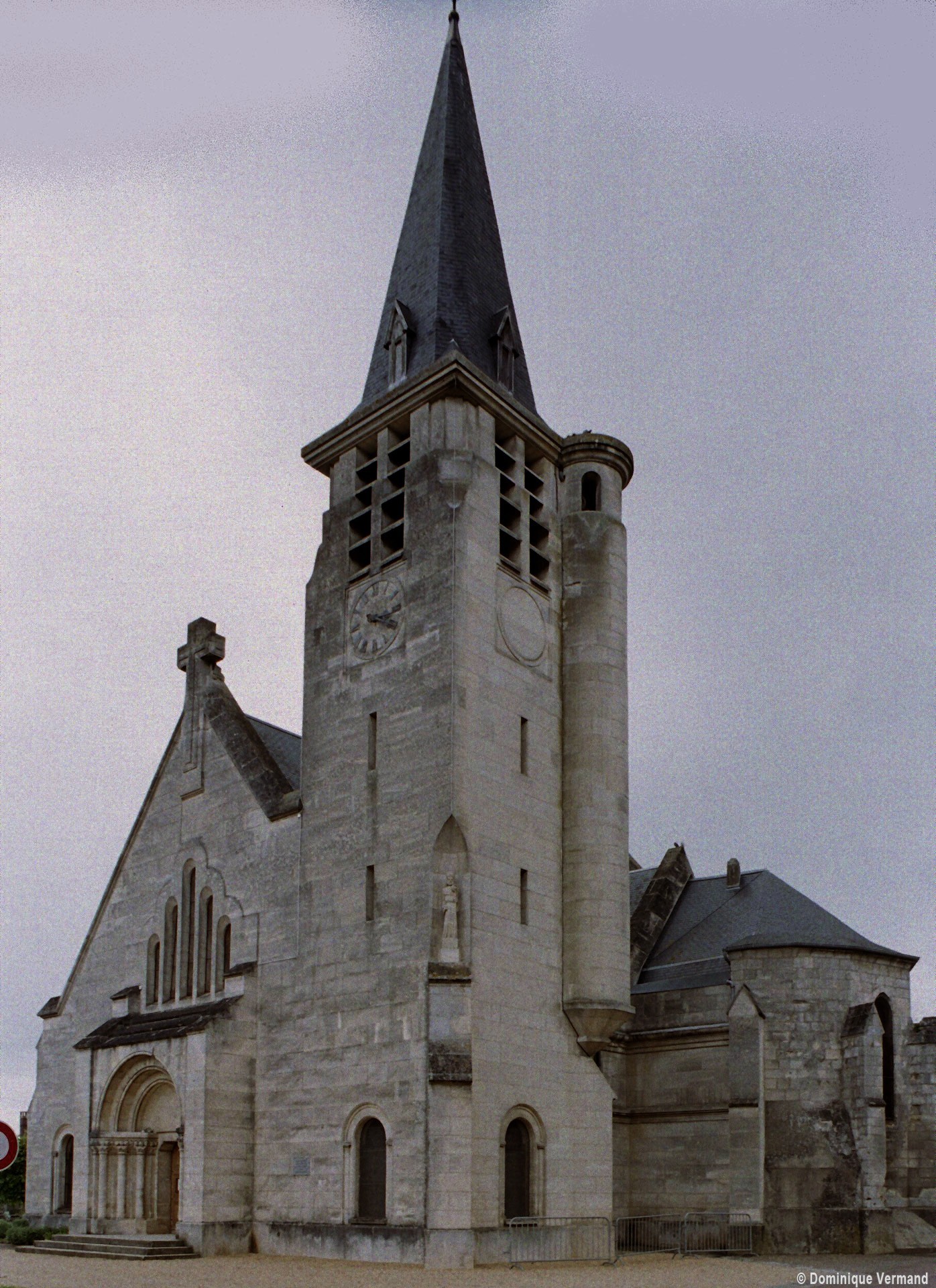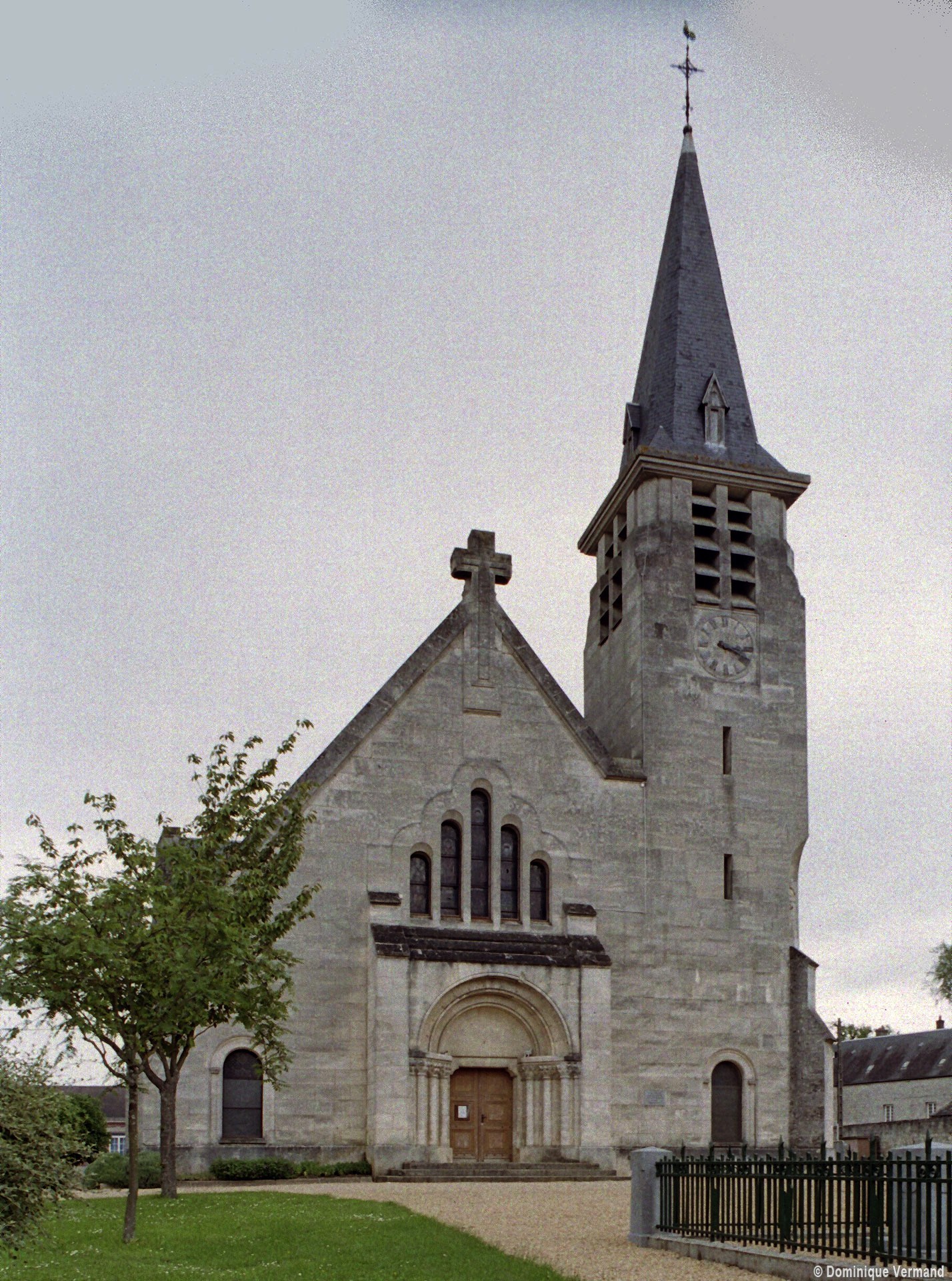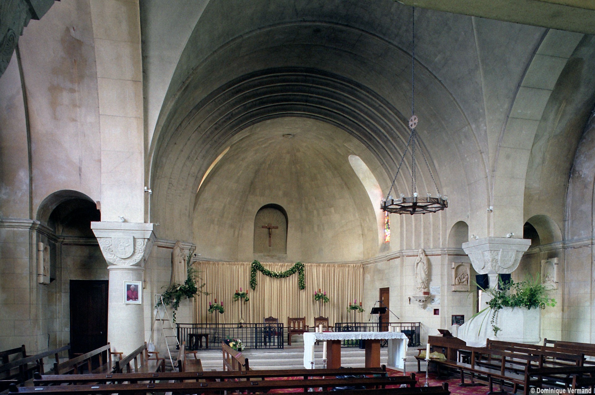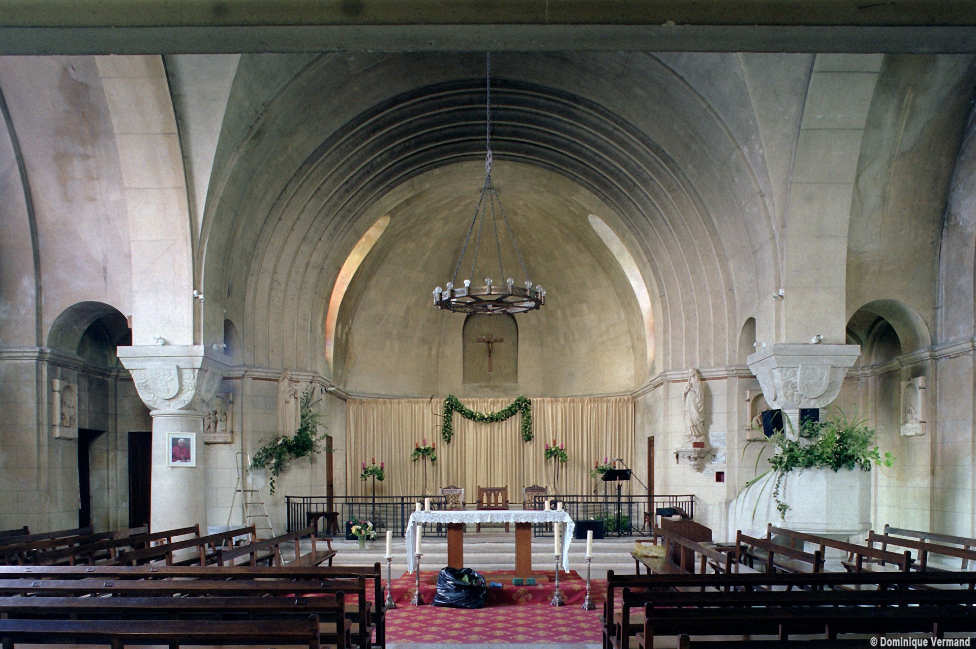 La nouvelle église, bâtie dans la belle pierre calcaire de la région, est dominée par un haut clocher latéral de style art déco intégré dans un massif de façade avec tribune. A l’opposé, le choeur pentagonal fait écho à l’abside de l’ancien édifice. Entre les deux se développe une nef de plan carré, qui est la partie la plus originale de Saint-Eloi. Une voûte d’arêtes encadrée par quatre arcs-doubleaux en plein cintre en couvre la majeure partie. Ces derniers retombent sur quatre piles circulaires par l’intermédiaire de gros chapiteaux cubiques sculptés, en faible relief, des symboles des évangélistes. D’étroites voûtes en berceau assurent la liaison entre cet espace central et les murs latéraux, le porche et le choeur. La chapelle du palais épiscopal de Laon, des années 1180, montre une telle disposition, dérivée de modèles beaucoup plus anciens.