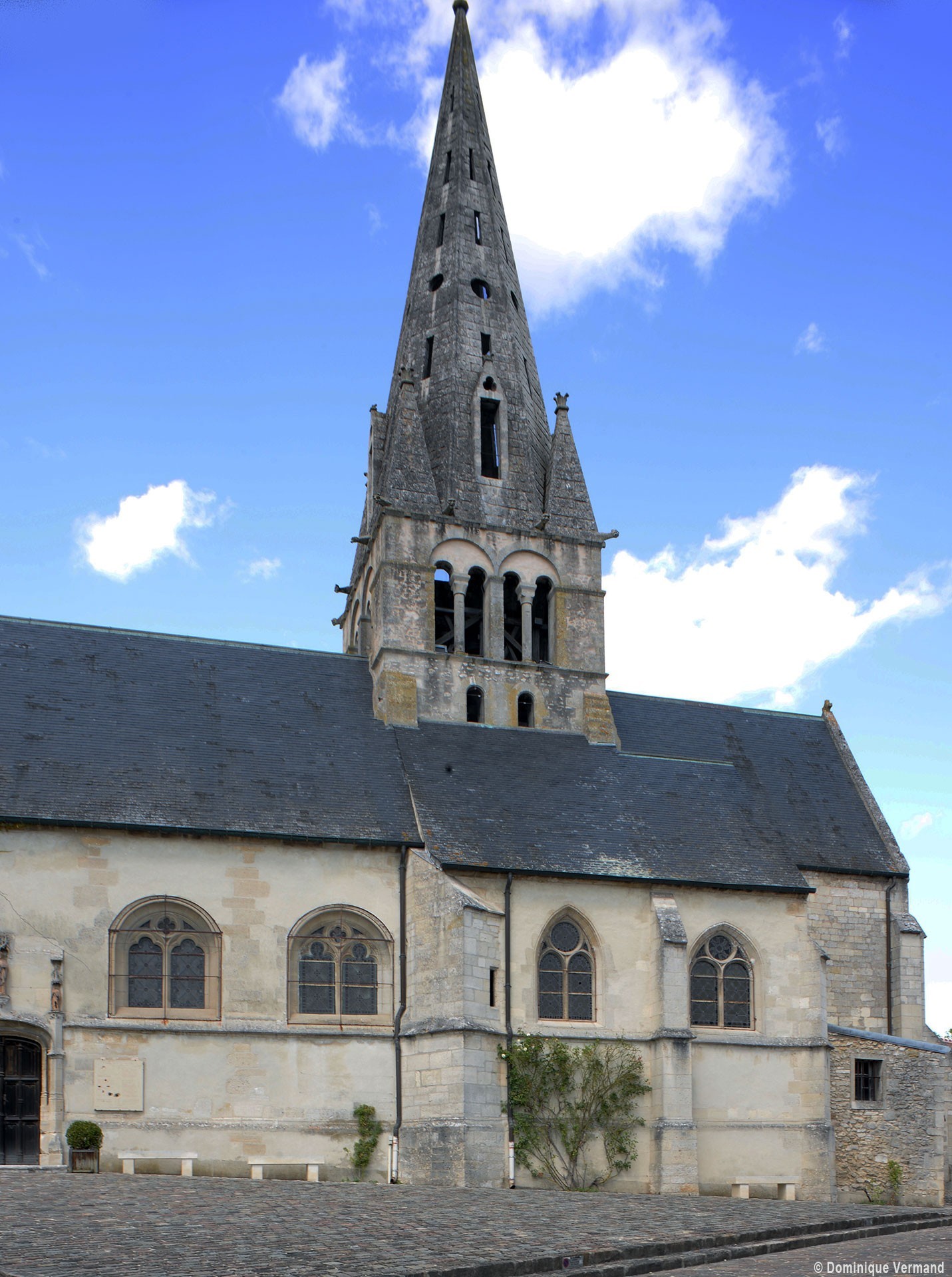 Communiquant avec la nef et le choeur par des arcades brisées reçues sur des chapiteaux décorés de feuilles plates, de palmettes ou de grosses volutes d’angle, la base est couverte d’une voûte d’arêtes dont l’authenticité est probable et constitue l’un des derniers et rares exemples de voûte romane dans une région où la voûte d’ogives apparaît très tôt. Assez austère, l’étage du beffroi du clocher est ouvert sur chaque face de deux baies géminées en plein cintre subdivisées par une colonnette. Flanquée de pyramides aux angles et ajourée, la haute flèche octogonale en pierre est une évocation modeste mais particulièrement heureuse de celle, par ailleurs géographiquement si proche, de la cathédrale de Senlis et peut donc être attribuée au milieu du 13ème siècle.