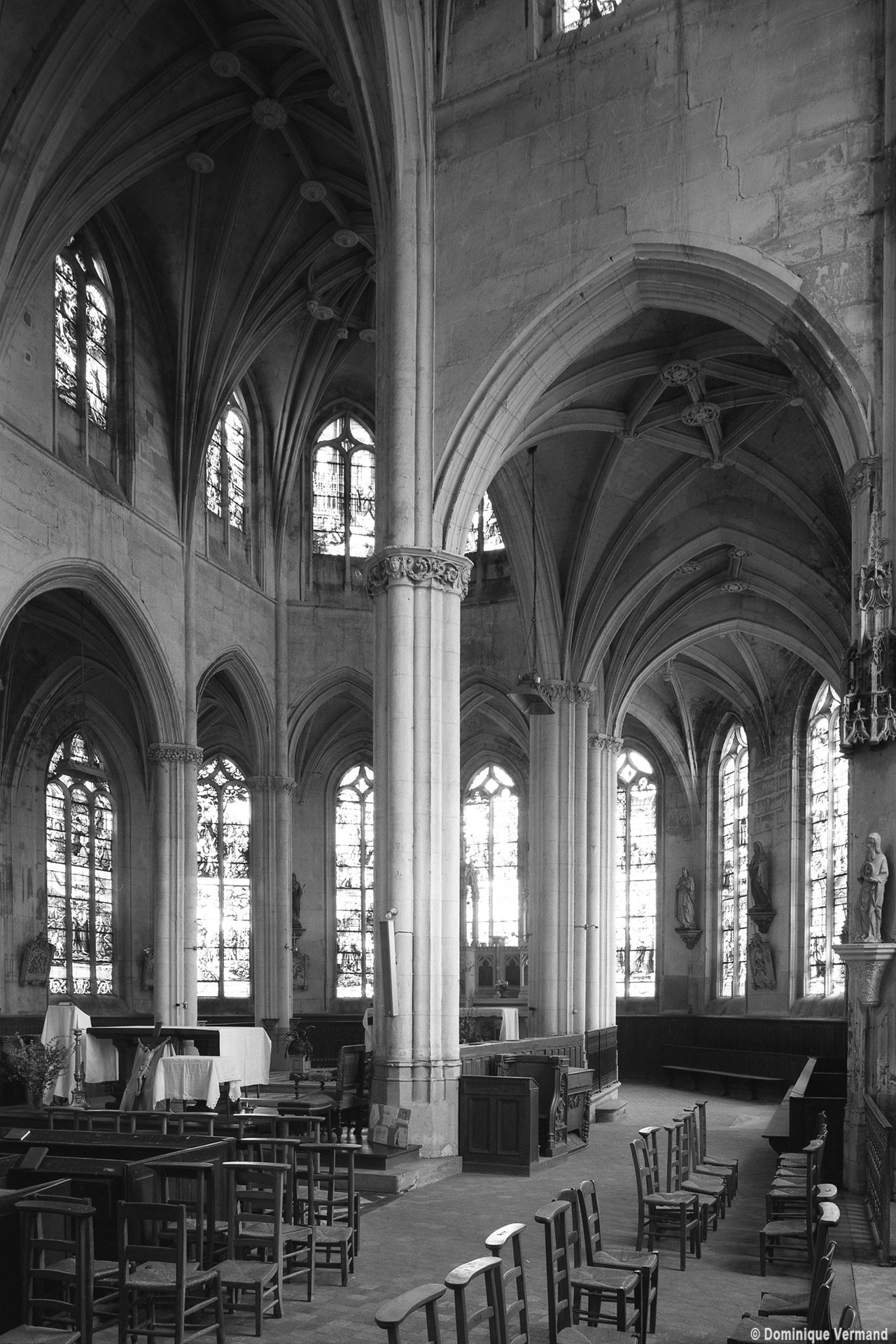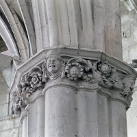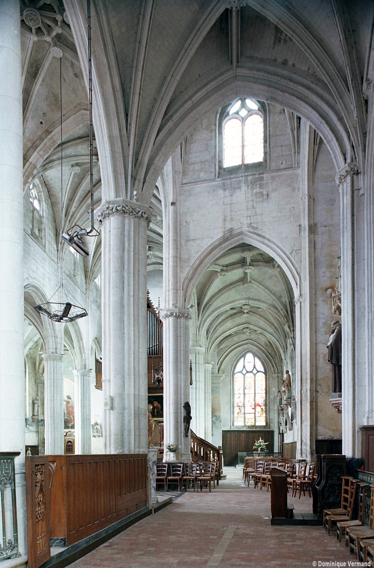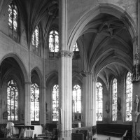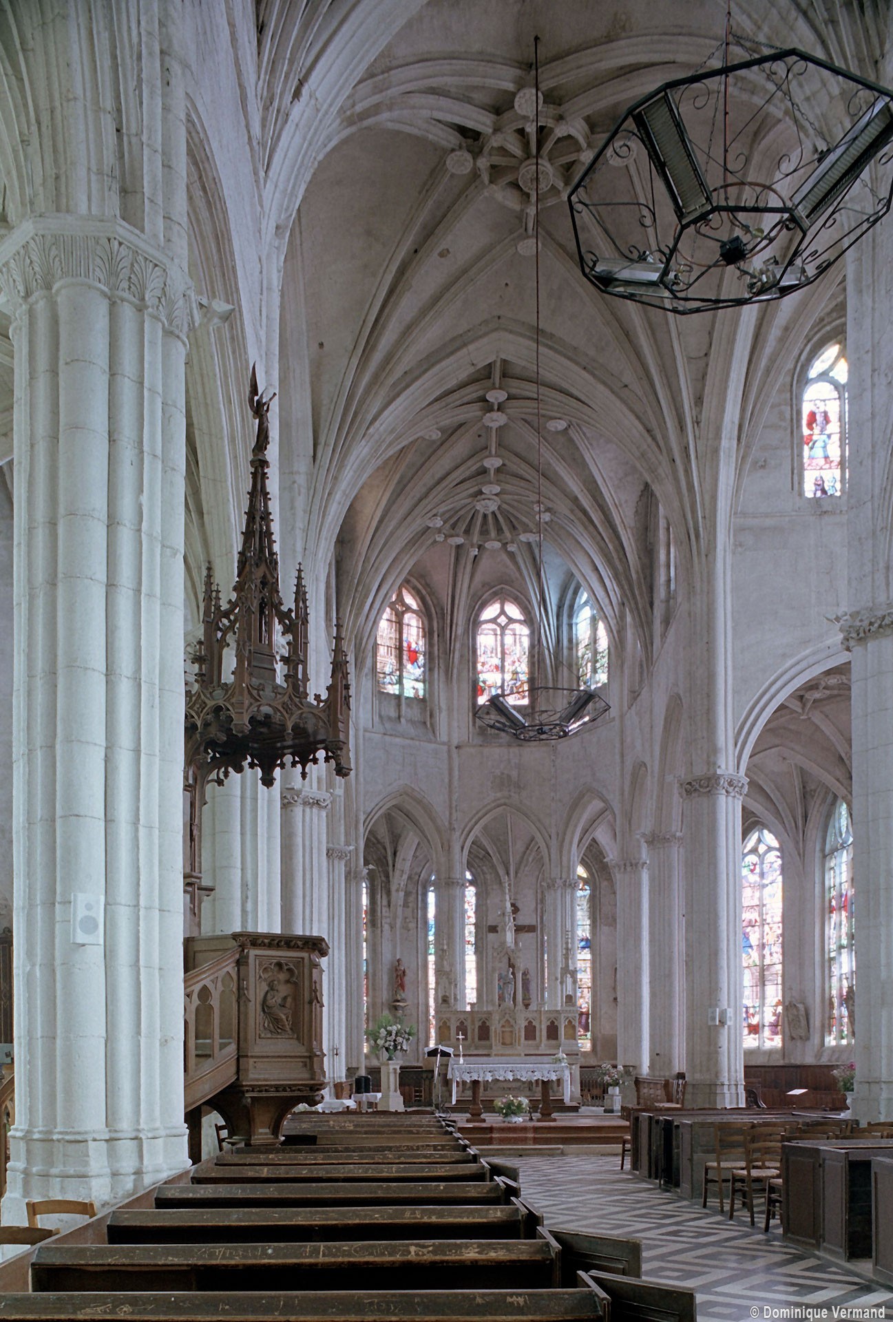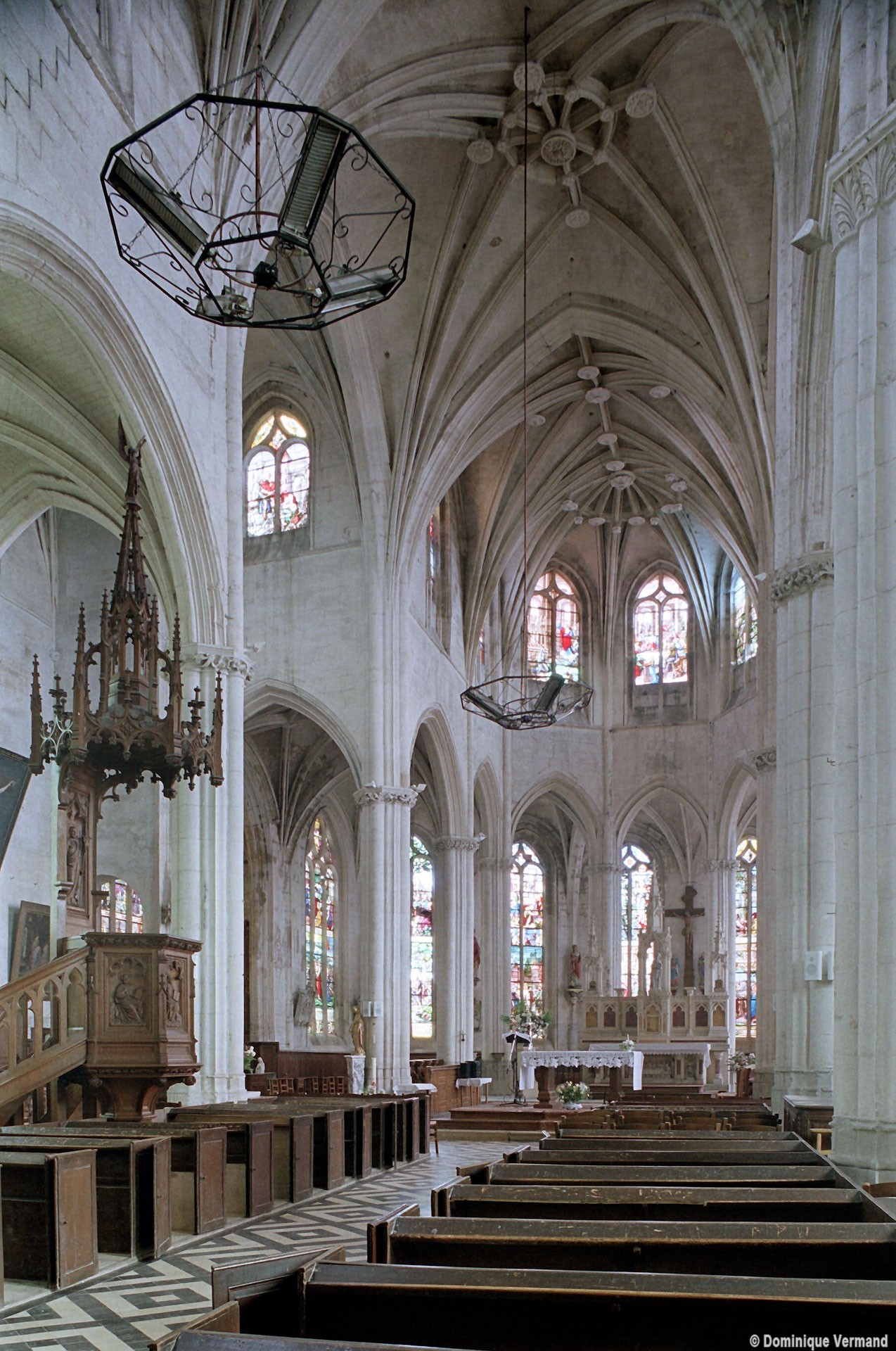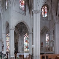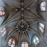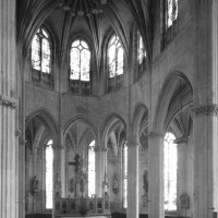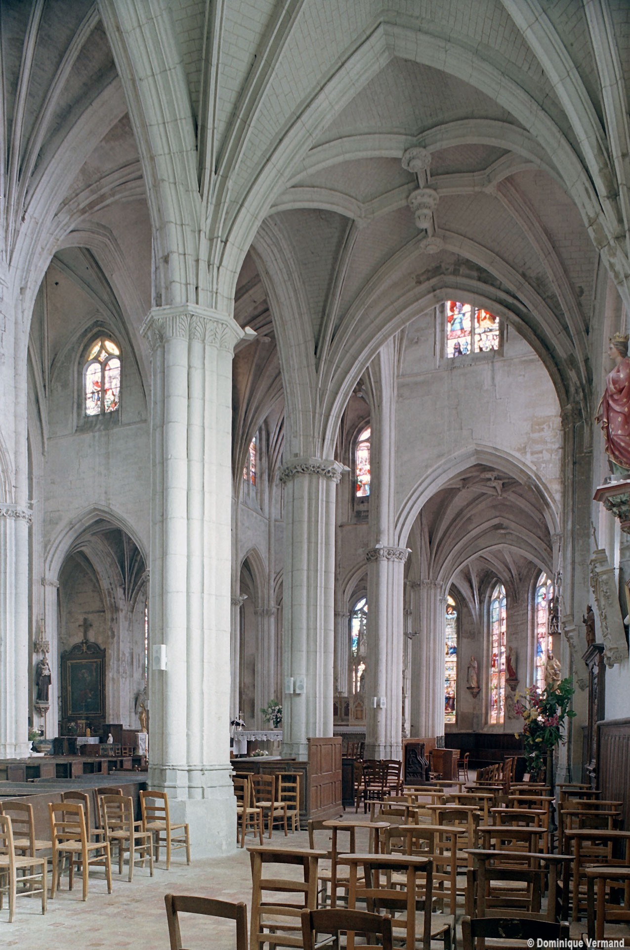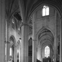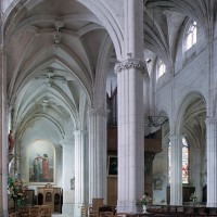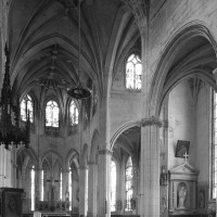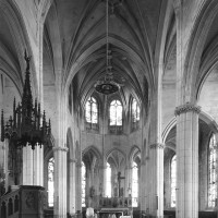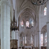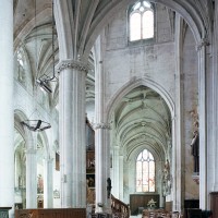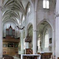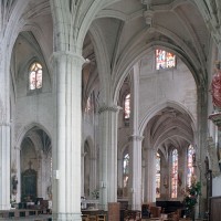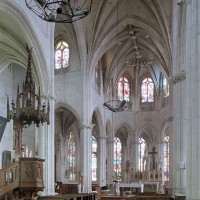 A l’intérieur, l’église est remarquable par son espace très ouvert, totalement unifié, grâce à des arcades larges et hautes (elles représentent près des deux tiers de l’élévation totale), retombant sur des piles minces : bas-côtés et déambulatoire sont ainsi visuellement annexés au vaisseau central. La structure de l’édifice se réclame encore de l’architecture gothique des 13ème et 14ème siècles, notamment dans les piles, composées de nombreuses colonnes et colonnettes et couronnées de chapiteaux formant frise, au décor de rinceaux de feuillages parfois mélangés de masques ou de têtes d’anges. Le dessin des voûtes, avec liernes et tiercerons (associés à la croisée d’ogives dans le vaisseau central ; utilisés seuls dans les bas-côtés et le déambulatoire), leur profil prismatique et le réseau des fenêtres sont bien la marque, en revanche, de l’architecture gothique tardive.