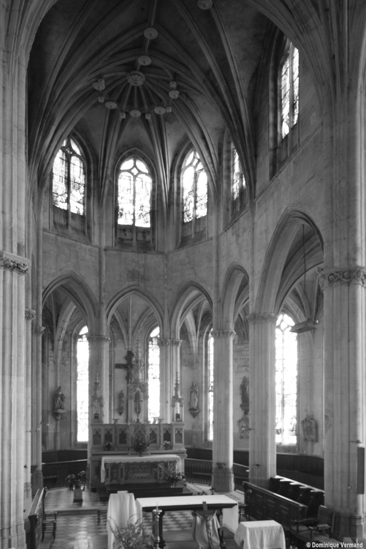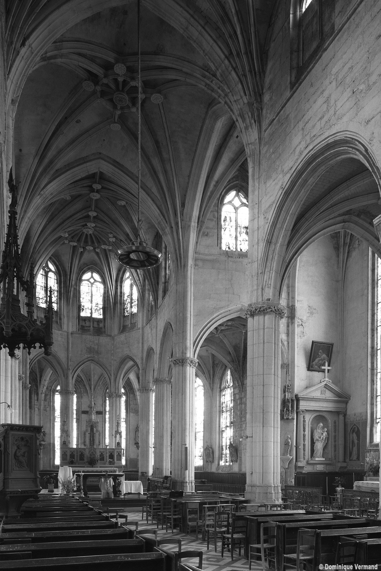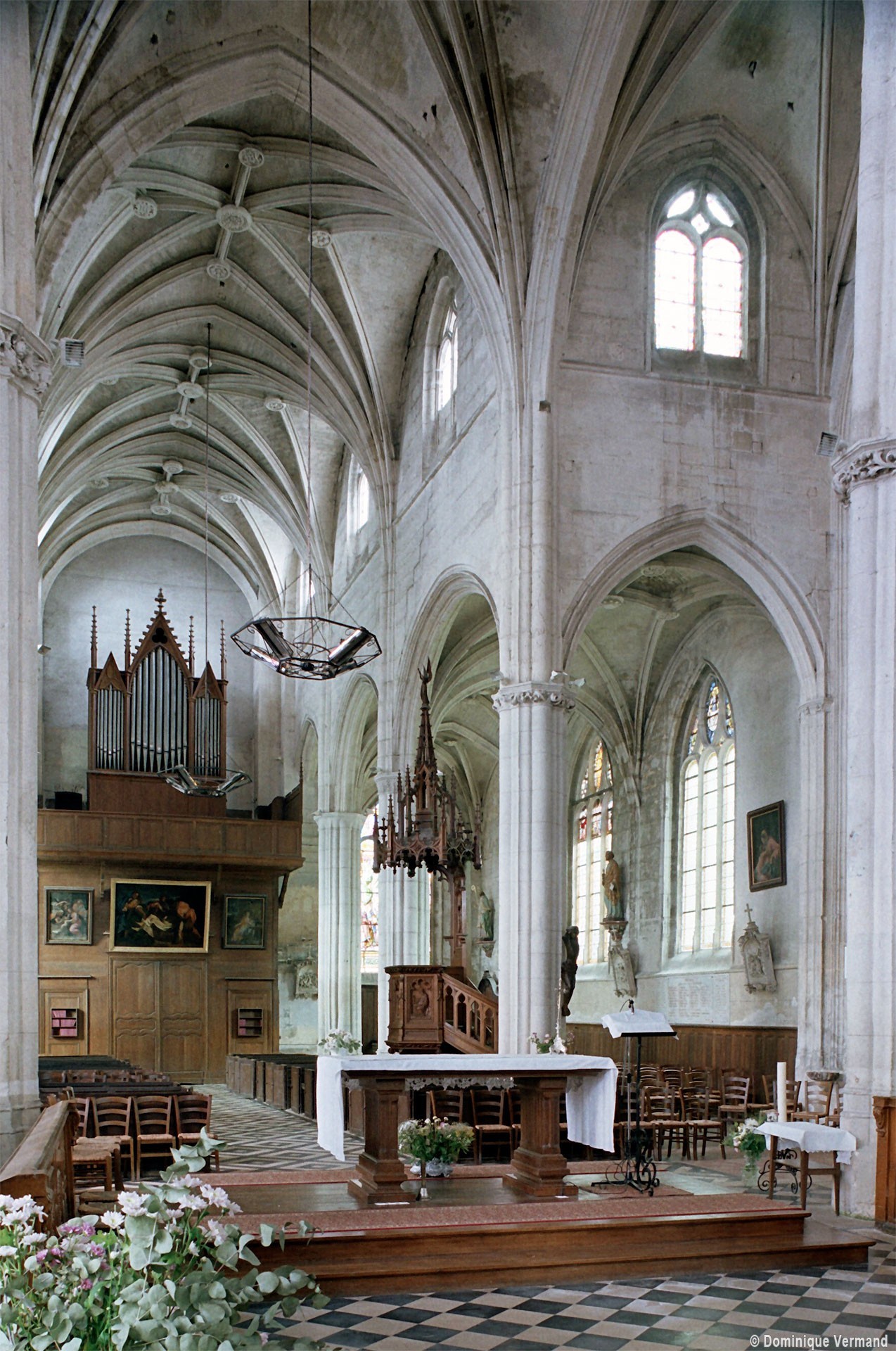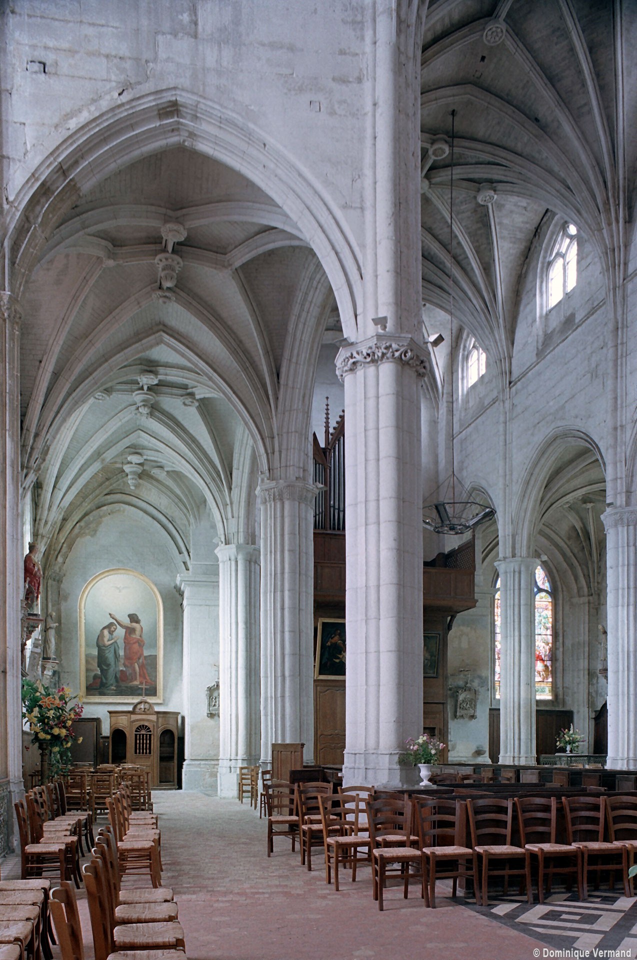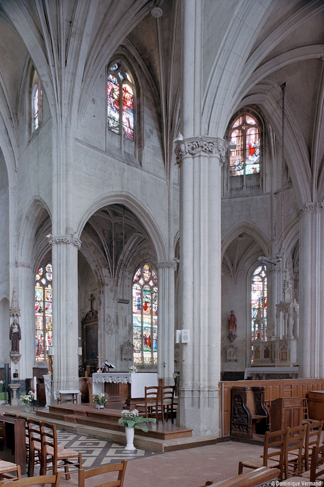 A l’intérieur, l’église est remarquable par son espace très ouvert, totalement unifié, grâce à des arcades larges et hautes (elles représentent près des deux tiers de l’élévation totale), retombant sur des piles minces : bas-côtés et déambulatoire sont ainsi visuellement annexés au vaisseau central. La structure de l’édifice se réclame encore de l’architecture gothique des 13ème et 14ème siècles, notamment dans les piles, composées de nombreuses colonnes et colonnettes et couronnées de chapiteaux formant frise, au décor de rinceaux de feuillages parfois mélangés de masques ou de têtes d’anges. Le dessin des voûtes, avec liernes et tiercerons (associés à la croisée d’ogives dans le vaisseau central ; utilisés seuls dans les bas-côtés et le déambulatoire), leur profil prismatique et le réseau des fenêtres sont bien la marque, en revanche, de l’architecture gothique tardive.