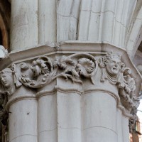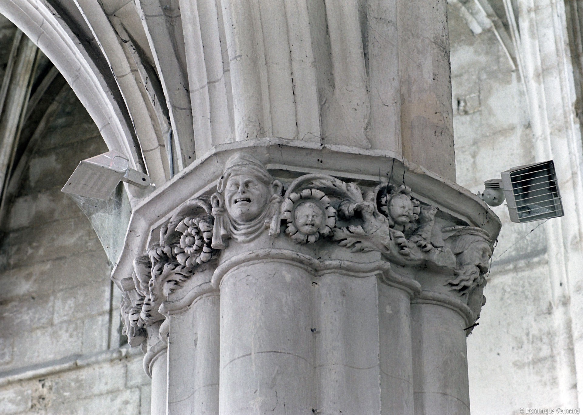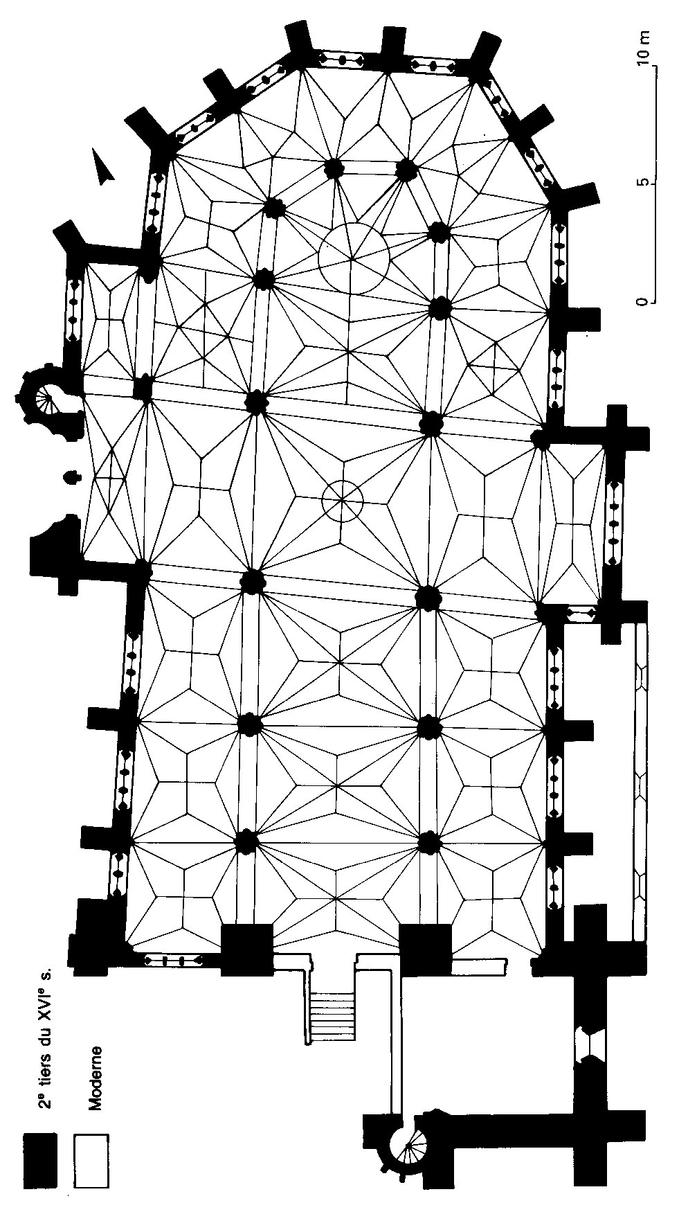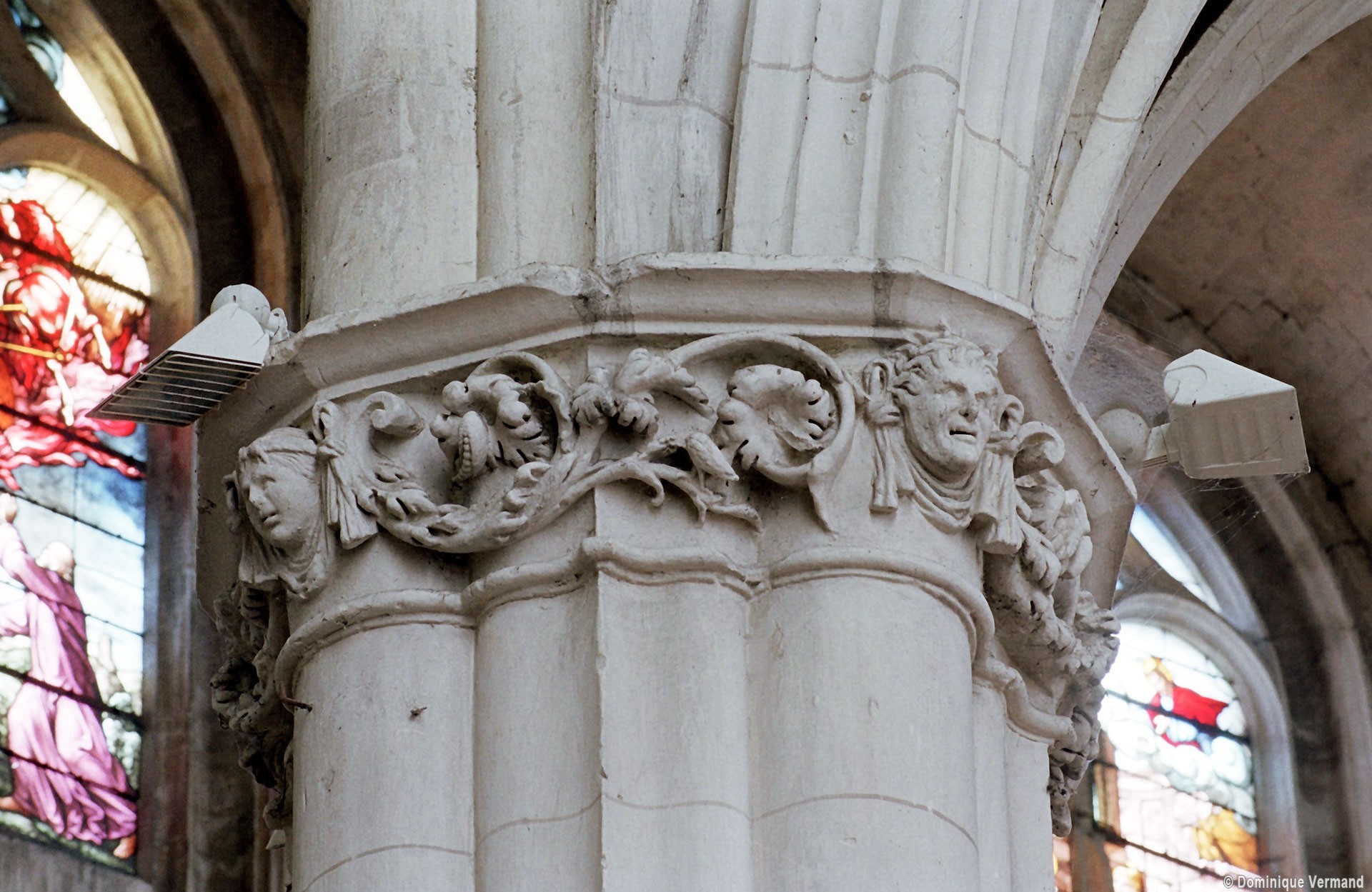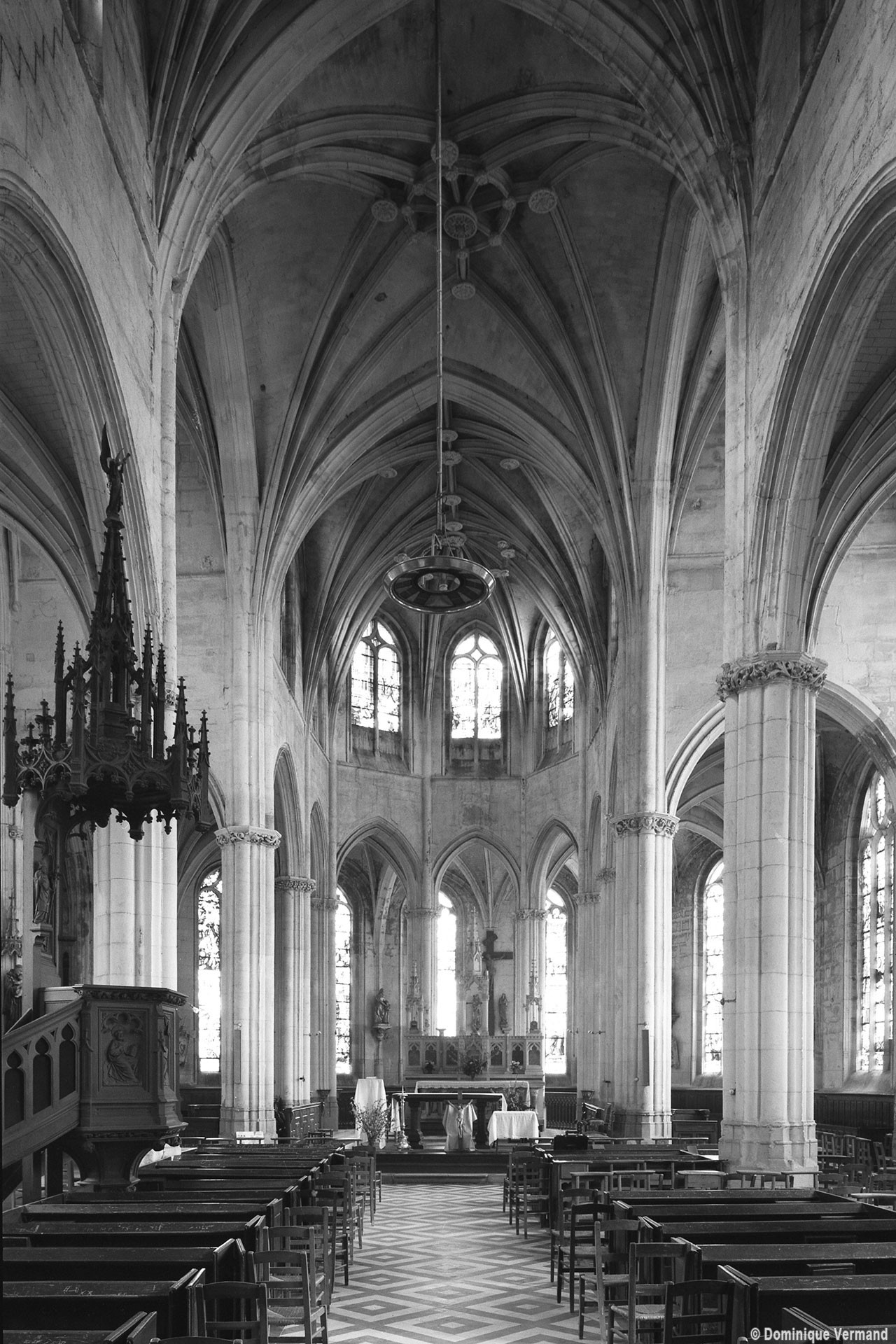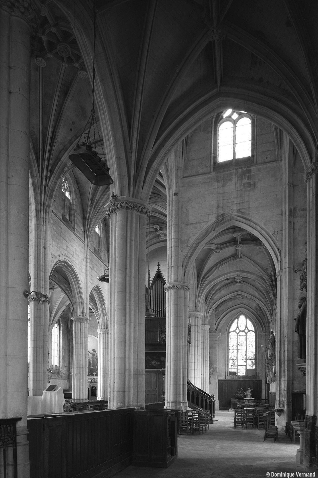 A l’intérieur, l’église est remarquable par son espace très ouvert, totalement unifié, grâce à des arcades larges et hautes (elles représentent près des deux tiers de l’élévation totale), retombant sur des piles minces : bas-côtés et déambulatoire sont ainsi visuellement annexés au vaisseau central. La structure de l’édifice se réclame encore de l’architecture gothique des 13ème et 14ème siècles, notamment dans les piles, composées de nombreuses colonnes et colonnettes et couronnées de chapiteaux formant frise, au décor de rinceaux de feuillages parfois mélangés de masques ou de têtes d’anges. Le dessin des voûtes, avec liernes et tiercerons (associés à la croisée d’ogives dans le vaisseau central ; utilisés seuls dans les bas-côtés et le déambulatoire), leur profil prismatique et le réseau des fenêtres sont bien la marque, en revanche, de l’architecture gothique tardive.