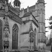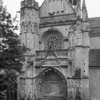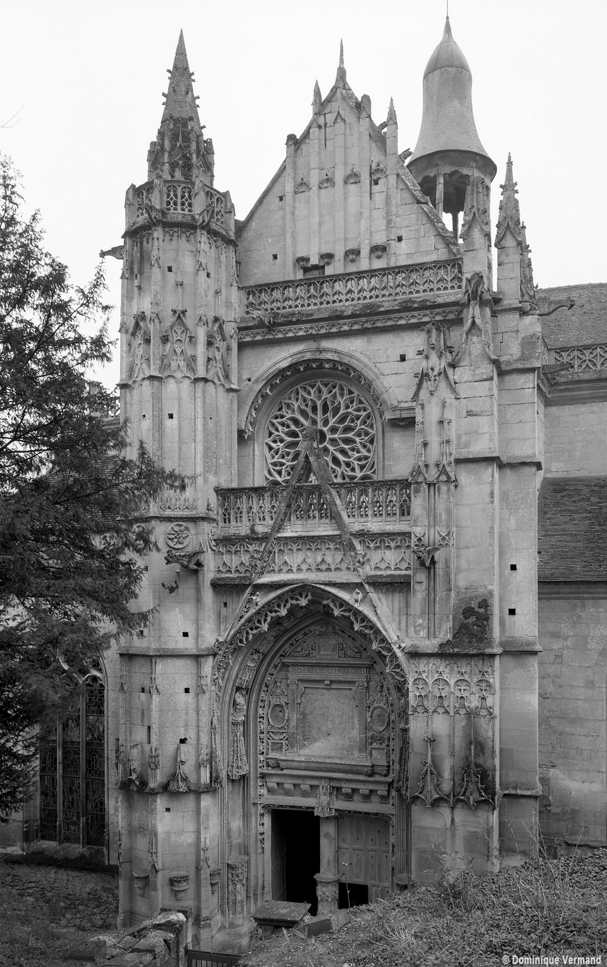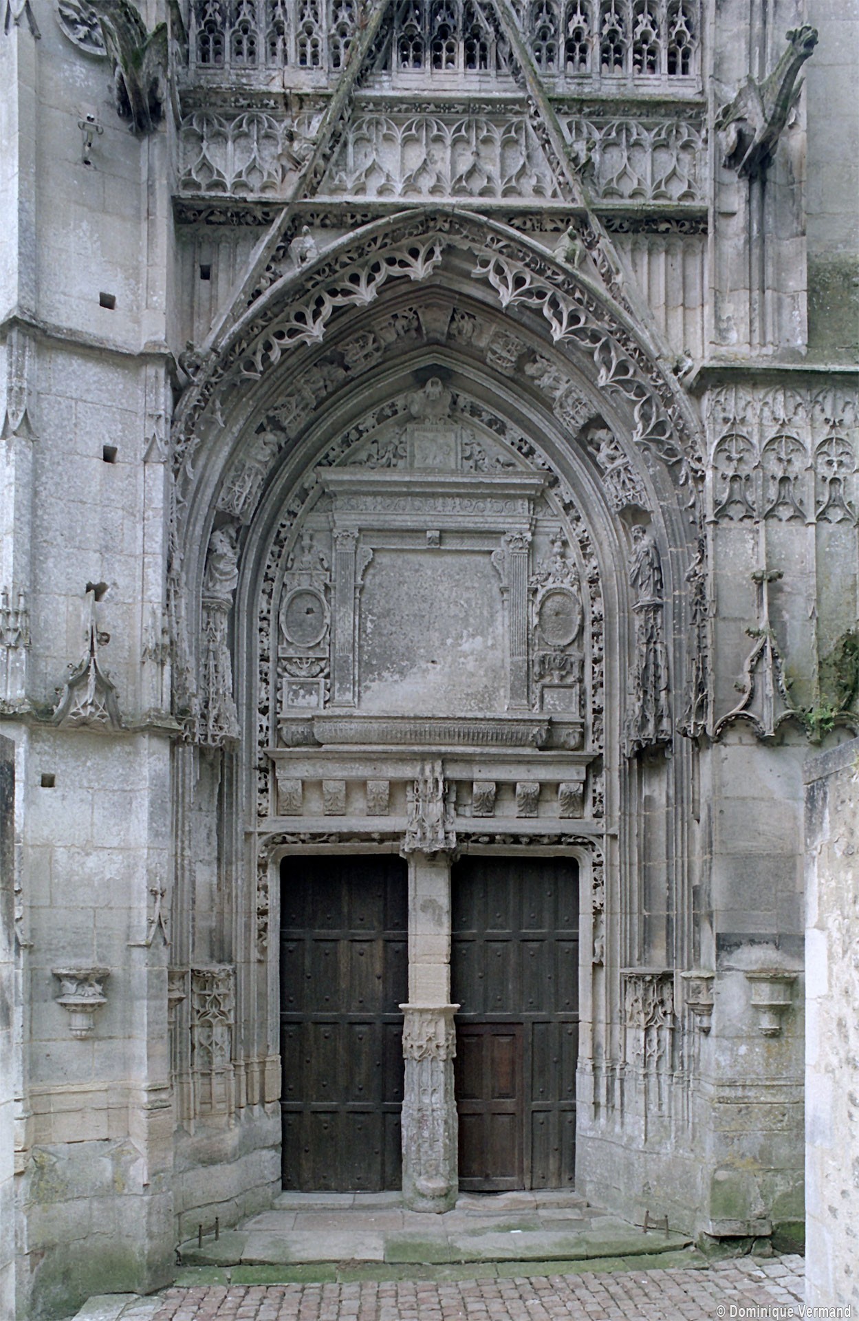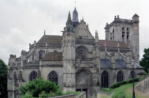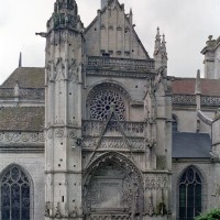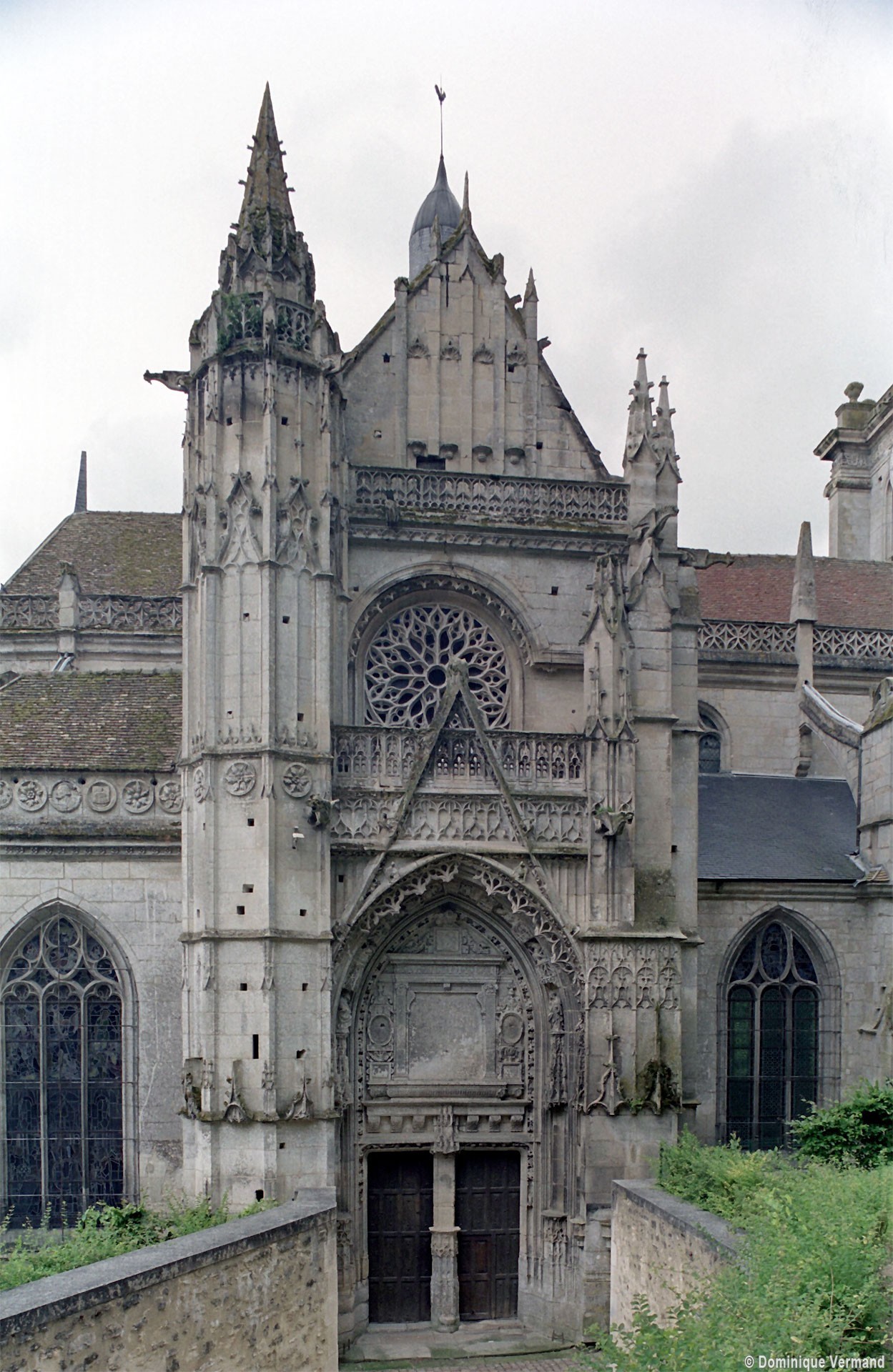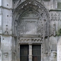 A l’extérieur, l’attention se portera sur la façade nord du transept, magnifique composition flamboyante dont les similitudes avec celle de Gisors, due à Robert Grappin, ont maintes fois été notées. Flanquée à l’angle oriental d’une importante tourelle d’escalier au riche décor, la façade superpose un important portail couronné d’un gâble, une rose et un mur pignon autrefois décoré de statues. Deux balustrades richement ouvragées séparent les étages. Le tympan du portail vient curieusement apporter une touche Renaissance au milieu de ce foisonnant décor gothique, totalement abandonné à la tour occidentale, plus tardive et qui se réclame totalement du vocabulaire ornemental de la Renaissance.