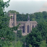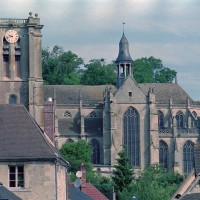 D’une belle ampleur, le plan de l’édifice comprend un chœur de tracé polygonal avec bas-côtés et déambulatoire, un transept saillant et une courte nef de trois travées, avec bas-côtés. Plusieurs particularités méritent d’être notées, toutes dues au caractère contraignant du site : un terrain exiguë et en forte pente. C’est d’abord l’absence, peu courante, de chapelles rayonnantes autour du déambulatoire ; c’est ensuite l’ouverture de l’entrée principale de l’église dans la façade du bras nord du transept, face à la colline et à l’accès qui conduit au château ; c’est enfin le fort désaxement d’un plan où l’axe longitudinal et celui du transept ne sont pas perpendiculaires.