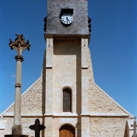 Le revers de la façade est épaulé par deux puissants contreforts, dédoublés à l’extérieur. Dépassant nettement le faîte de la toiture, l’ensemble sert de socle à un petit clocher en charpente couvert d’ardoises. Construit dans l’esprit des clocher-arcades, c’est un dispositif qui a le mérite d’allier originalité et économie. Devant la façade, un beau calvaire du 16ème siècle dont l’original a été déposé à l’intérieur de l’église représente sur ses deux faces une Vierge à l’Enfant et un Christ en croix (2004).