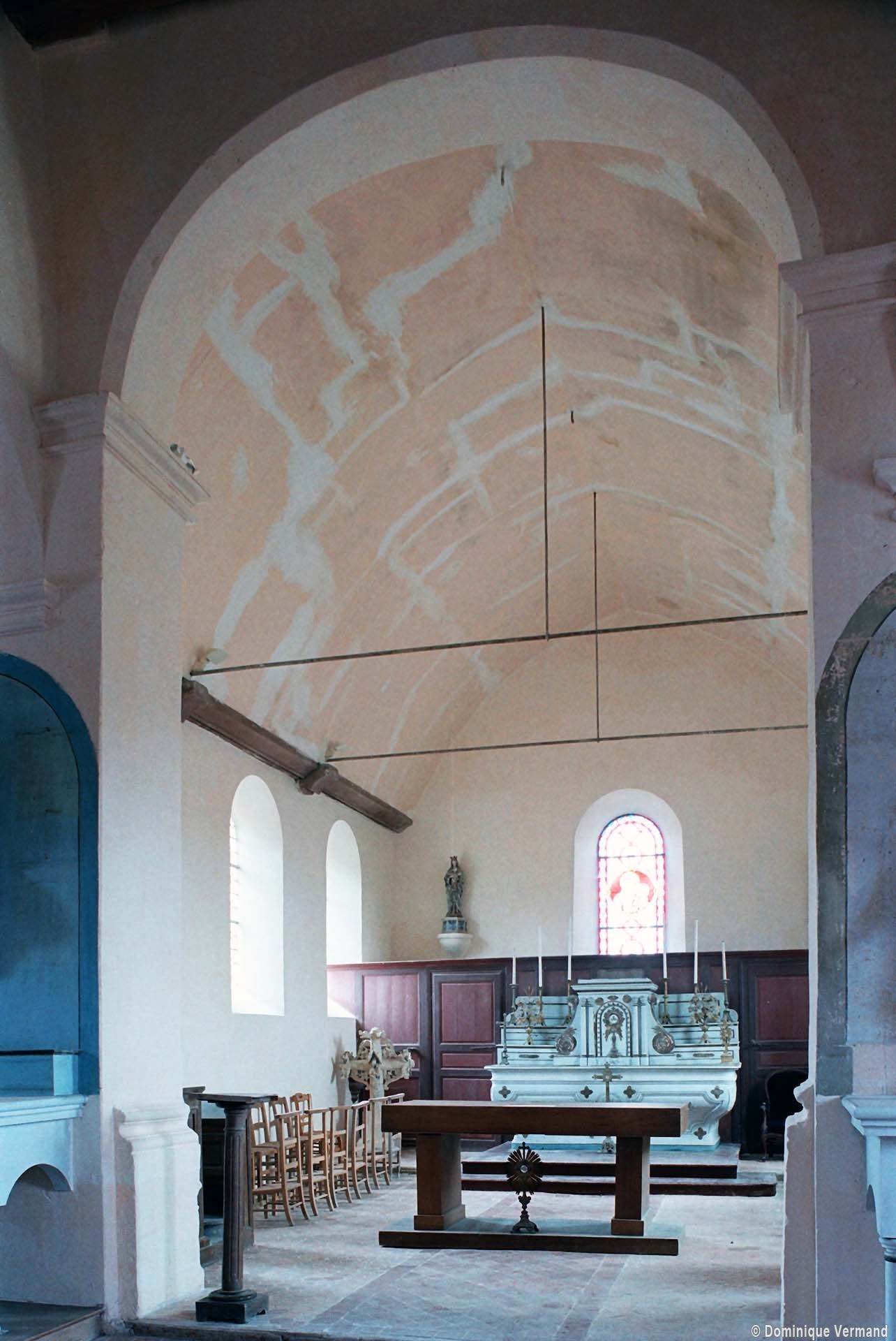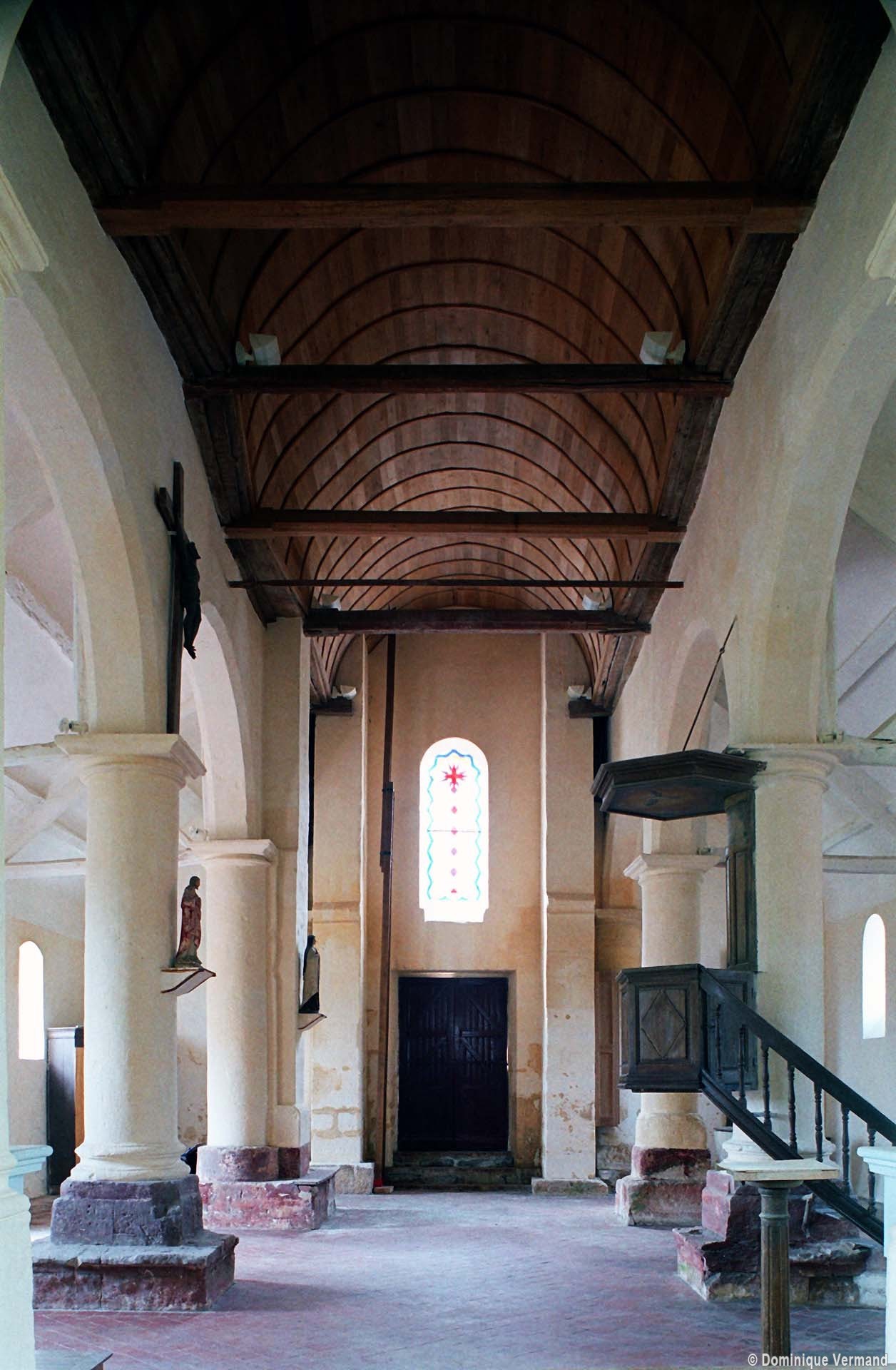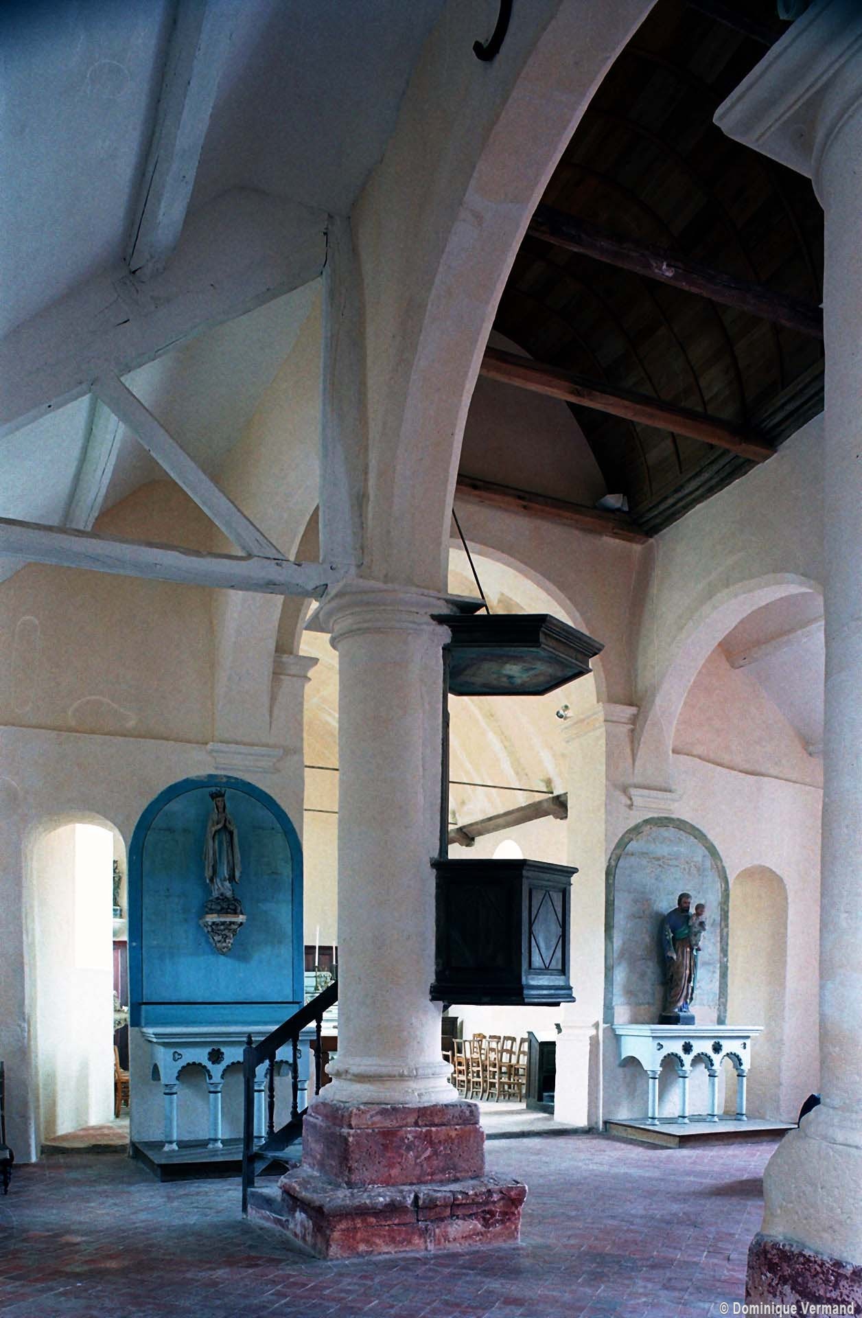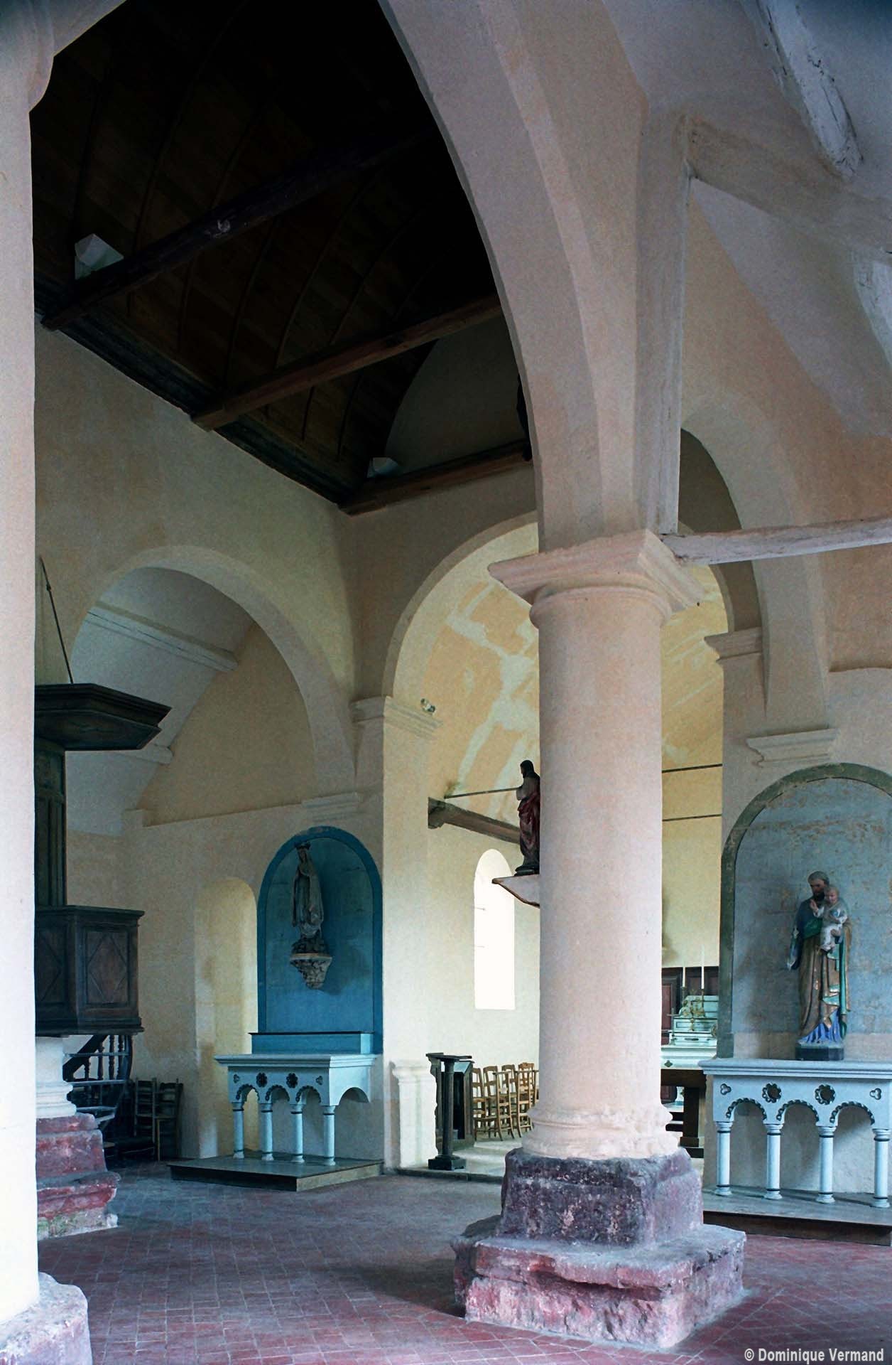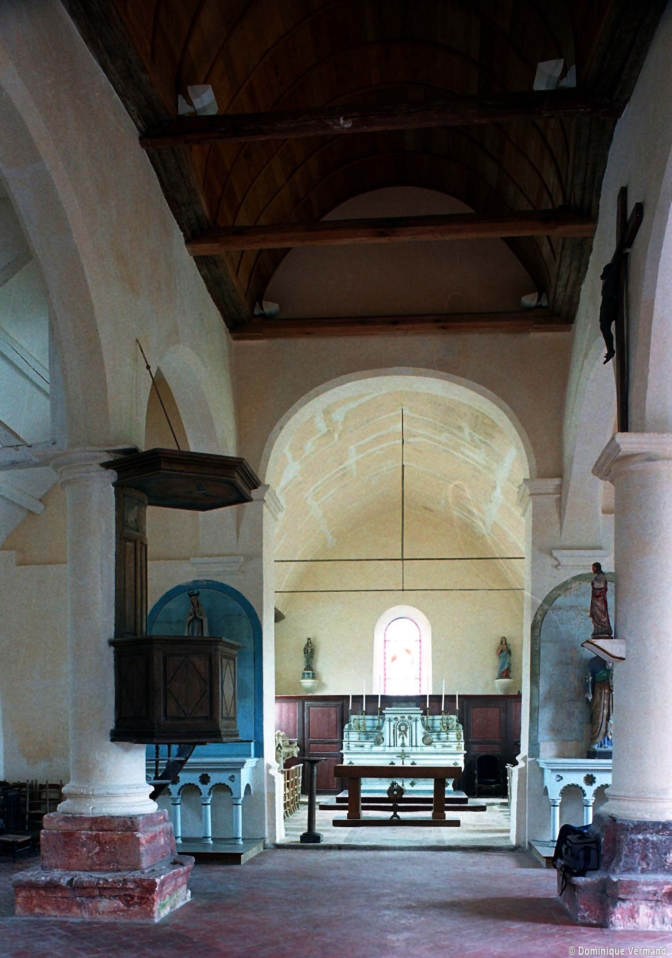 L’édifice comporte une nef de trois travées, avec bas-côtés, et un chœur à chevet plat dont les murs latéraux sont, sur la première moitié de leur longueur, disposés en biais afin de permettre une communication directe avec les bas-côtés. Le chevet est la partie la plus ancienne (dernier quart 12ème siècle) comme le prouve une jolie fenêtre dont le tracé est souligné par deux colonnettes avec chapiteaux et une moulure torique. Le reste du chœur ne comporte pas d’éléments permettant sa datation.