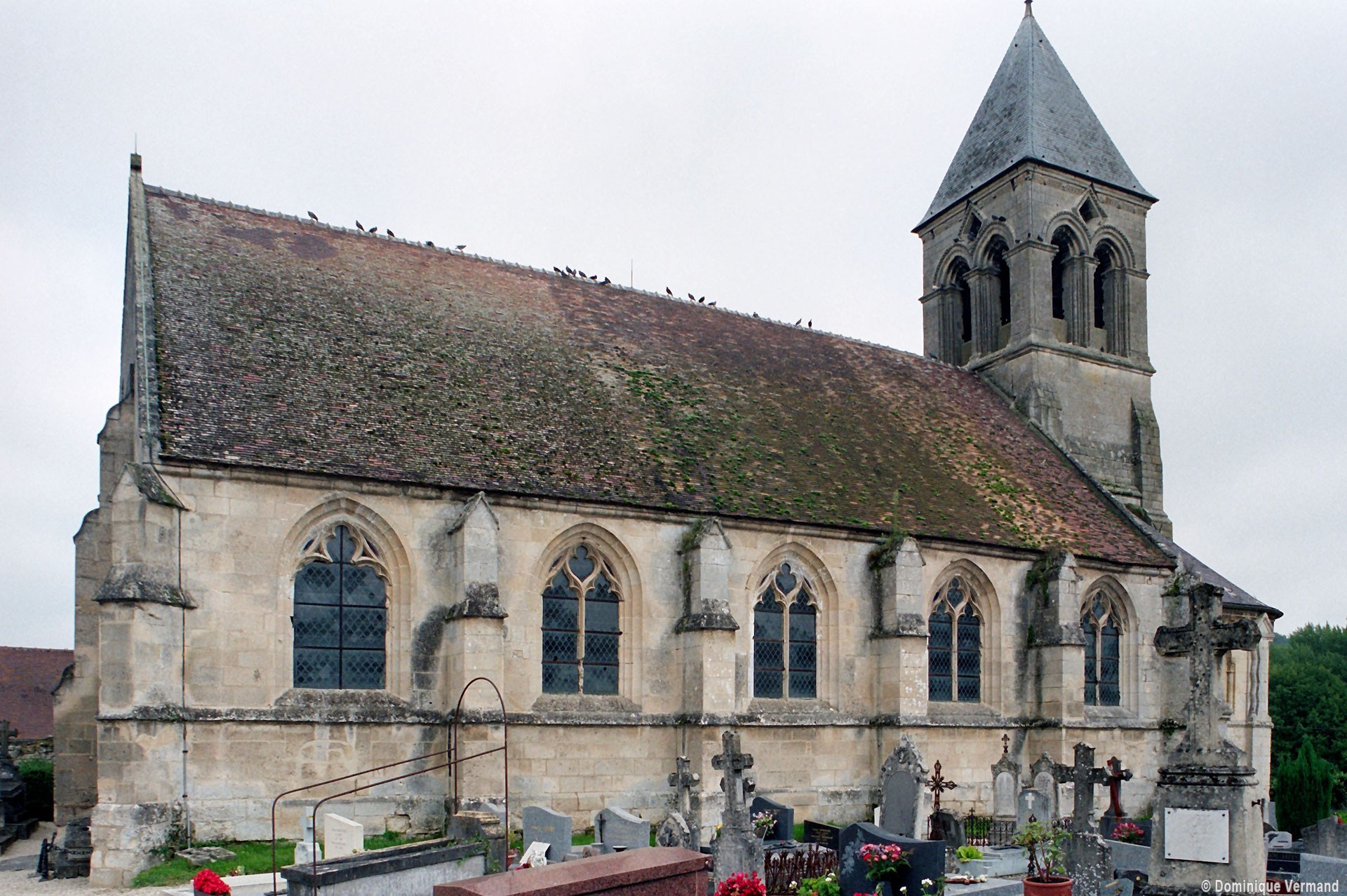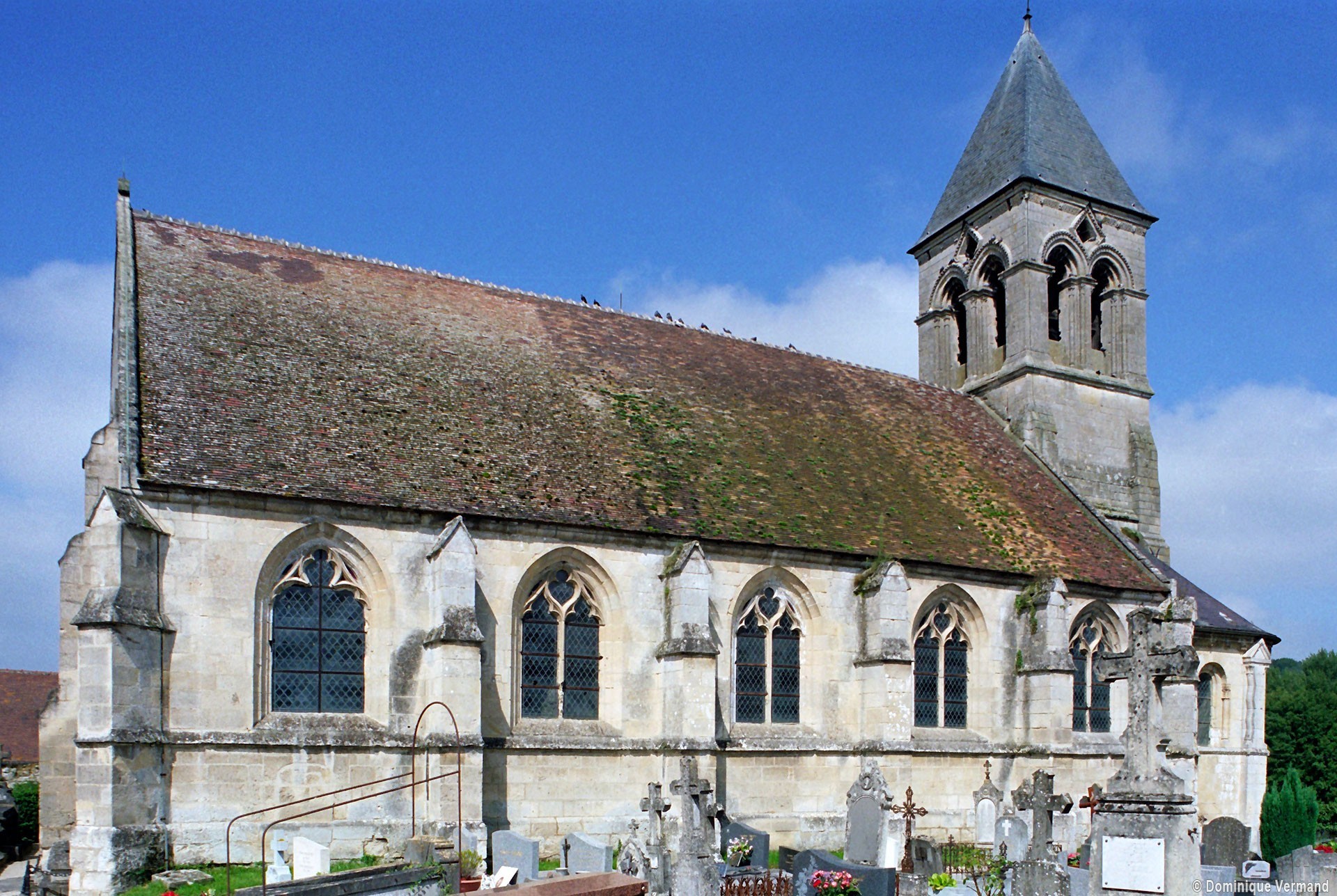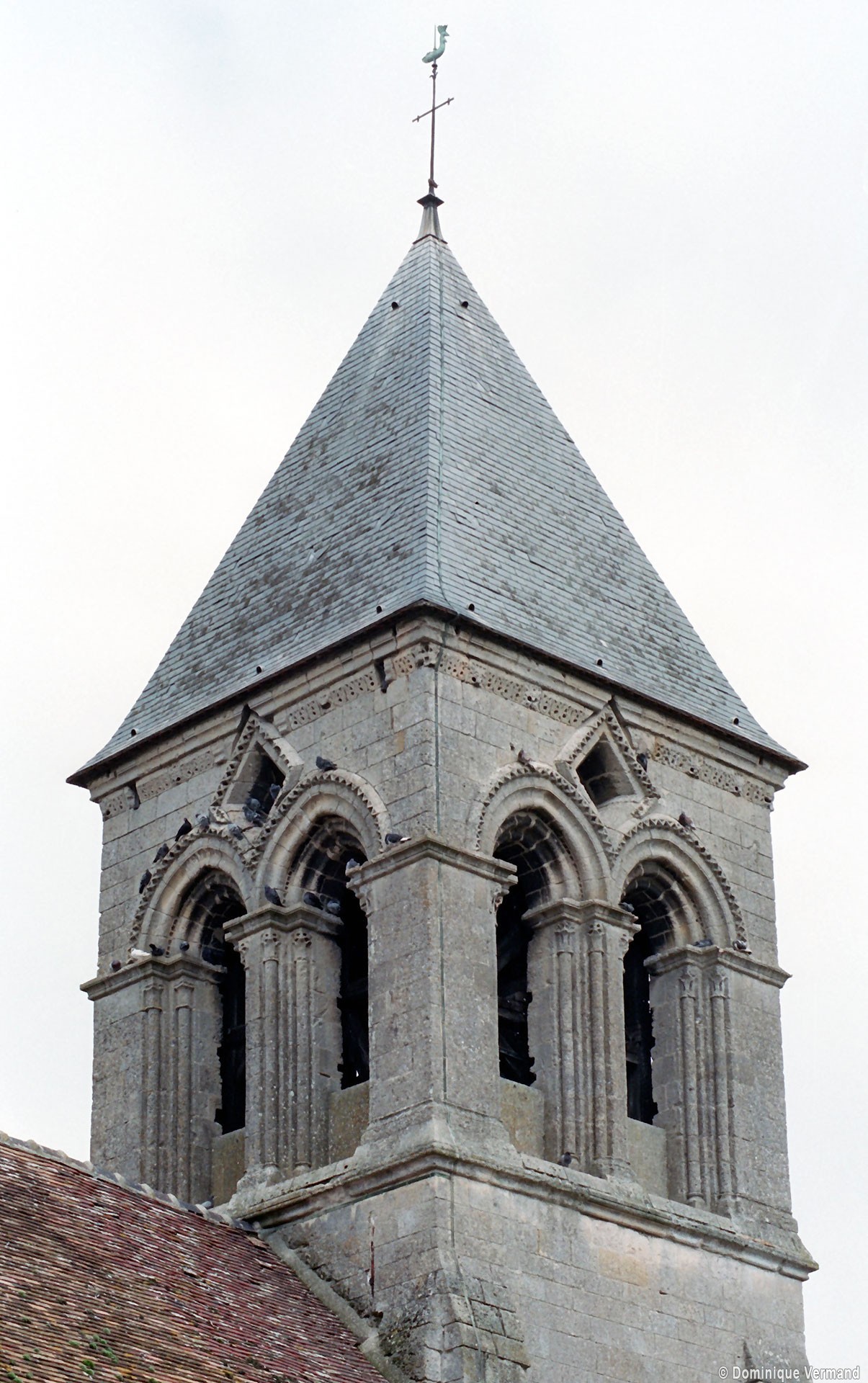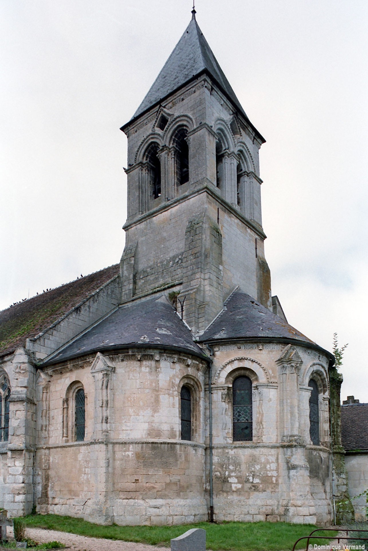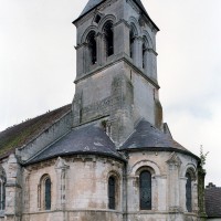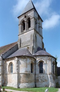 Remarquable par la composition équilibrée de ses volumes, la richesse de son décor et par ailleurs moins touché par les restaurations, l’extérieur est exceptionnel. Contreforts formés de trois colonnettes ou bien flanqués de colonnettes au tracé en zigzag, tous coiffés d’une petite bâtière; fenêtres encadrées par des colonnettes et dont l’archivolte est soulignée par un cordon d’étoiles; corniche alternant palmettes et masques; curieuses ouvertures losangées à l’intersection des baies géminées qui ajourent chacune des faces du clocher : l’ensemble compose un décor dont l’exubérance est caractéristique de plusieurs édifices du roman tardif des anciens diocèses de Soissons et de Laon.