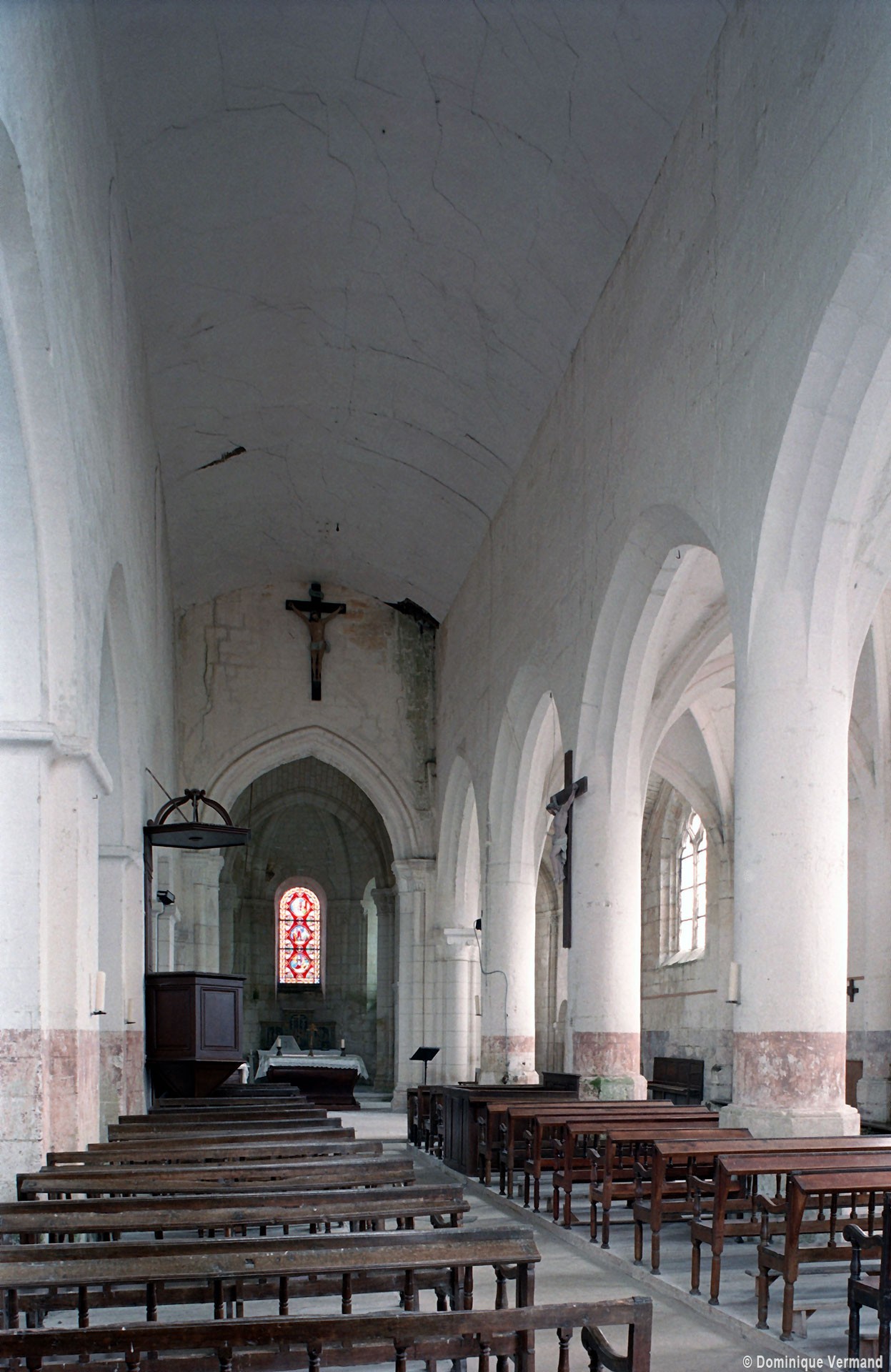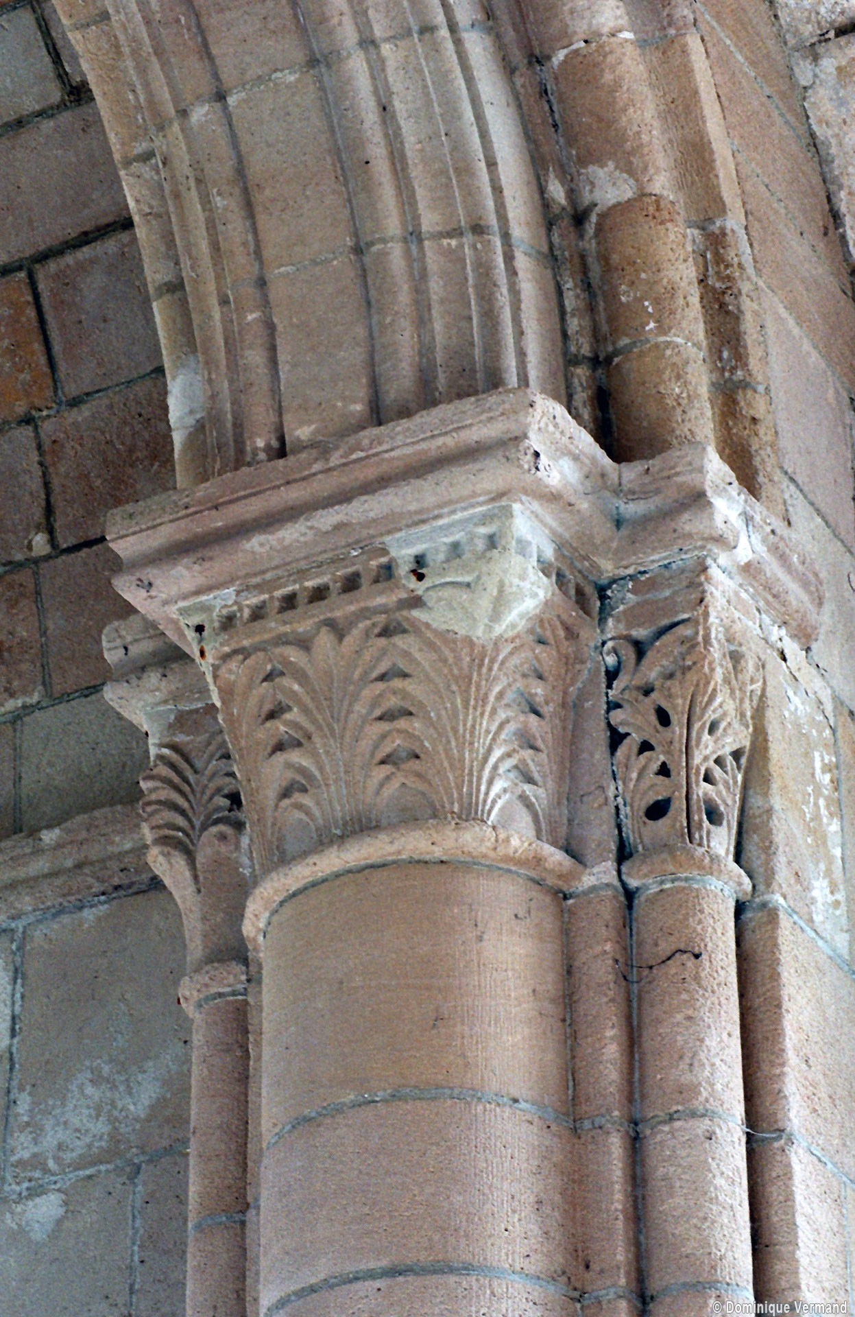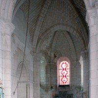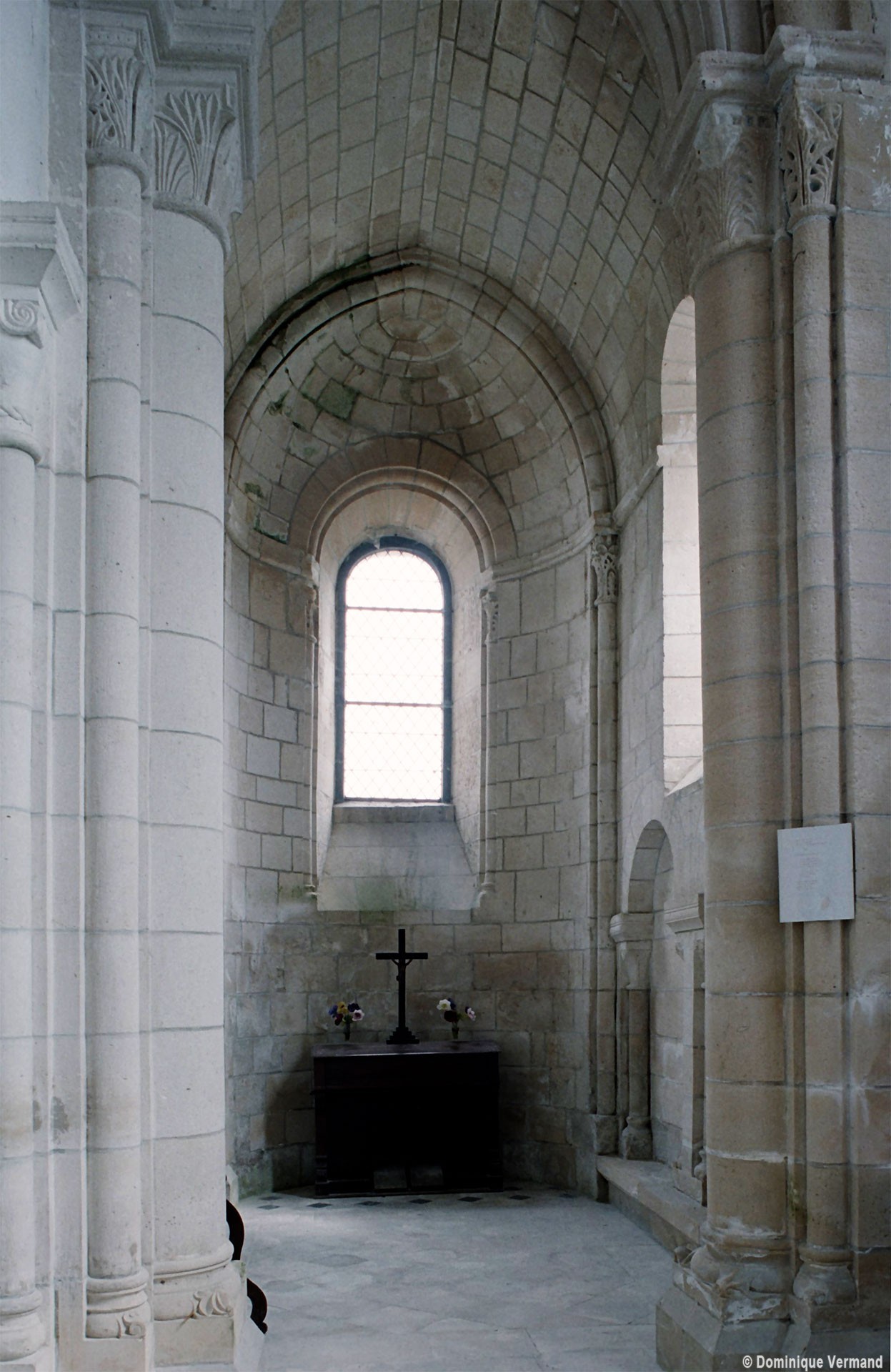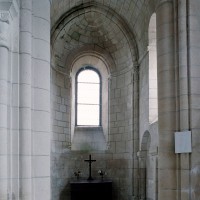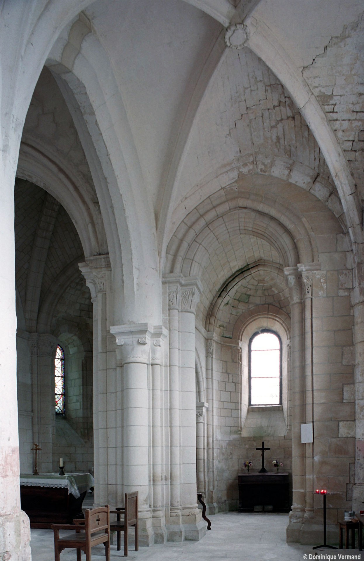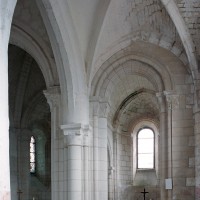 Bien que très restauré au 19ème siècle – tout le soubassement du clocher à été refait, mais à l’identique, et l’absidiole nord a disparu – l’intérieur des parties orientales reste néanmoins remarquable par le soin apporté à la construction, le décor des chapiteaux à feuilles d’acanthe et palmettes et les diverses voûtes utilisées. La chapelle sud (on peut imaginer que celle du nord était identique) comporte ainsi une voûte en berceau brisé sur la travée droite et en cul-de-four sur l’absidiole. La partie centrale reçoit, pour sa part, une voûte d’ogives très bombée sur la travée droite – qui porte le clocher – et un cul-de-four soulagé par deux nervures sur l’abside.