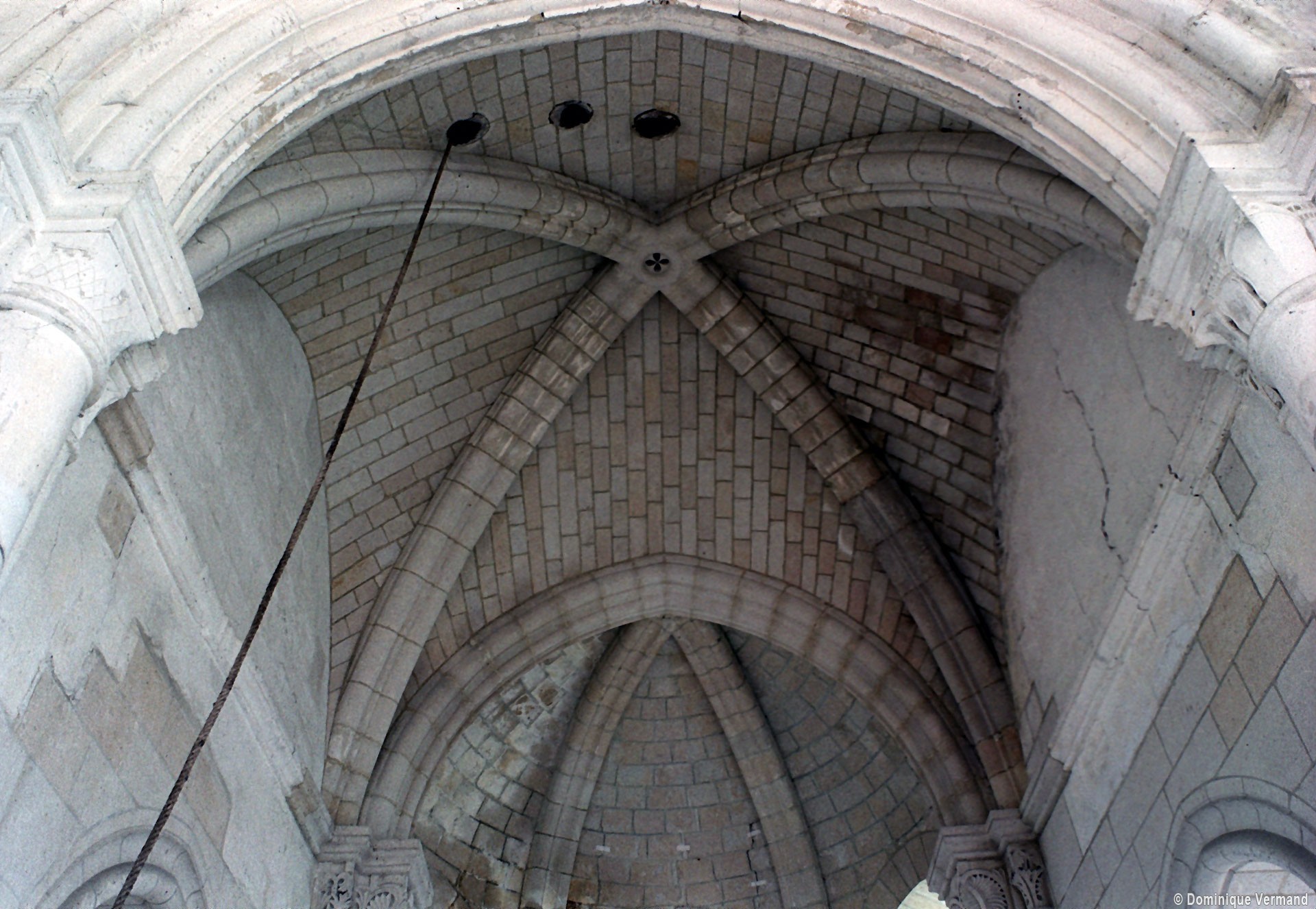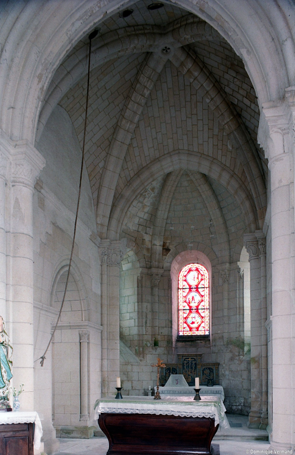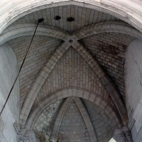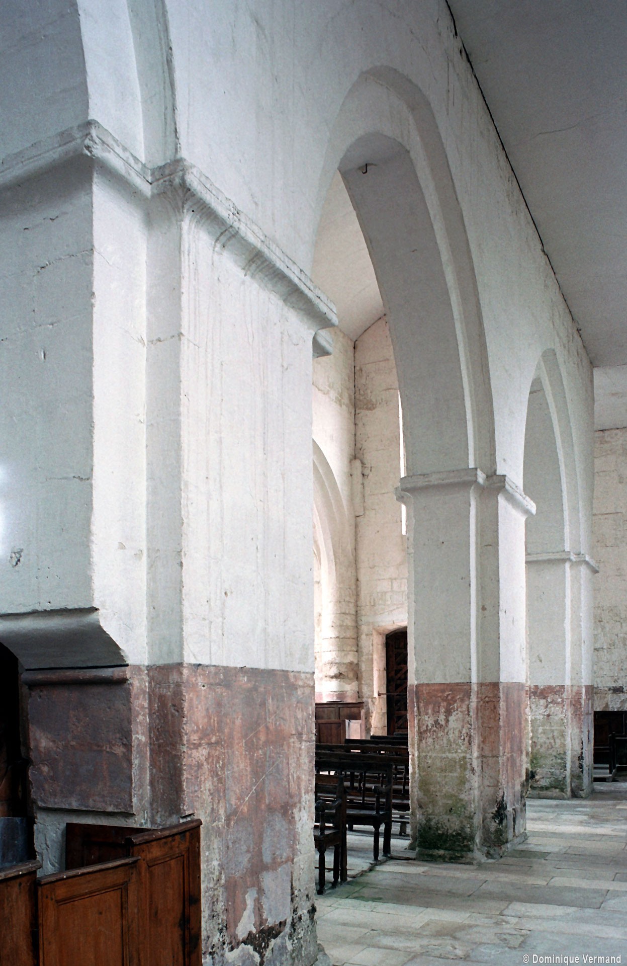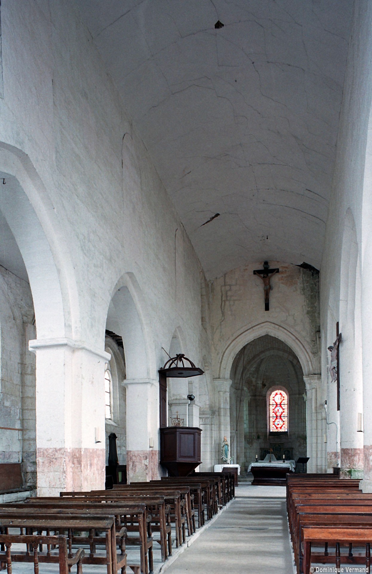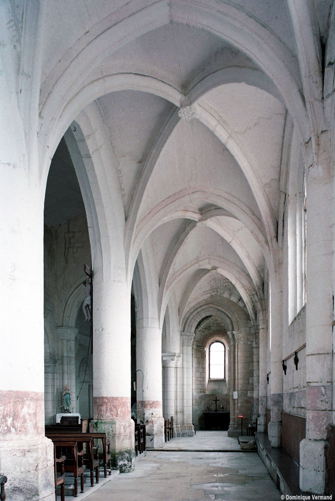 Bien que très restauré au 19ème siècle – tout le soubassement du clocher à été refait, mais à l’identique, et l’absidiole nord a disparu – l’intérieur des parties orientales reste néanmoins remarquable par le soin apporté à la construction, le décor des chapiteaux à feuilles d’acanthe et palmettes et les diverses voûtes utilisées. La chapelle sud (on peut imaginer que celle du nord était identique) comporte ainsi une voûte en berceau brisé sur la travée droite et en cul-de-four sur l’absidiole. La partie centrale reçoit, pour sa part, une voûte d’ogives très bombée sur la travée droite – qui porte le clocher – et un cul-de-four soulagé par deux nervures sur l’abside.