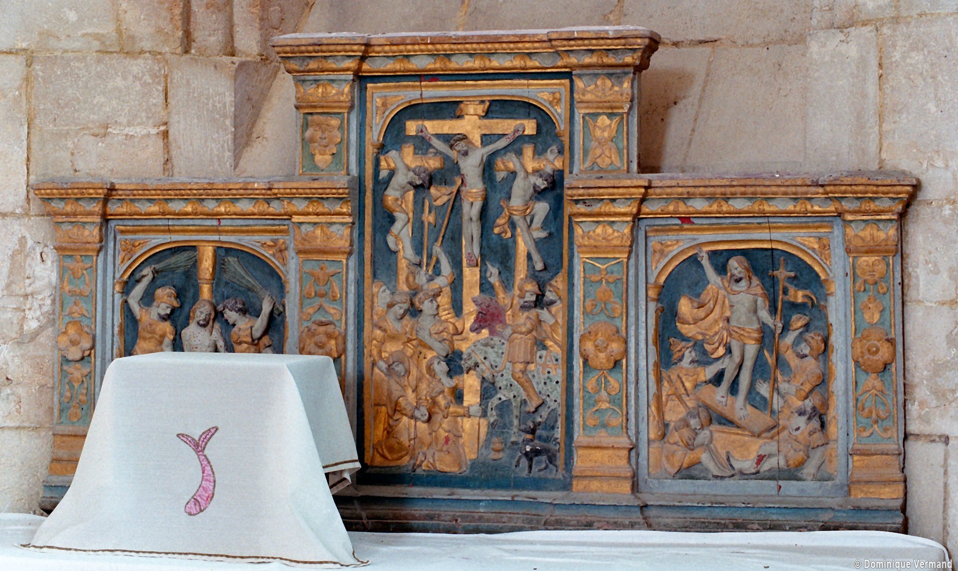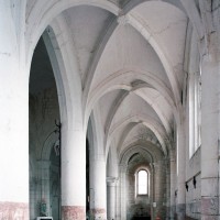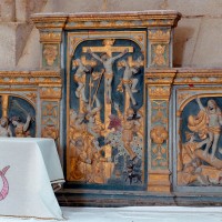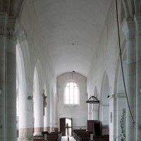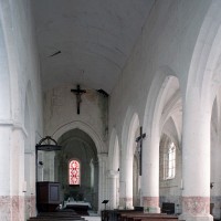 Excepté le mur gouttereau nord, la nef a été totalement reconstruite au 16ème siècle et devait être entièrement voûtée d’ogives, ce qui ne fut réalisé que dans le bas-côté sud. Les grandes arcades à profil prismatique reçues sur des piles circulaires, les nervures des voûtes retombant par pénétration dans les piles, le remplage des fenêtres enfin, tous portent la marque du gothique flamboyant. Légèrement plus tardifs, la façade et le bas-côté nord relèvent du style de la Renaissance, comme le beau retable d’autel illustrant la Passion et la Résurrection du Christ (2009).