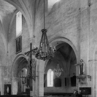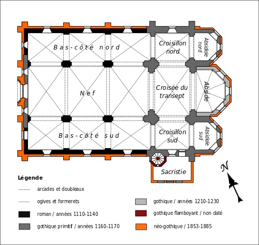L’édifice comprend une nef de trois travées avec bas-côtés, un transept non débordant, qui évoque un transept bas – c’est-à-dire d’une hauteur intermédiaire entre celle de la nef et celle du choeur : il n’y a donc pas de véritable croisée – et un choeur en hémicycle flanqué de deux chapelles de même plan (tous trois présentent des pans coupés à l’extérieur). Le vaisseau central de la nef communique avec les bas-côtés par des arcades en plein cintre à double rouleau reçu sur des piliers cruciformes. L’ensemble était couvert à l’origine d’une simple charpente et les pilastres qui reçoivent aujourd’hui les voûtes servaient autrefois à raidir les deux murs gouttereaux et recevoir les entraits de la charpente.
