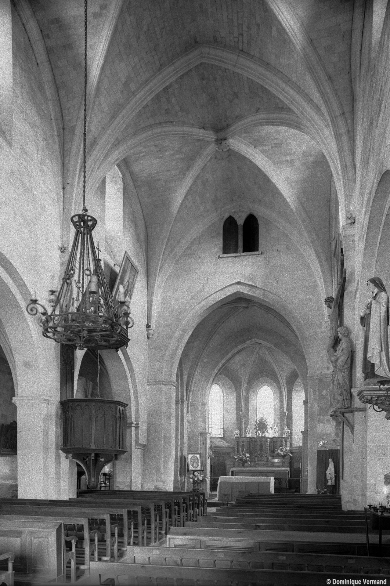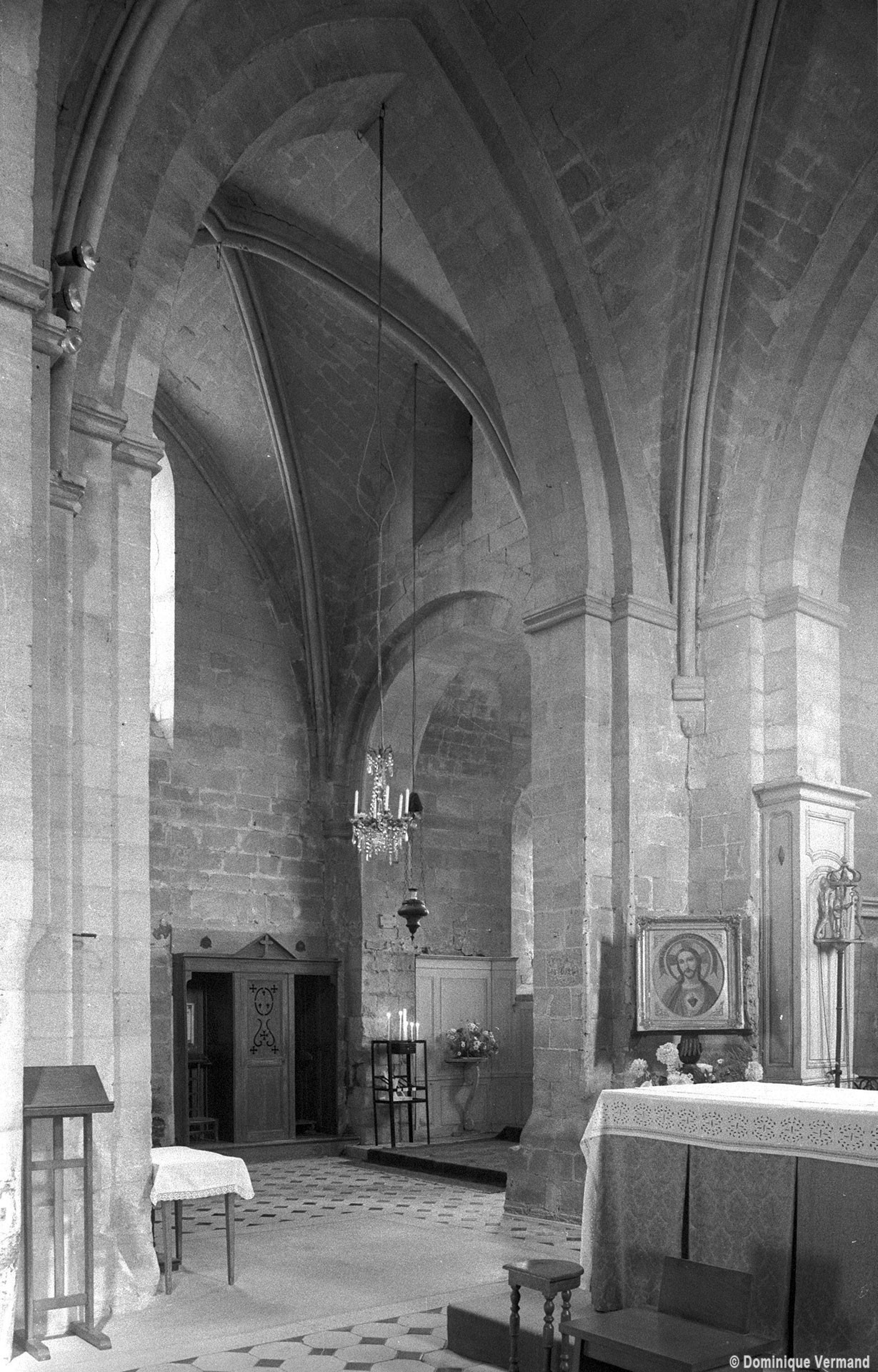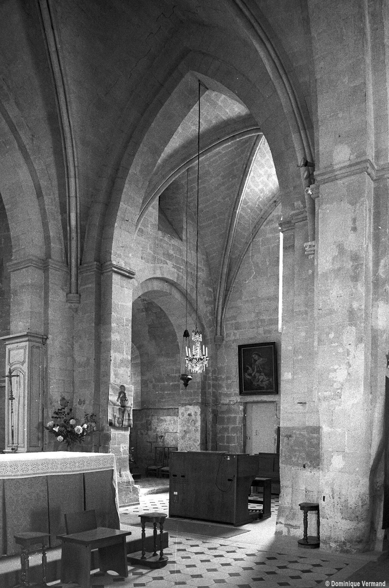 Les parties orientales (transept et choeur) ont, en revanche, été voûtées dès l’origine. Elles associent des voûtes d’ogives (transept et abside centrale) à des voûtes en cul-de-four (chapelles latérales). Dans l’abside centrale, où l’on remarque un beau maître-autel baroque, les ogives retombent sur des colonnettes baguées, un dispositif élégant qui se rencontre fréquemment dans le Soissonnais.