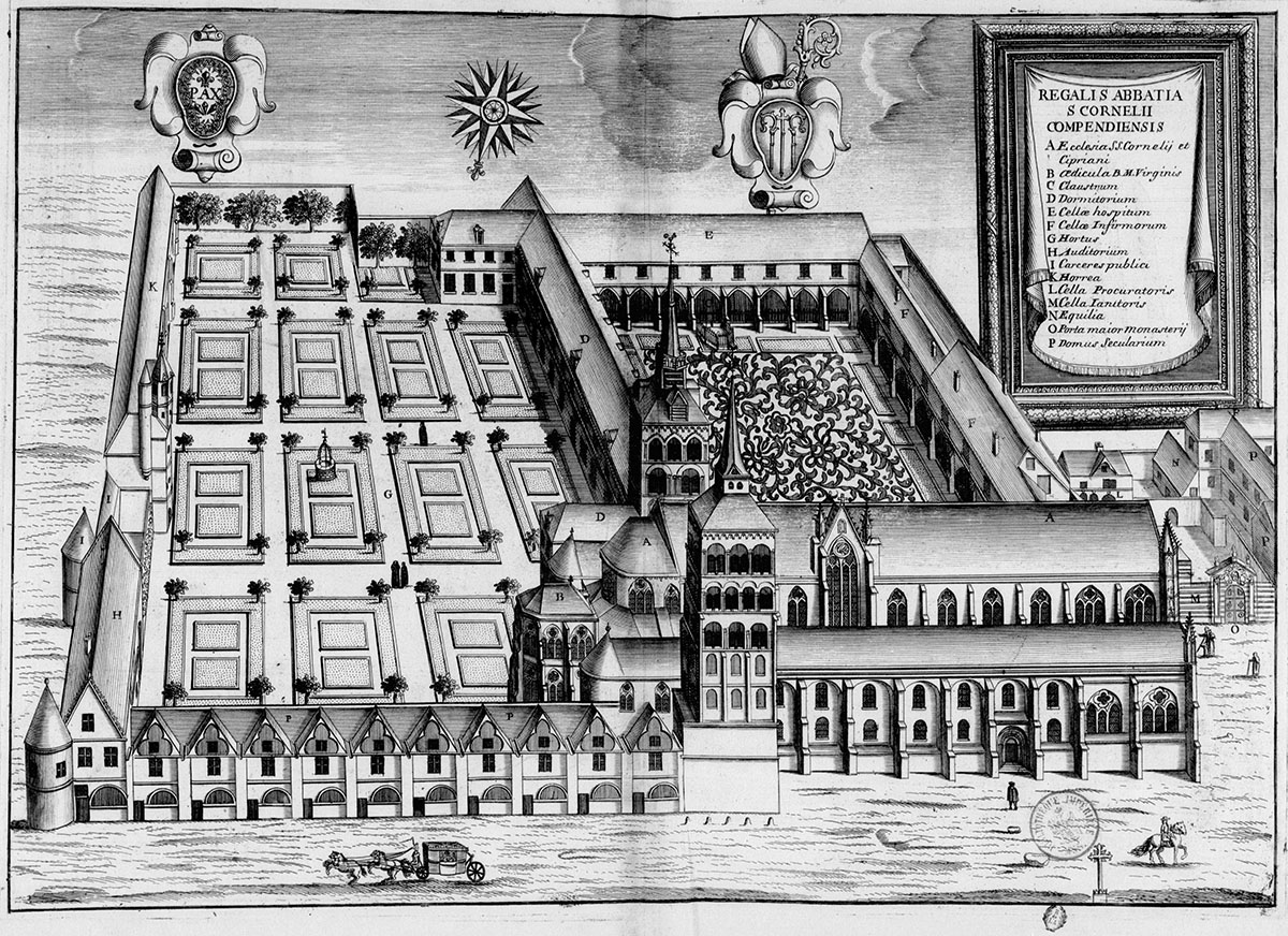 Une souche de la tour sud, une partie du mur du bas-côté nord noyé dans des constructions postérieures et un cloître pour l’essentiel du 14ème siècle sont tout ce qui reste aujourd’hui de la plus ancienne et de la plus prestigieuse abbaye compiégnoise. Elle a pour origine une chapelle dédiée à la Vierge, fondée en 877 par Charles le Chauve à proximité de son palais et bâtie sur le modèle de celle de Charlemagne à Aix-la-Chapelle. Restaurée par Charles le Simple en 917, après deux incendies allumés par les Normands, la chapelle se voit alors adjoindre une basilique dédiée aux saints Corneille – dont les reliques sont ramenées de Rome par le souverain après son couronnement – et Cyprien. Louis V, le dernier Carolingien, y est inhumé en 987.