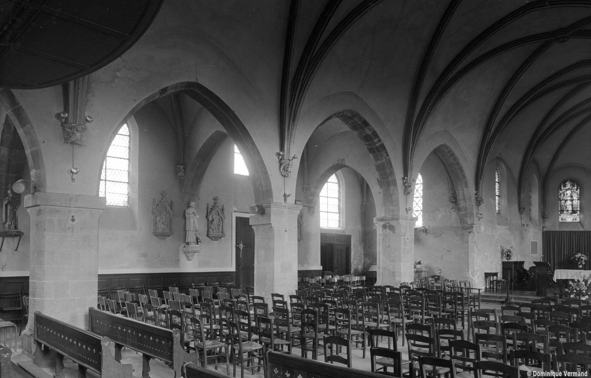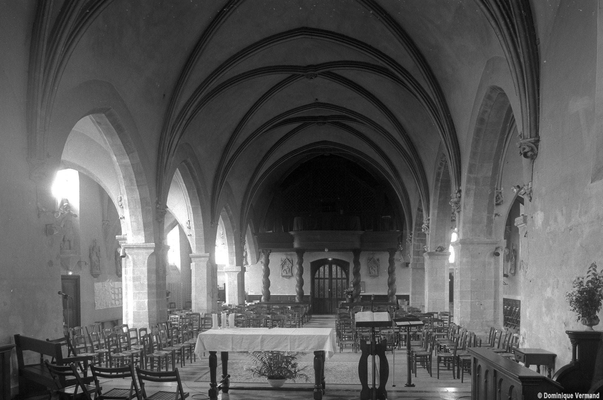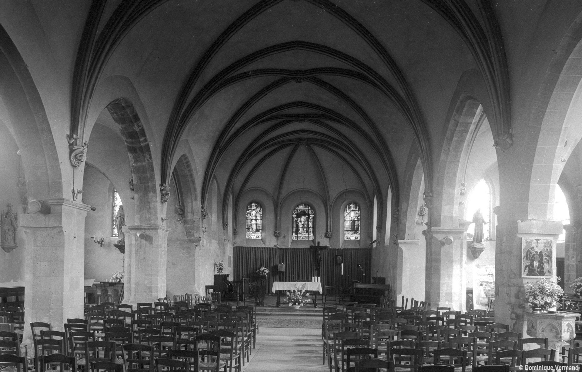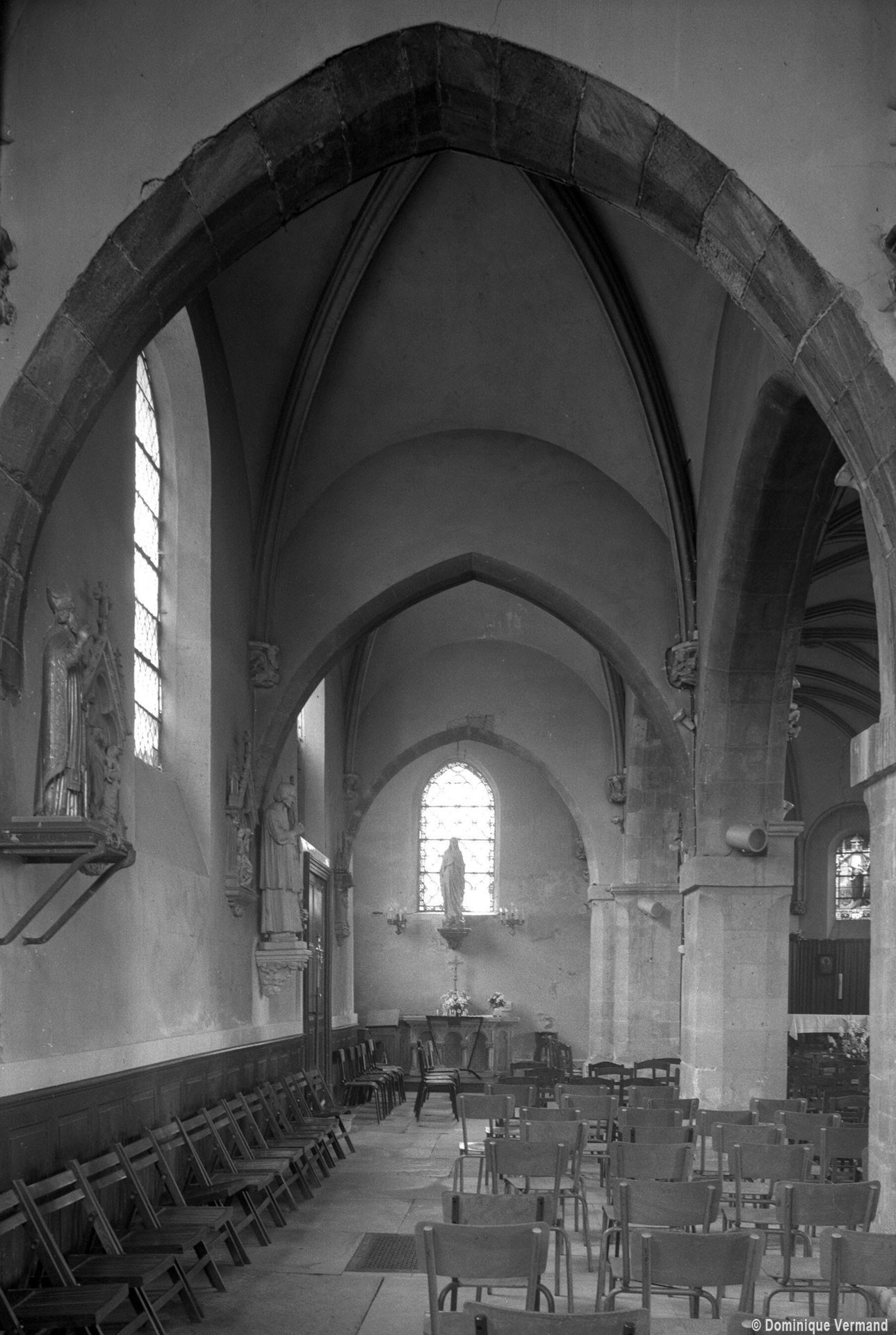 L’édifice comprend une nef de quatre travées avec bas-côtés, un choeur formé d’une travée et d’une abside pentagonale et, en façade, un clocher porche ajouté au 17ème siècle. Si la nef et le choeur n’ont guère d’intérêt et apparaissent davantage comme un pastiche néo-gothique, il n’en est pas de même des bas-côtés, qui présentent un caractère beaucoup plus authentique. Séparées par des arcs doubleaux bien marqués, les travées sont couvertes de voûtes d’ogives qui retombent sur des culs-de-lampe décorés de personnages sculptés avec réalisme et que l’on prendra plaisir à détailler.
