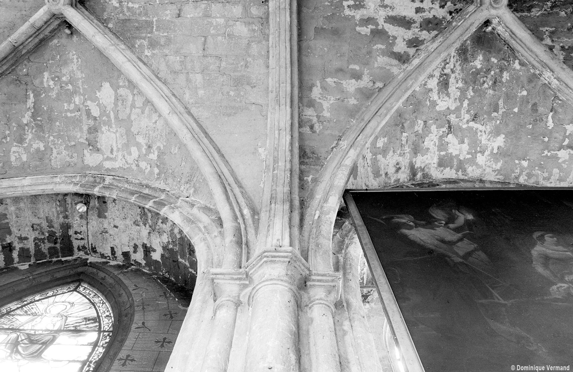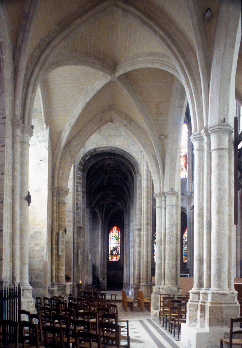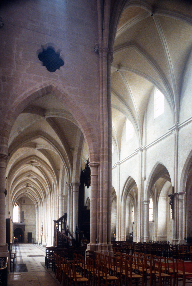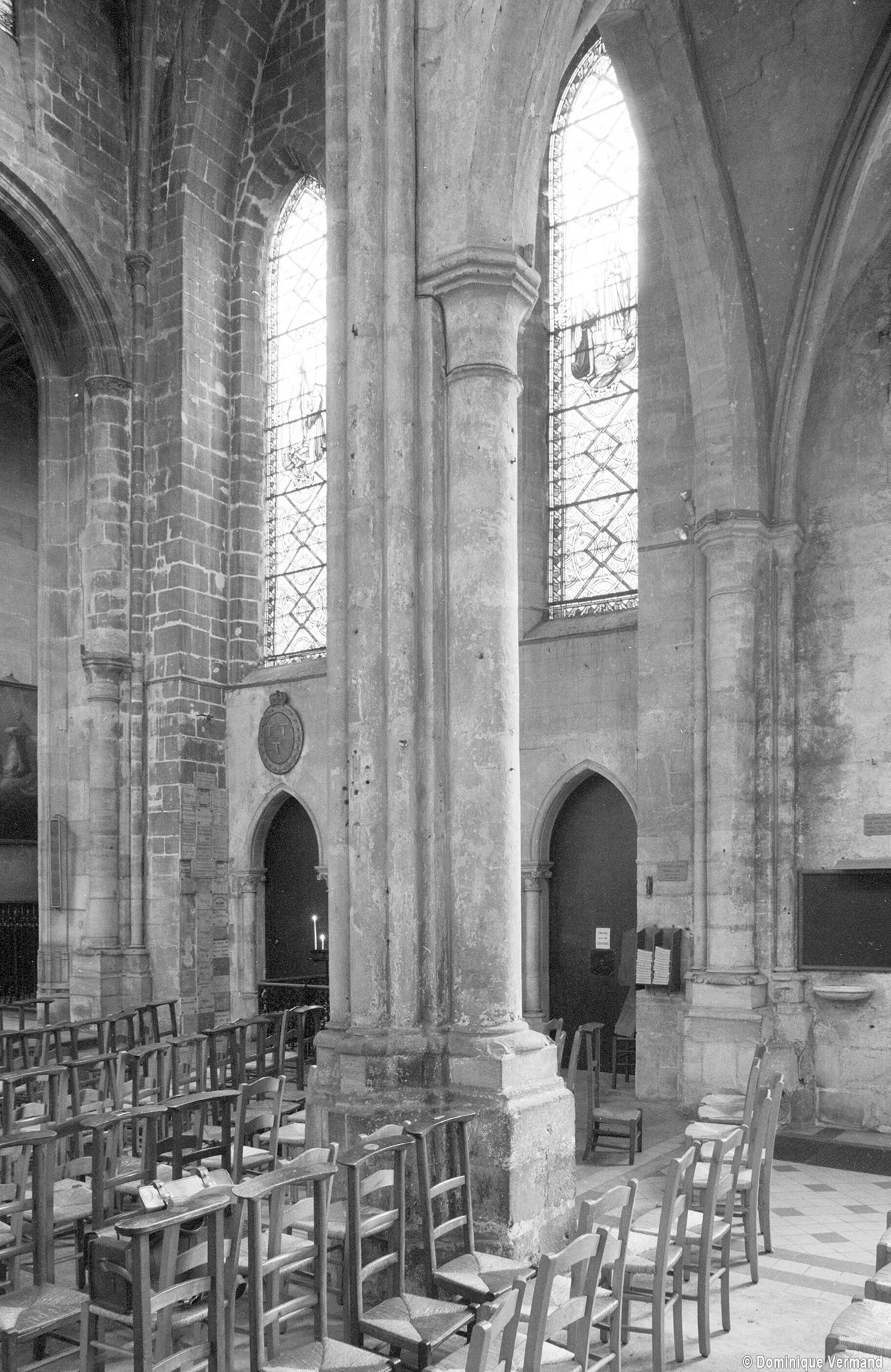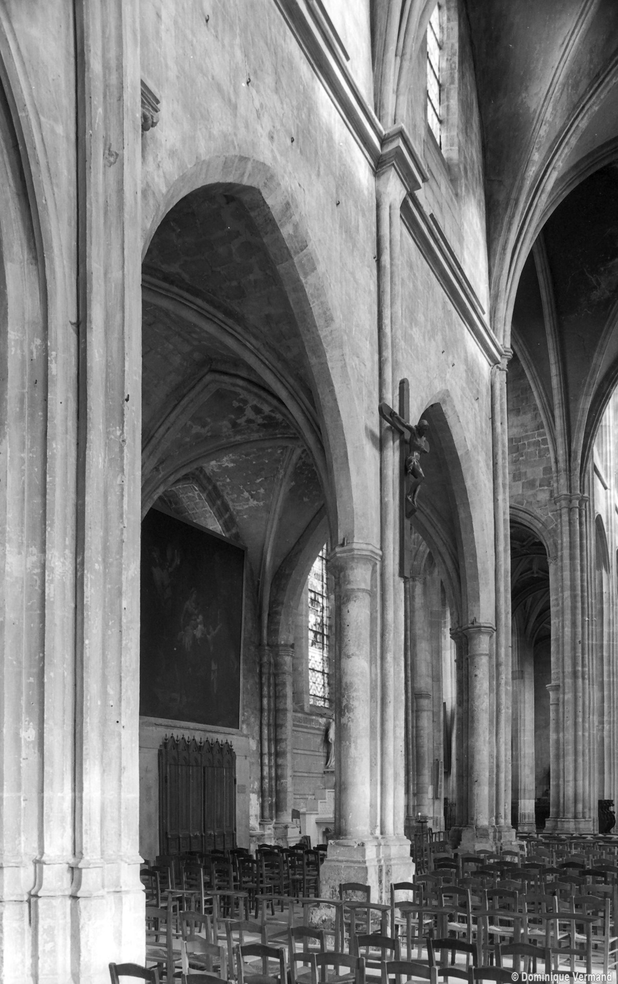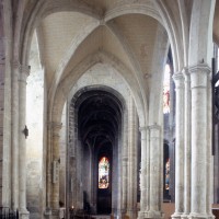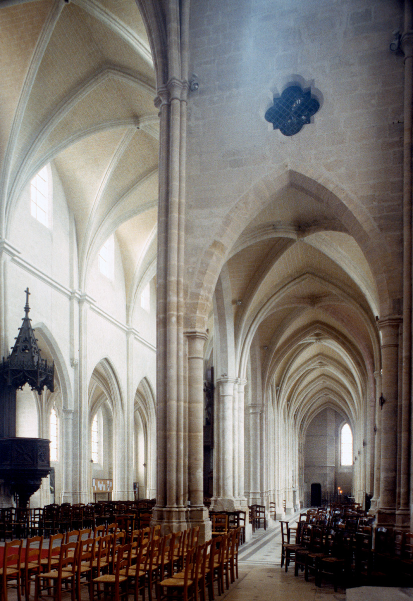Hormis les deux dernières travées qui, bien que dénaturées (quatre feuilles bouchés, chapiteaux grattés), sont clairement du 13ème siècle, le reste de la nef résulte d’une audacieuse reprise en sous-oeuvre effectuée au 16ème siècle. Si les arcades à profil prismatique et sans chapiteau accusent bien le gothique finissant, il n’en est toutefois pas de même des parties hautes, dont l’analyse extérieure montre nettement qu’elles appartiennent, bien que remaniées, à la construction primitive.