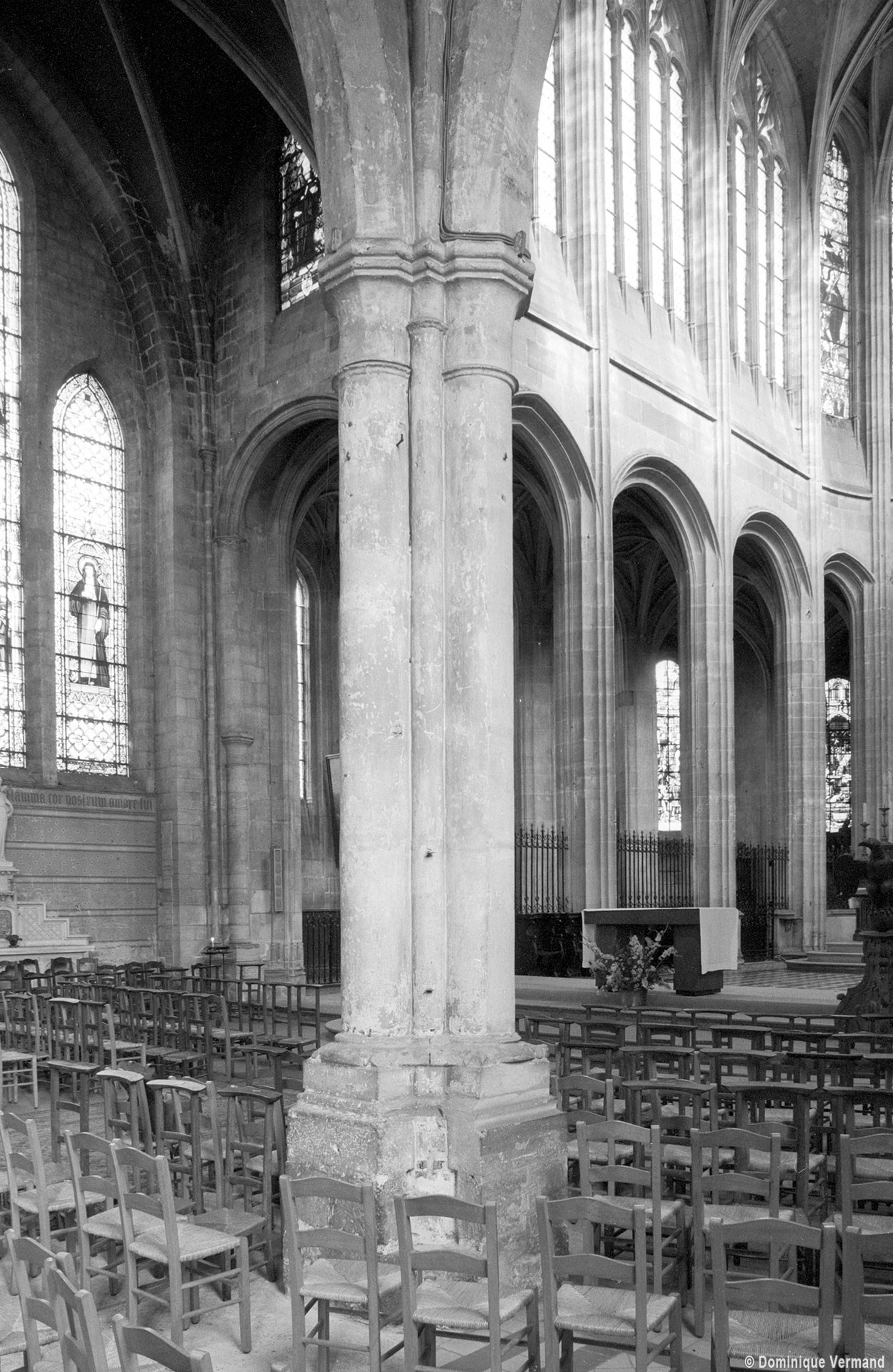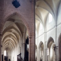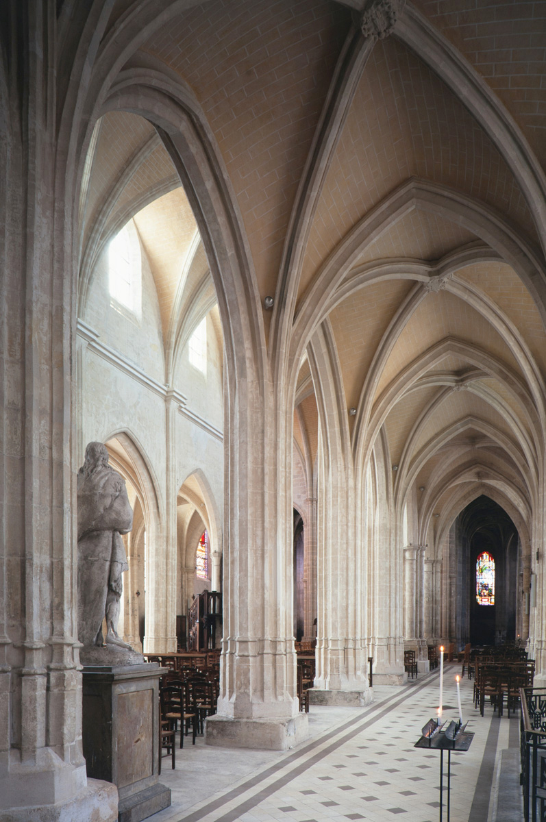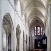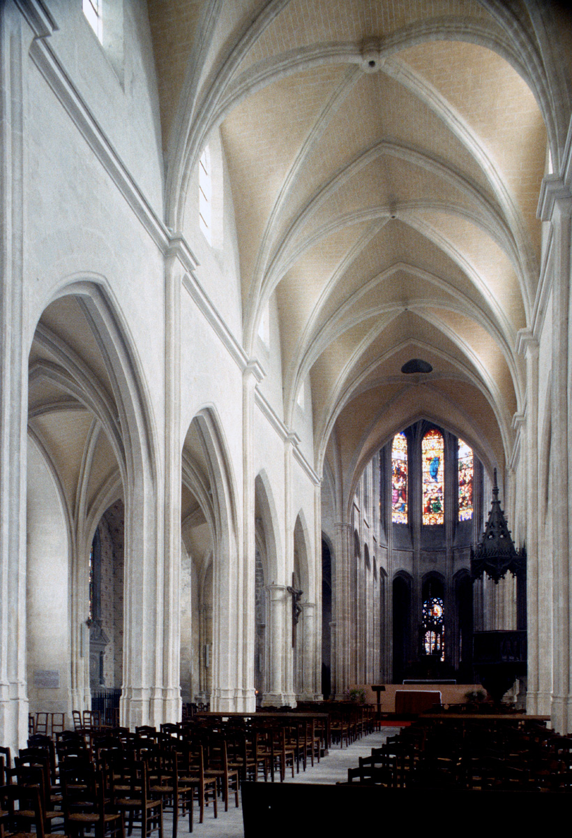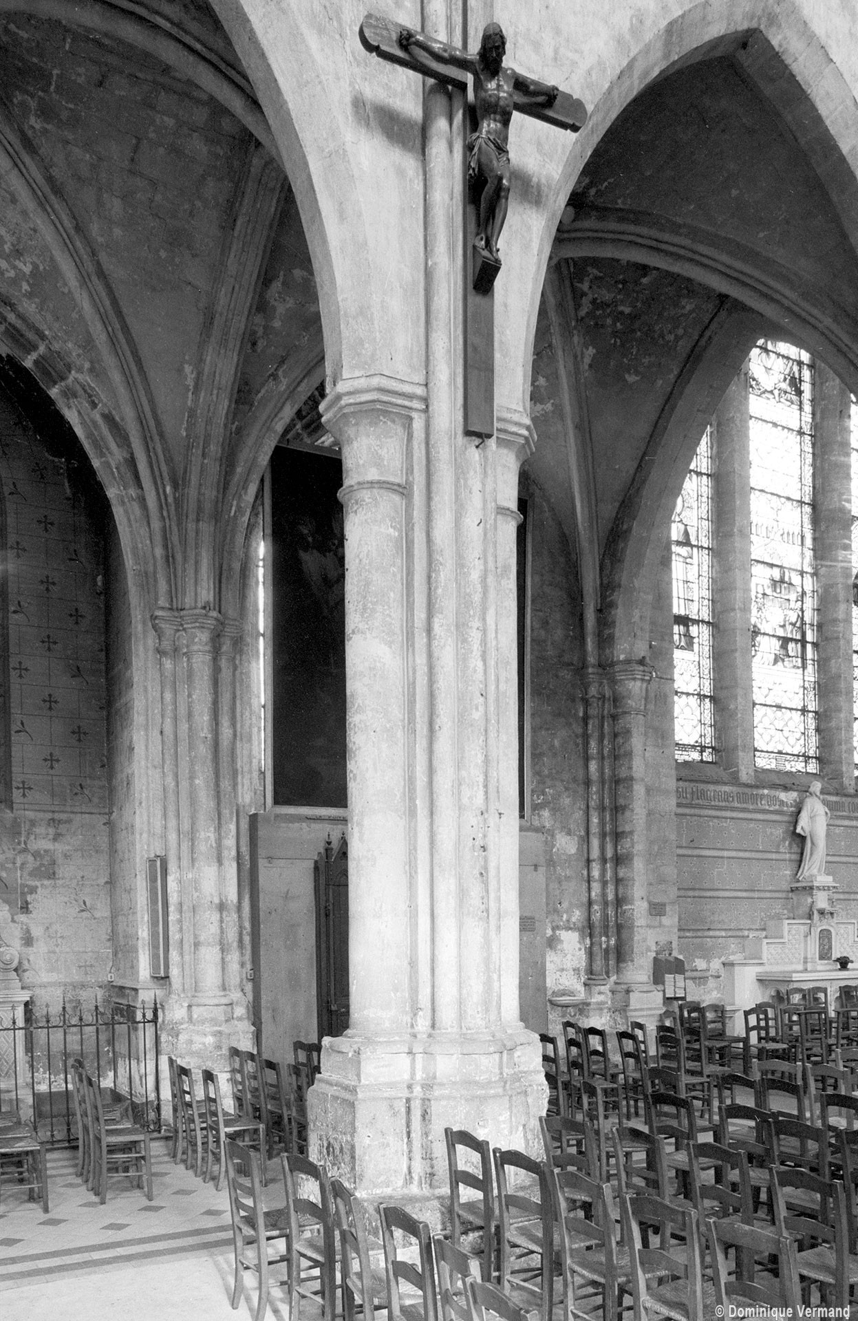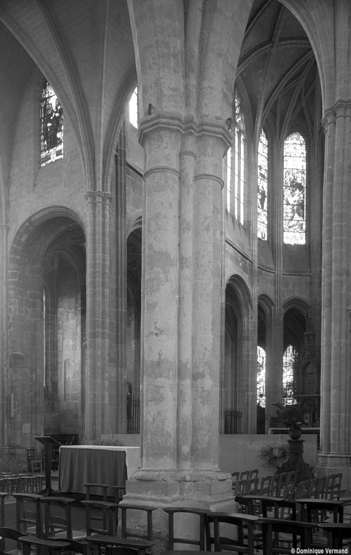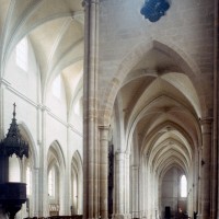Hormis les deux dernières travées qui, bien que dénaturées (quatre feuilles bouchés, chapiteaux grattés), sont clairement du 13ème siècle, le reste de la nef résulte d’une audacieuse reprise en sous-oeuvre effectuée au 16ème siècle. Si les arcades à profil prismatique et sans chapiteau accusent bien le gothique finissant, il n’en est toutefois pas de même des parties hautes, dont l’analyse extérieure montre nettement qu’elles appartiennent, bien que remaniées, à la construction primitive.