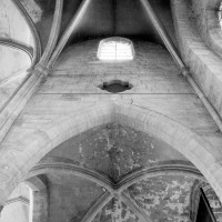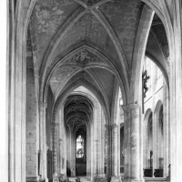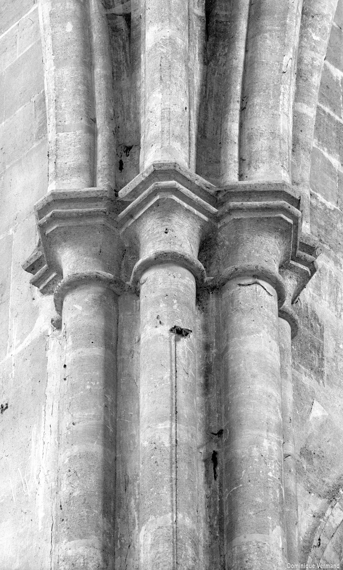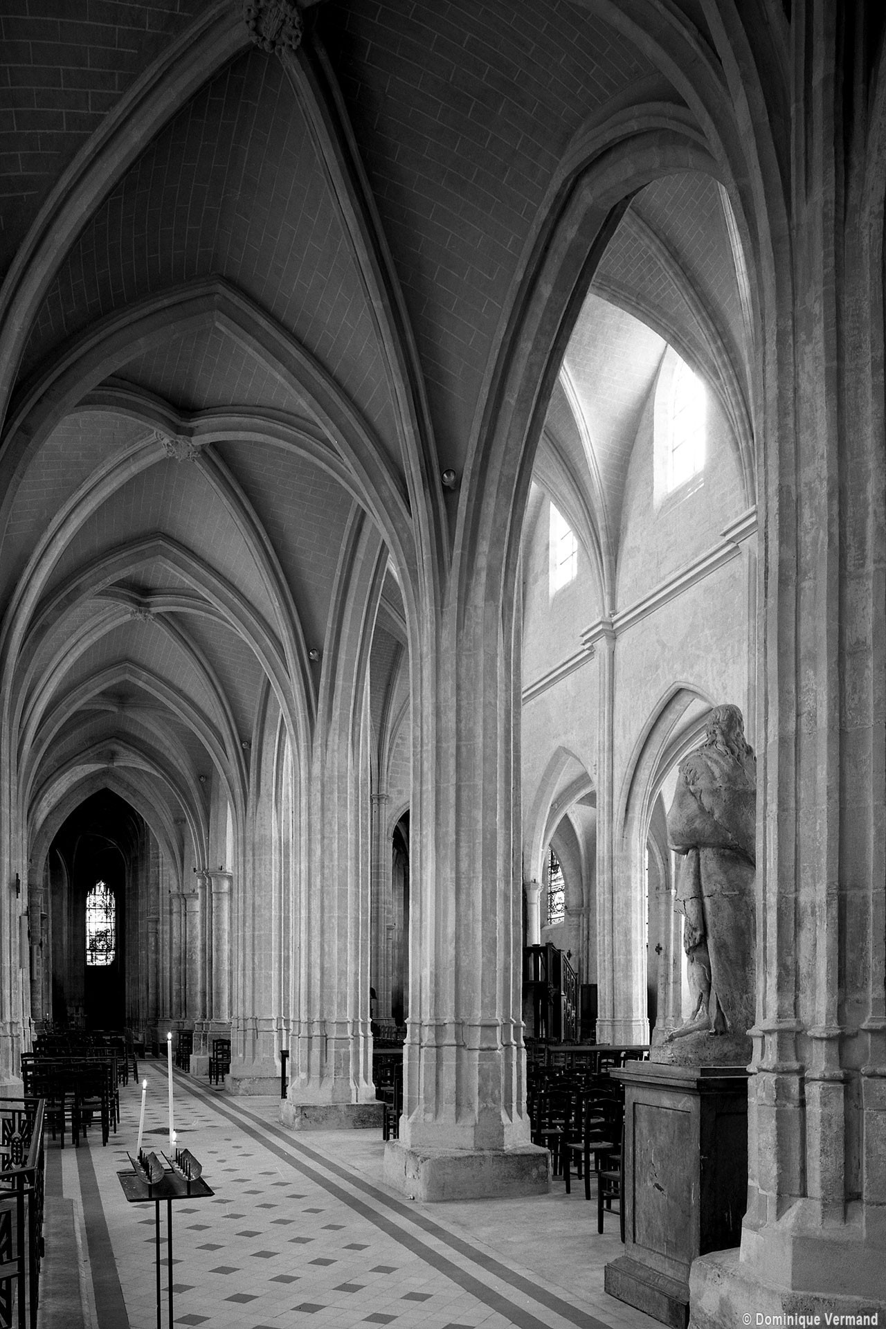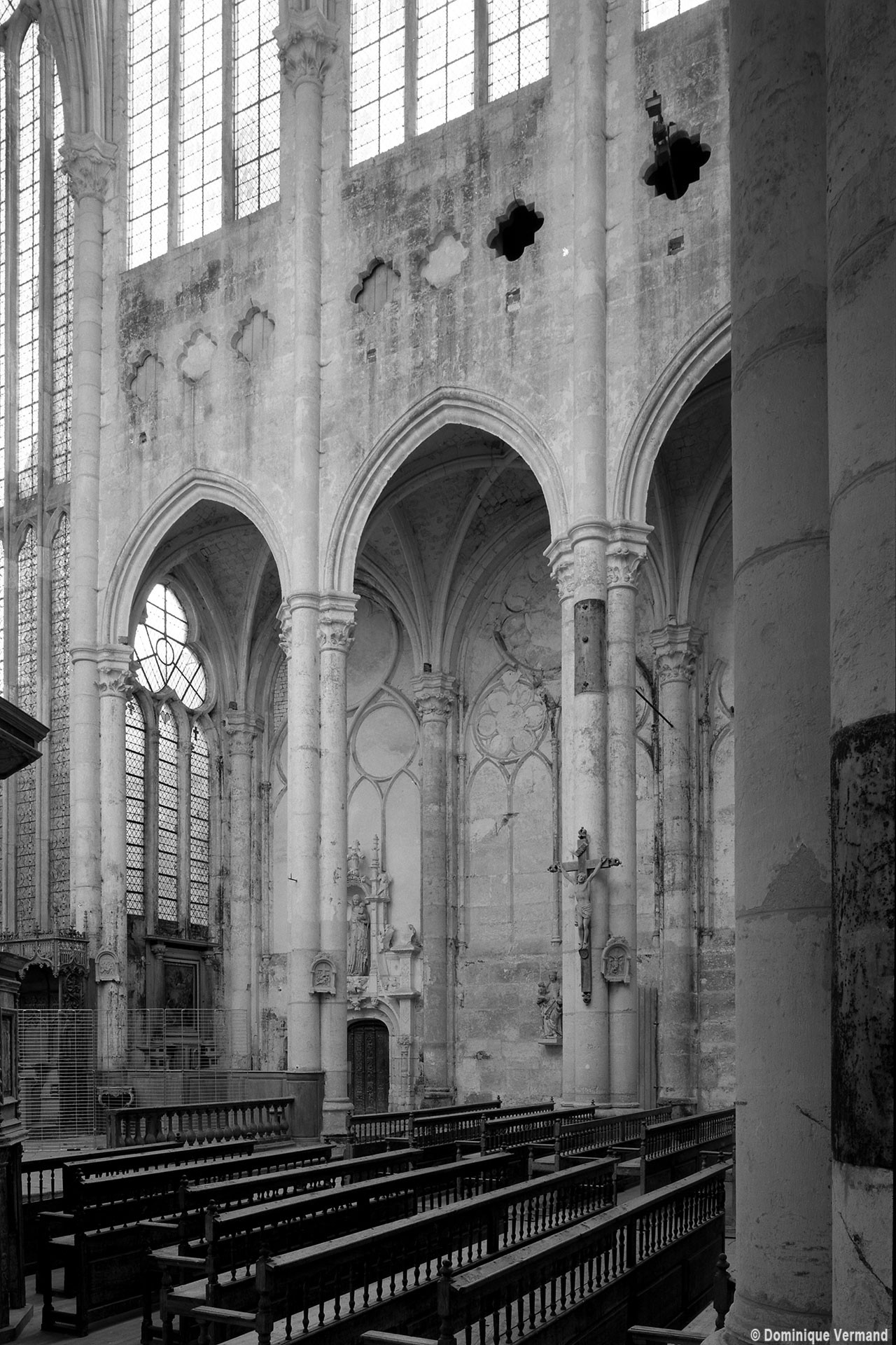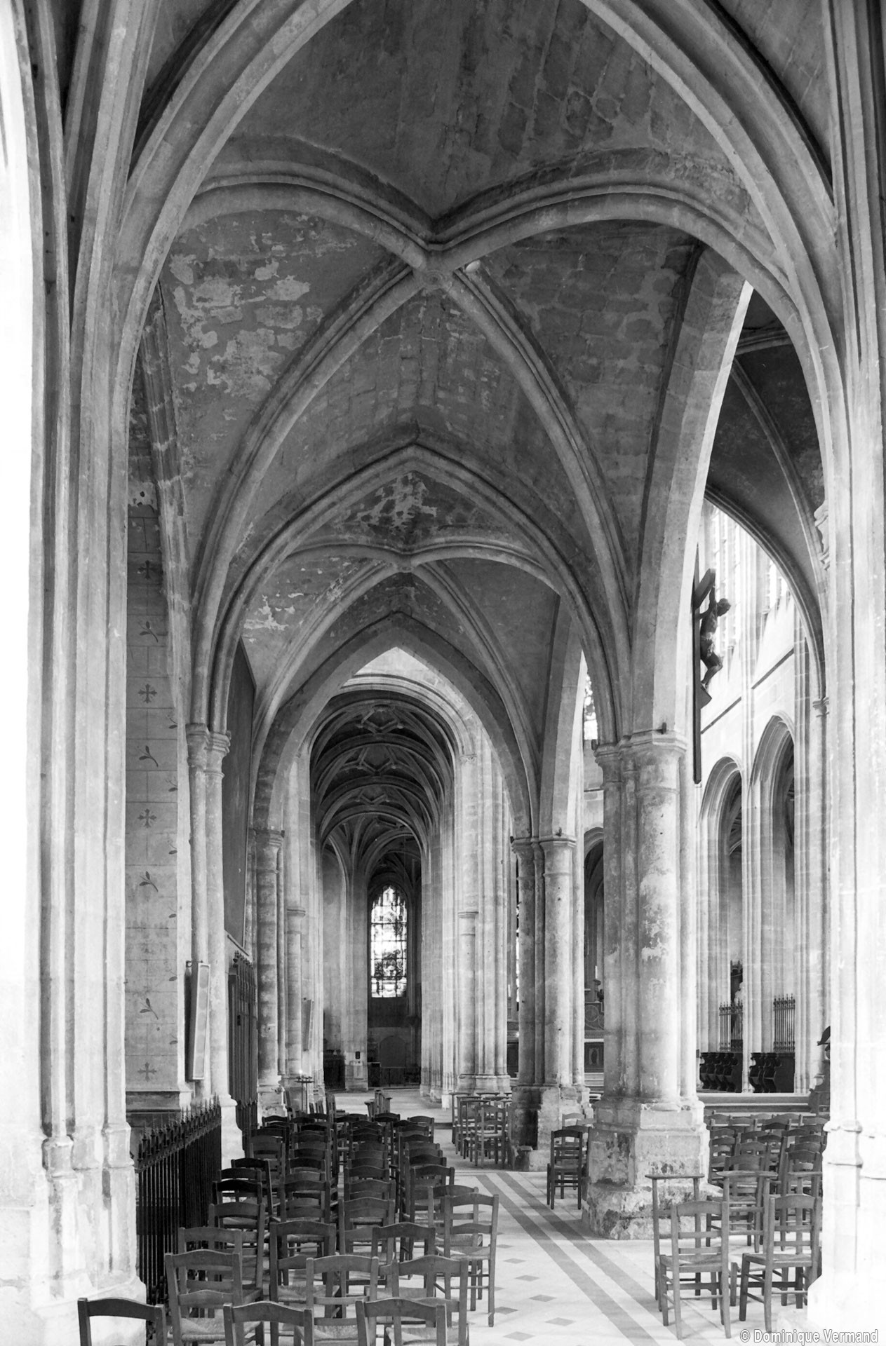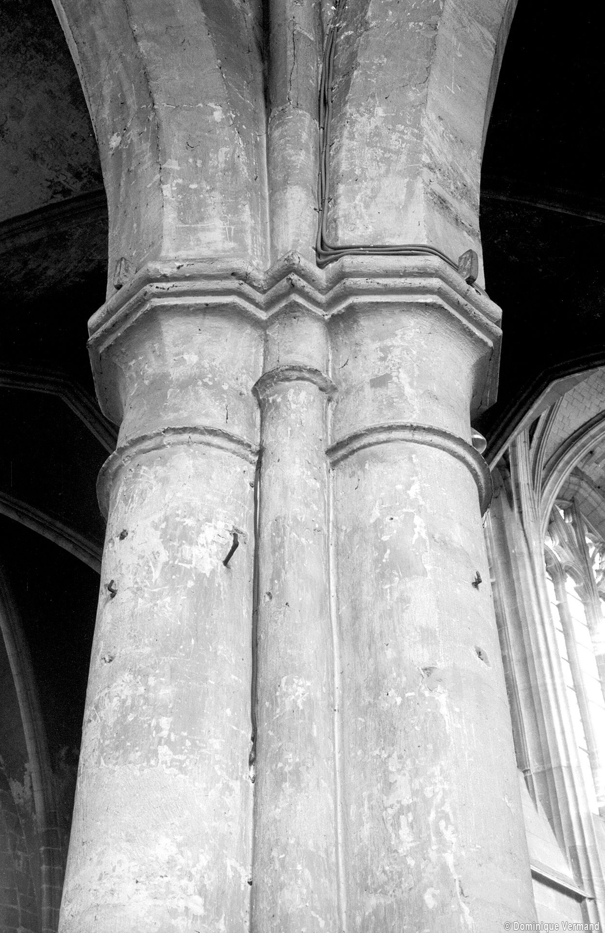 Hormis les deux dernières travées qui, bien que dénaturées (quatre feuilles bouchés, chapiteaux grattés), sont clairement du 13ème siècle, le reste de la nef résulte d’une audacieuse reprise en sous-oeuvre effectuée au 16ème siècle. Si les arcades à profil prismatique et sans chapiteau accusent bien le gothique finissant, il n’en est toutefois pas de même des parties hautes, dont l’analyse extérieure montre nettement qu’elles appartiennent, bien que remaniées, à la construction primitive.
