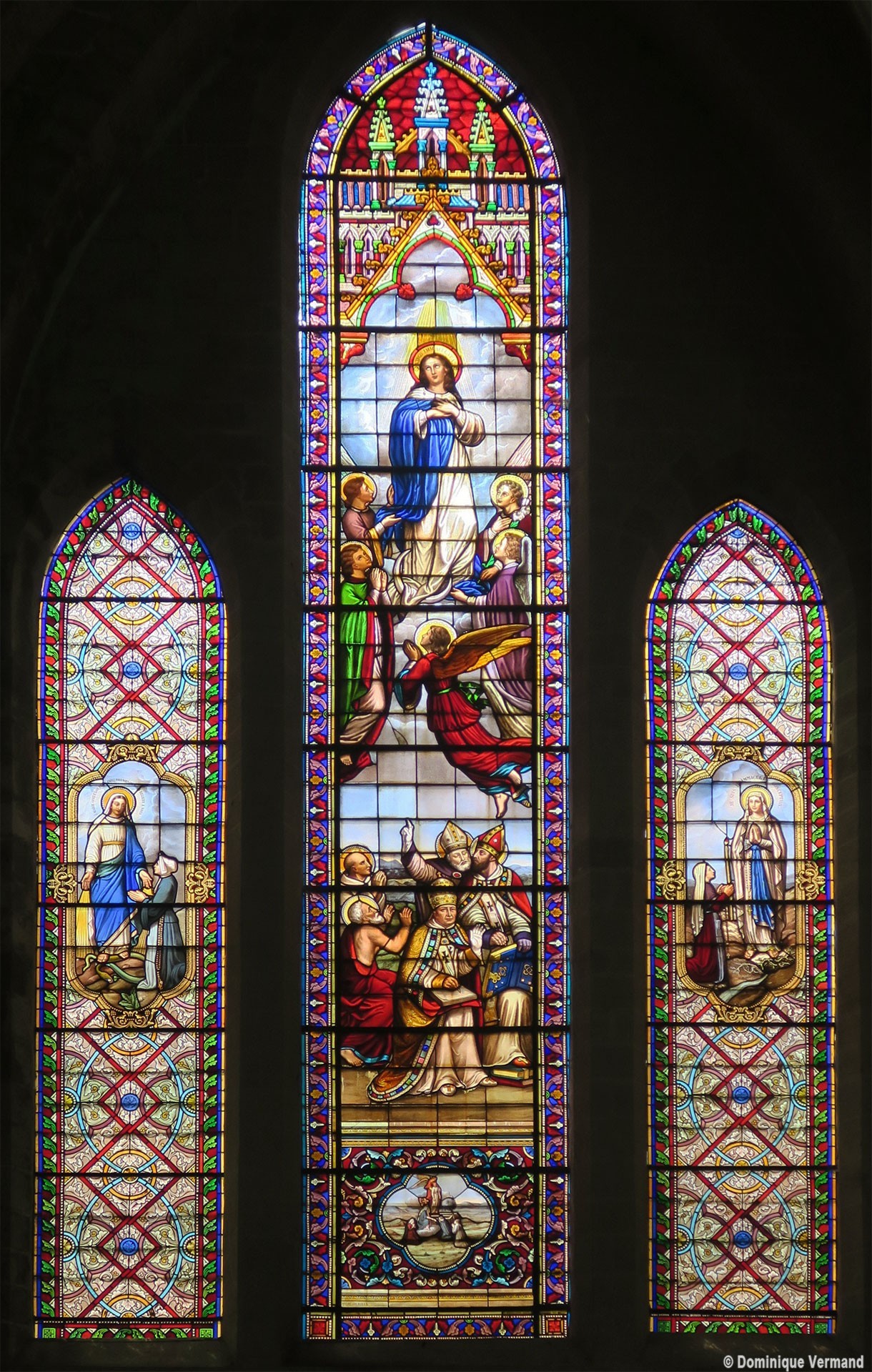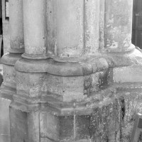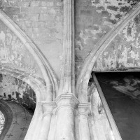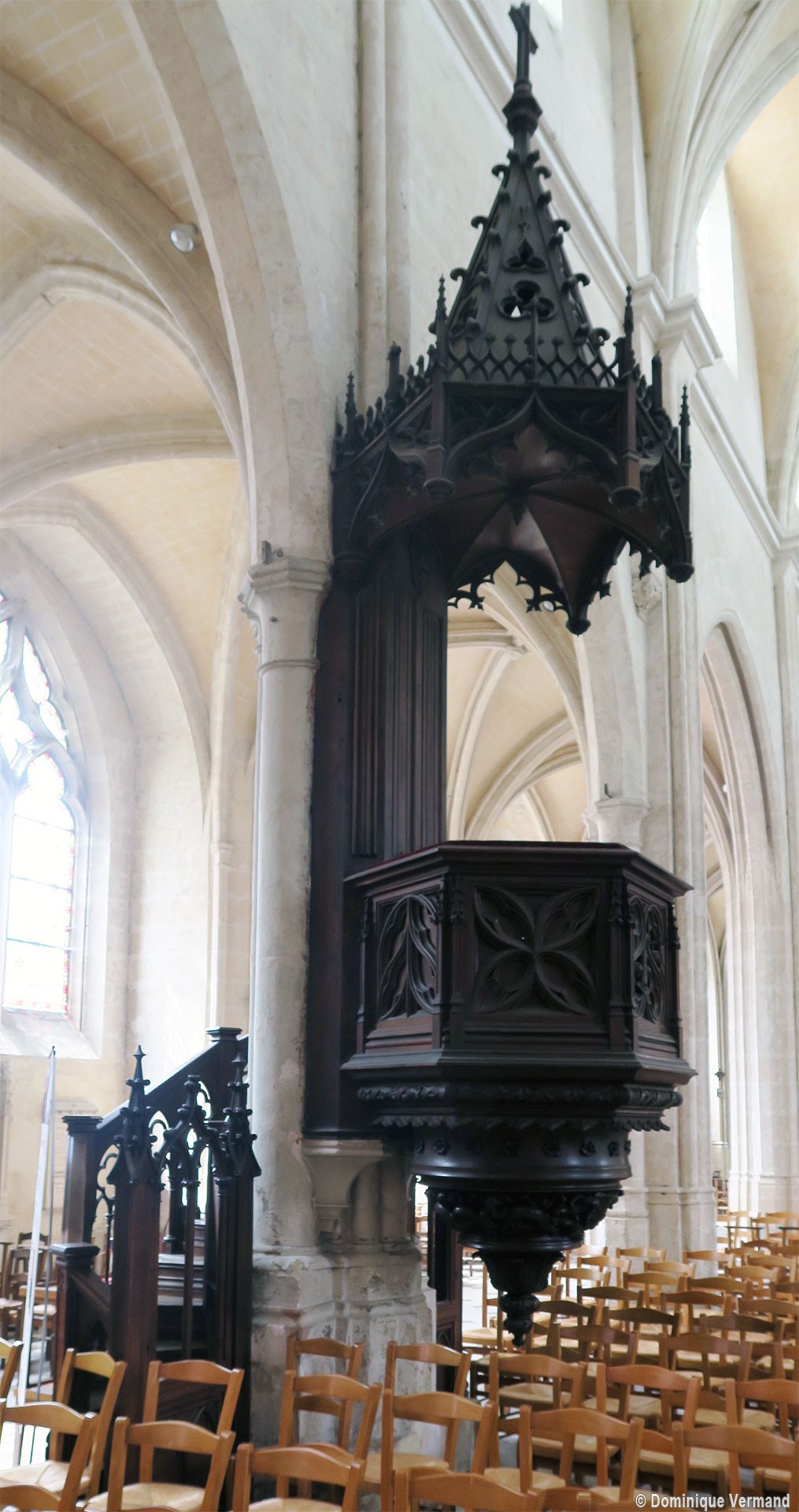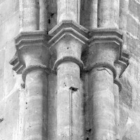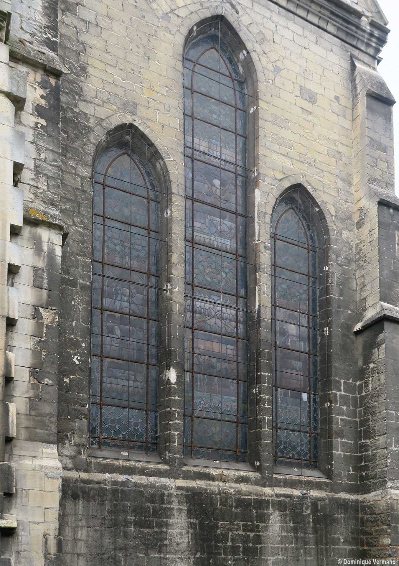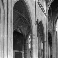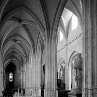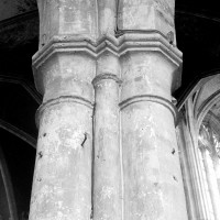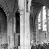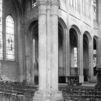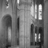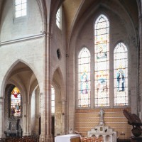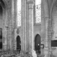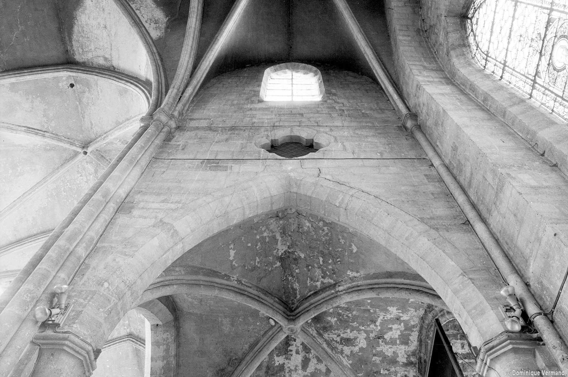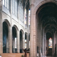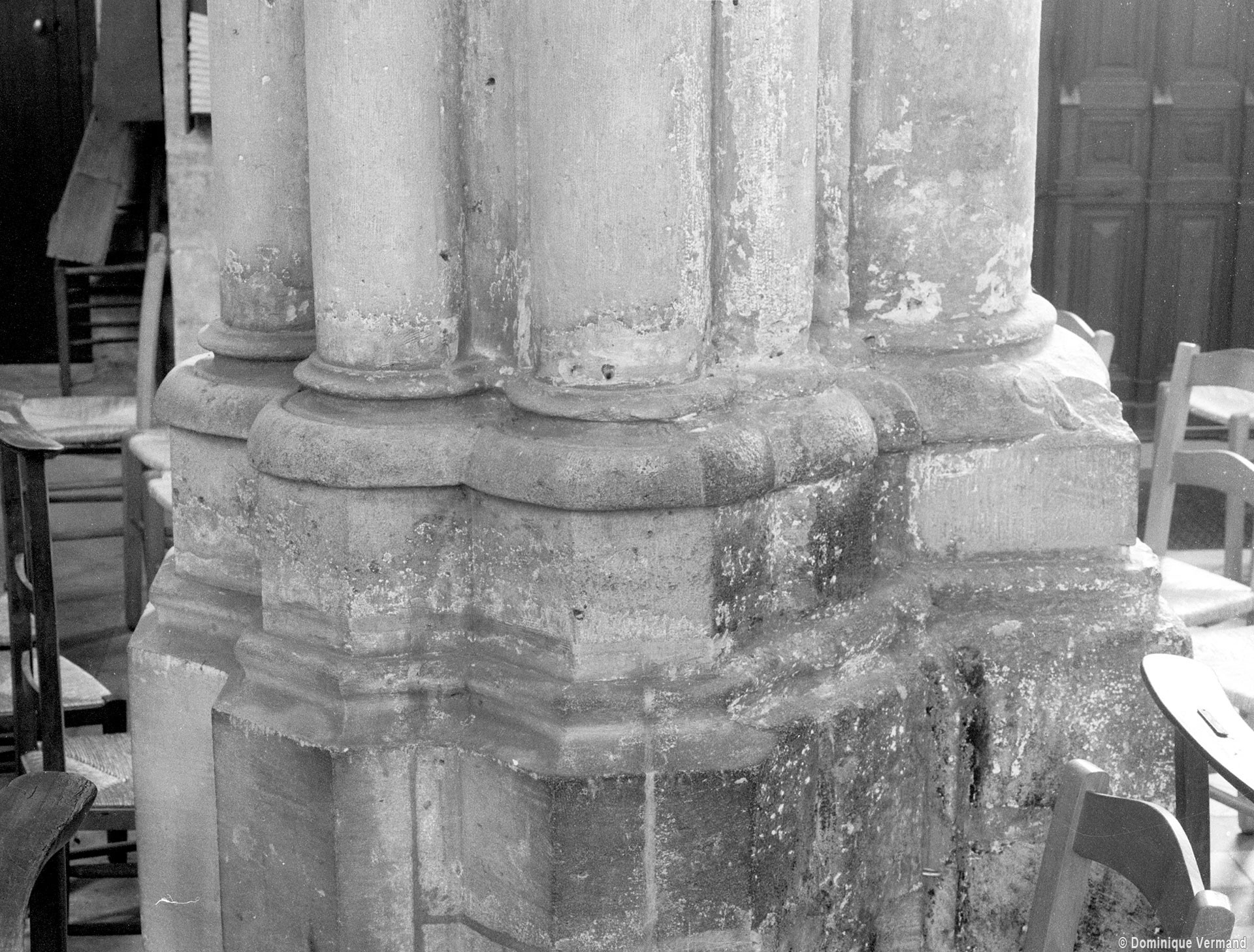 Hormis les deux dernières travées qui, bien que dénaturées (quatre feuilles bouchés, chapiteaux grattés), sont clairement du 13ème siècle, le reste de la nef résulte d’une audacieuse reprise en sous-oeuvre effectuée au 16ème siècle. Si les arcades à profil prismatique et sans chapiteau accusent bien le gothique finissant, il n’en est toutefois pas de même des parties hautes, dont l’analyse extérieure montre nettement qu’elles appartiennent, bien que remaniées, à la construction primitive.