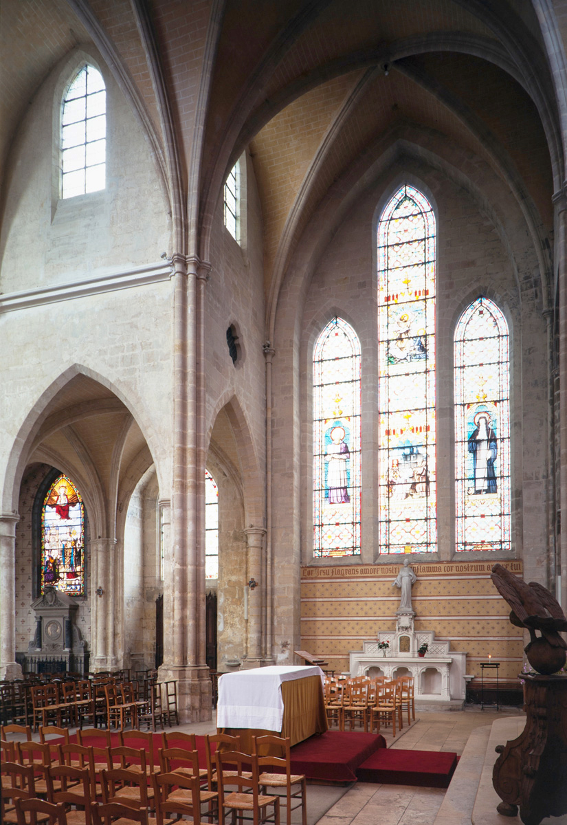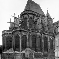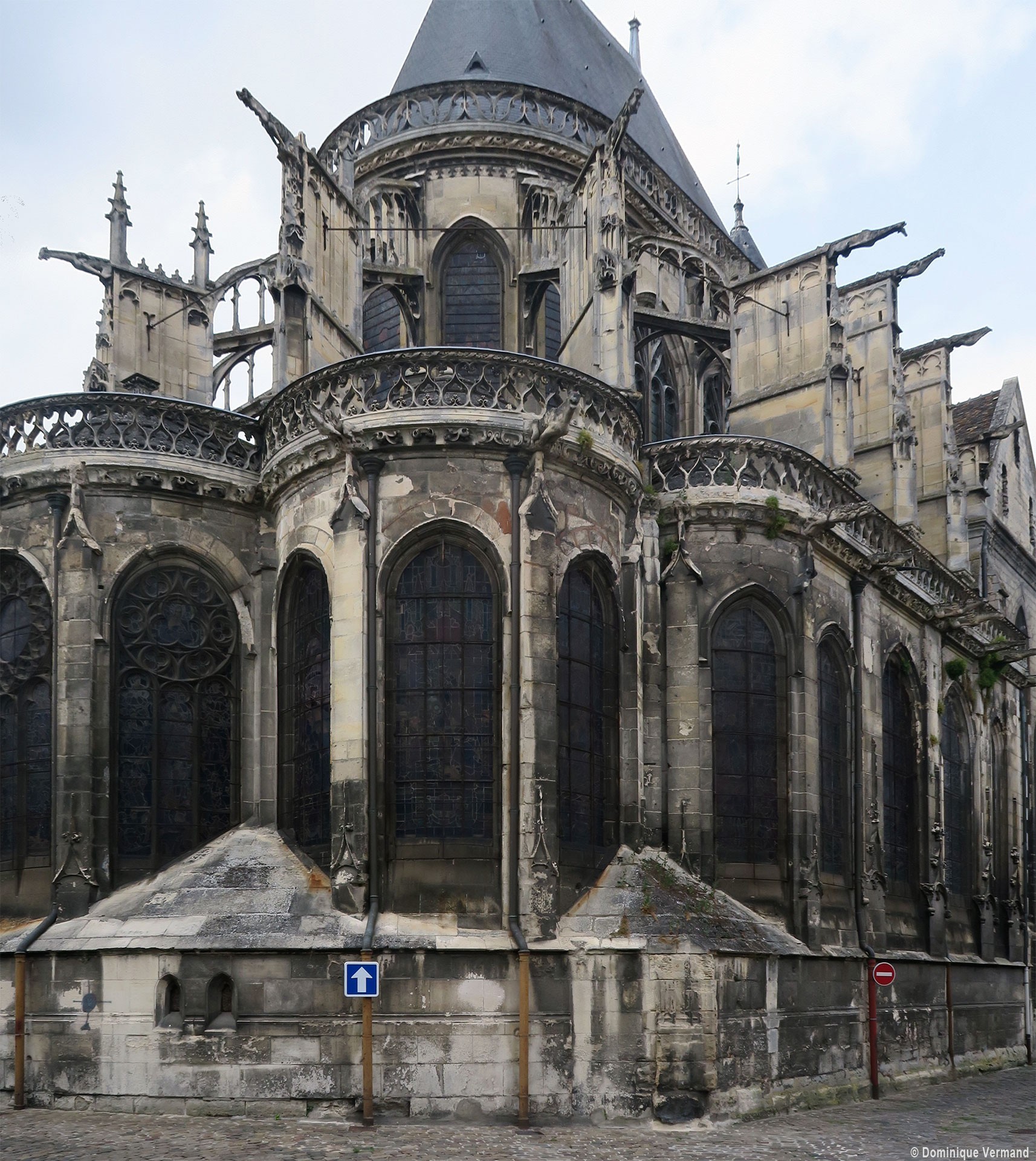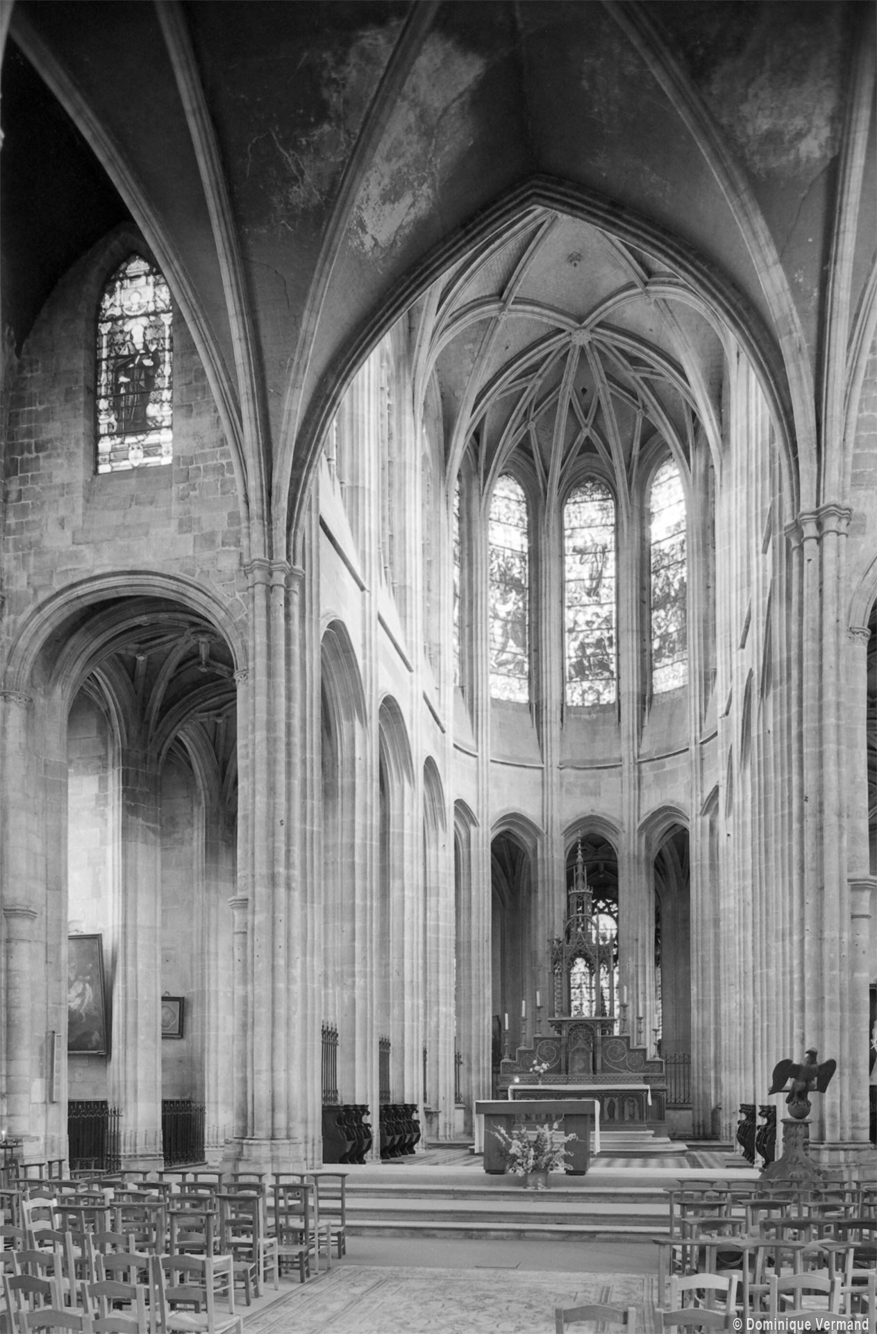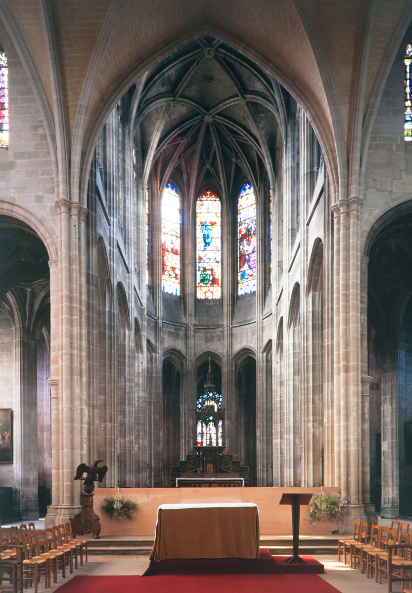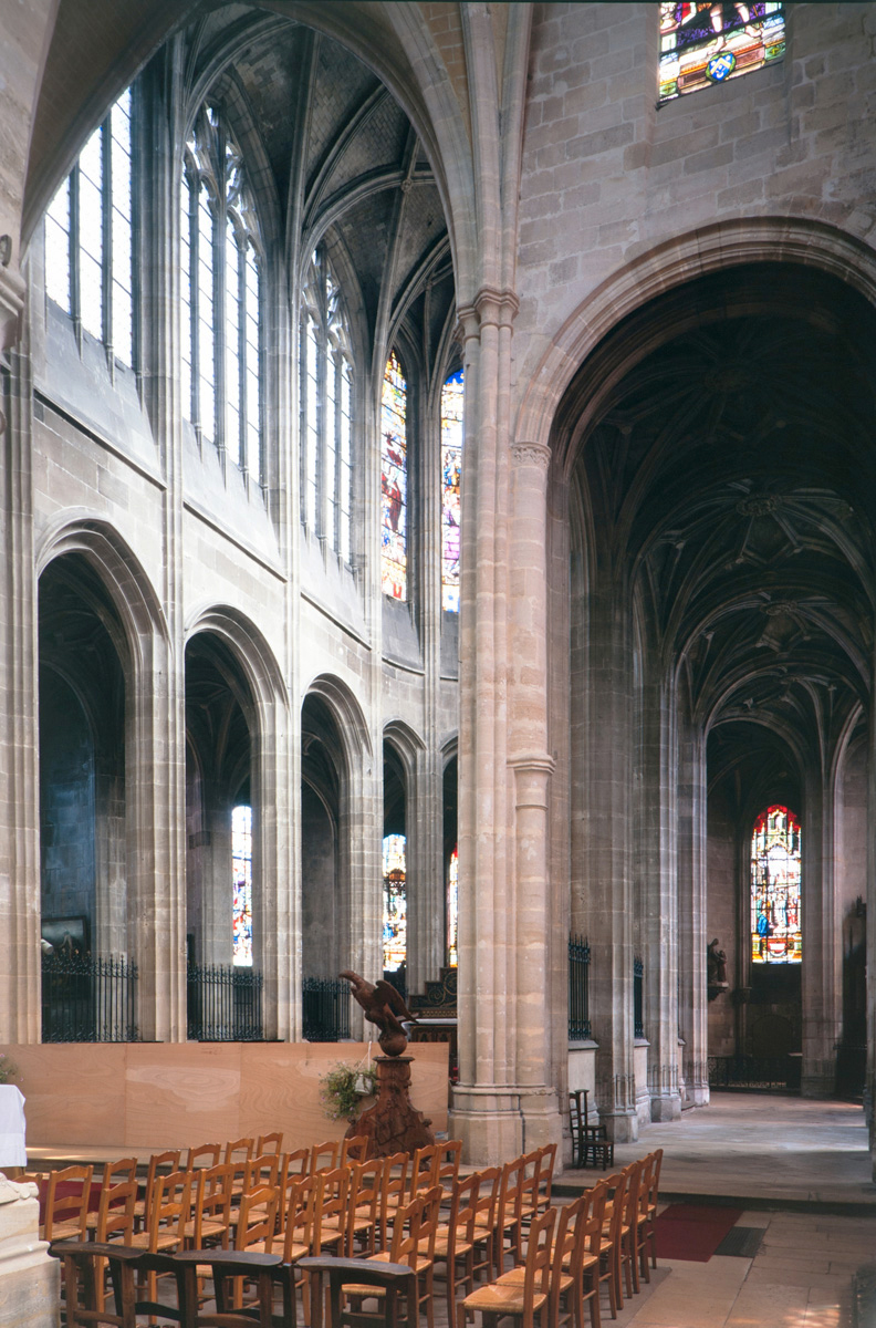 Homogène, contrairement à la nef, le choeur est remarquable par la hauteur de son vaisseau central. Légèrement plus tardif que la façade et que les reprises en sous-oeuvre de la nef, il intègre déjà les formes en plein cintre qui prévaudront à la Renaissance. D’une très grande sobriété, l’élévation du vaisseau central superpose simplement, et en parfaite symétrie, grandes arcades et fenêtres hautes. Aucun chapiteau ne vient souligner la retombée des voûtes ni celle des arcades. Ce dépouillement de l’élévation met d’autant plus en évidence la complexité des voûtes, aux nombreuses nervures secondaires (liernes et tiercerons). Le même contraste se retrouve à l’extérieur où à la netteté du parti général – haut vaisseau central dominant la masse compacte des chapelles des bas-côtés et du déambulatoire – répond le riche décor des balustrades, des arcs-boutants à double volée et de leurs culées.