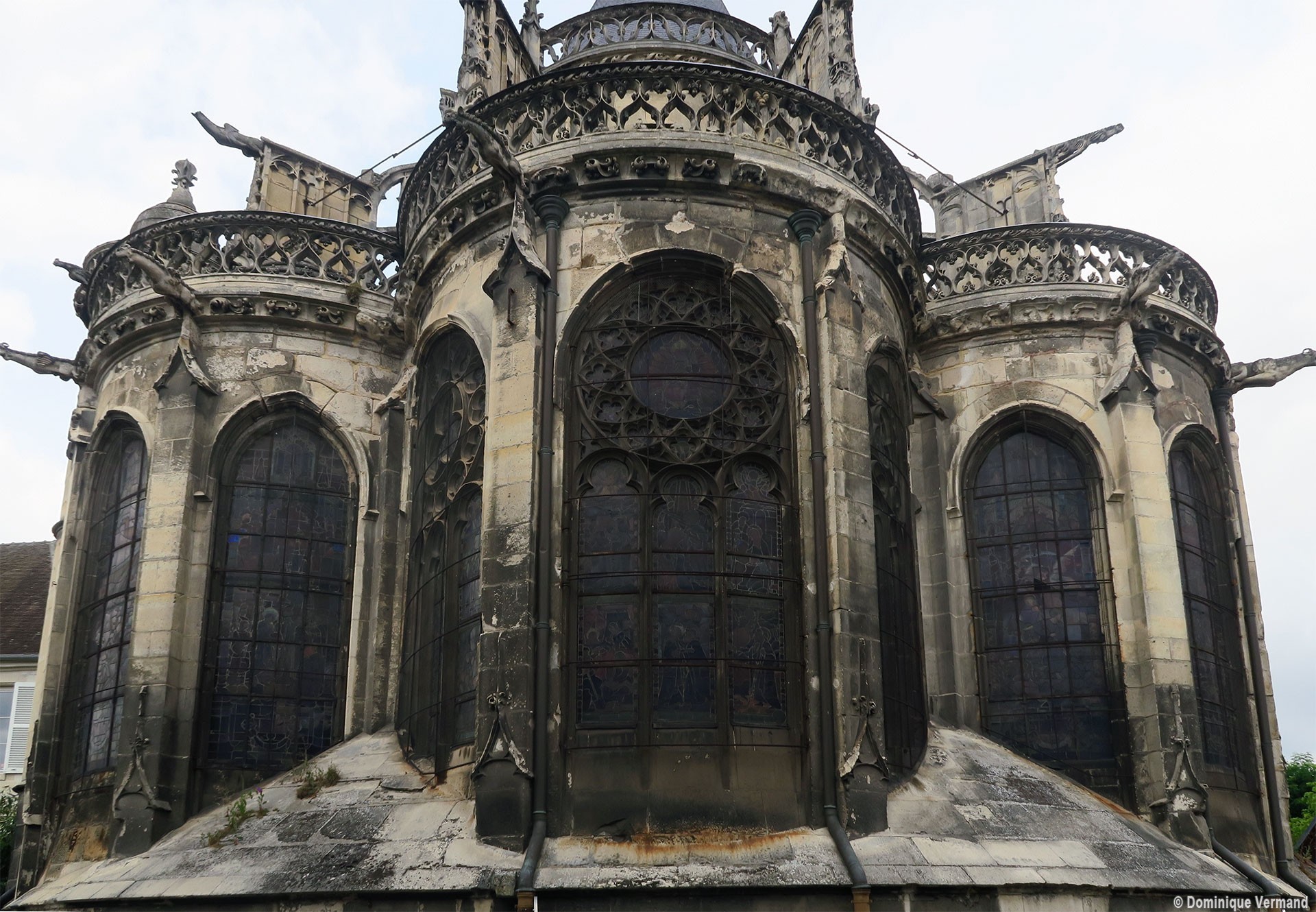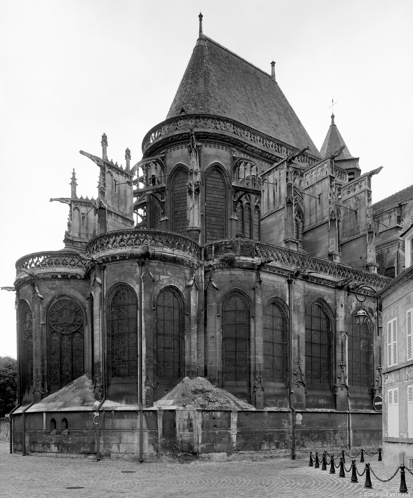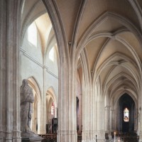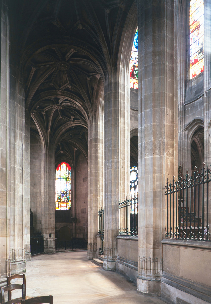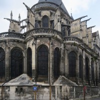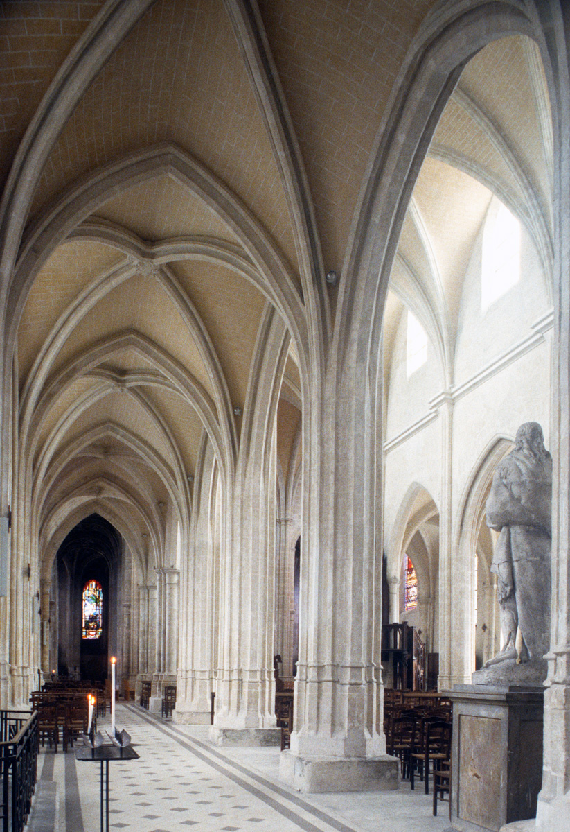 Homogène, contrairement à la nef, le choeur est remarquable par la hauteur de son vaisseau central. Légèrement plus tardif que la façade et que les reprises en sous-oeuvre de la nef, il intègre déjà les formes en plein cintre qui prévaudront à la Renaissance. D’une très grande sobriété, l’élévation du vaisseau central superpose simplement, et en parfaite symétrie, grandes arcades et fenêtres hautes. Aucun chapiteau ne vient souligner la retombée des voûtes ni celle des arcades. Ce dépouillement de l’élévation met d’autant plus en évidence la complexité des voûtes, aux nombreuses nervures secondaires (liernes et tiercerons). Le même contraste se retrouve à l’extérieur où à la netteté du parti général – haut vaisseau central dominant la masse compacte des chapelles des bas-côtés et du déambulatoire – répond le riche décor des balustrades, des arcs-boutants à double volée et de leurs culées.