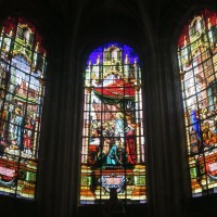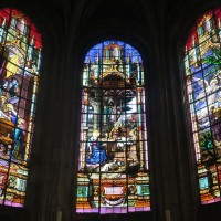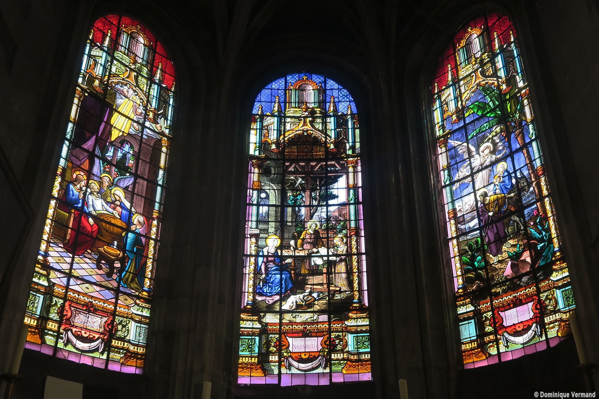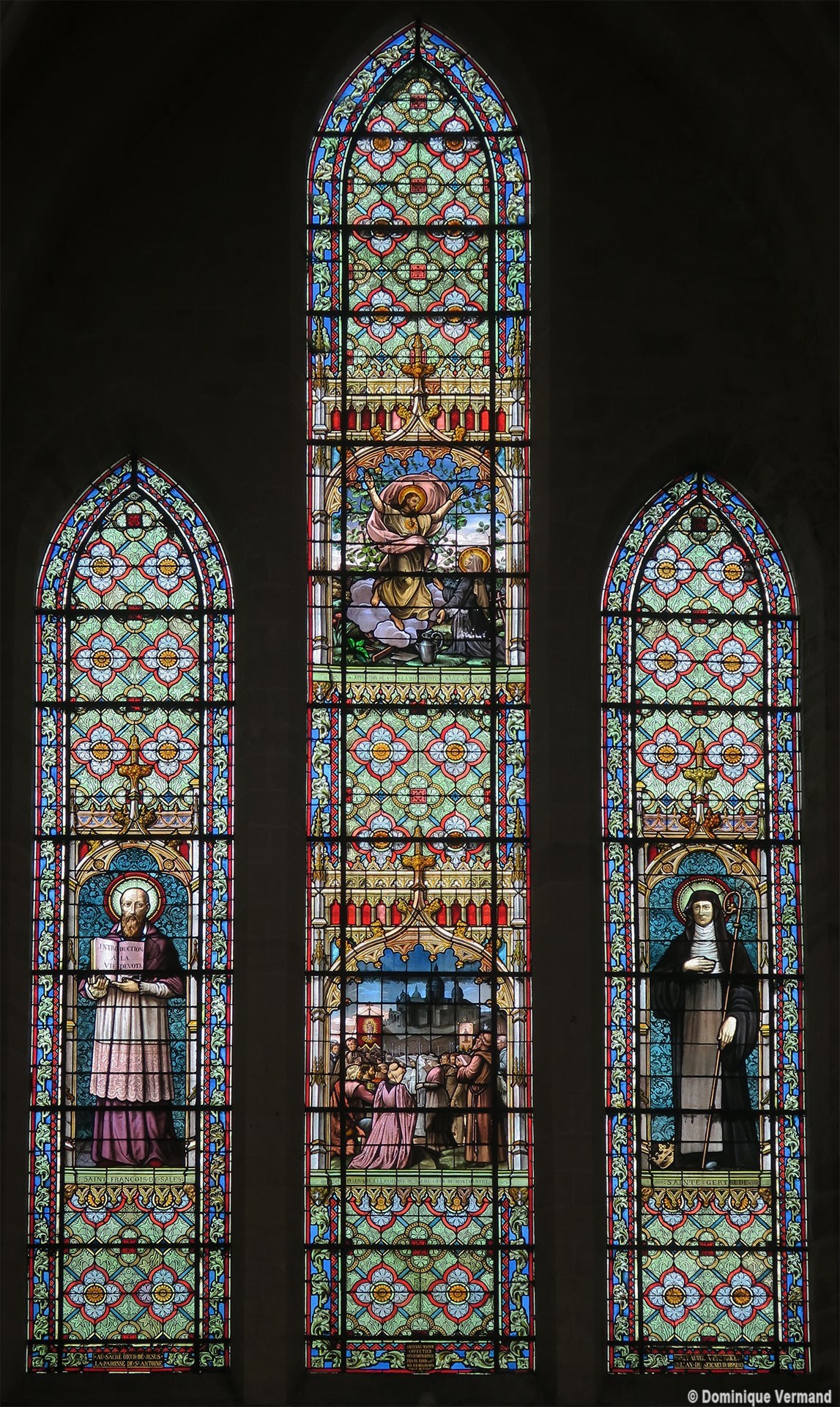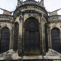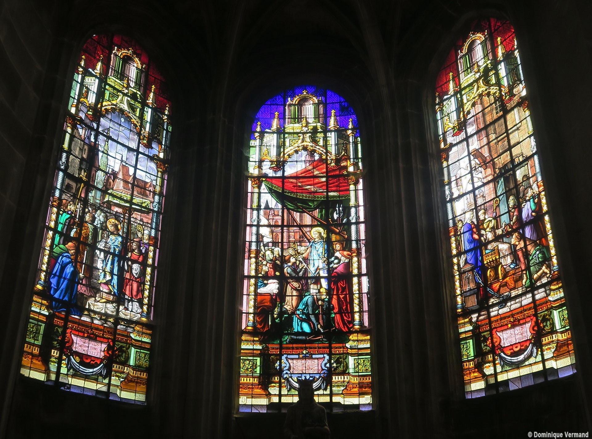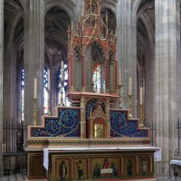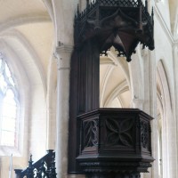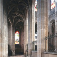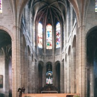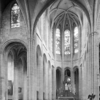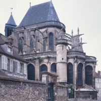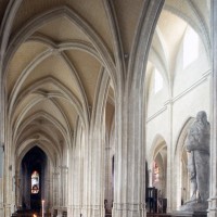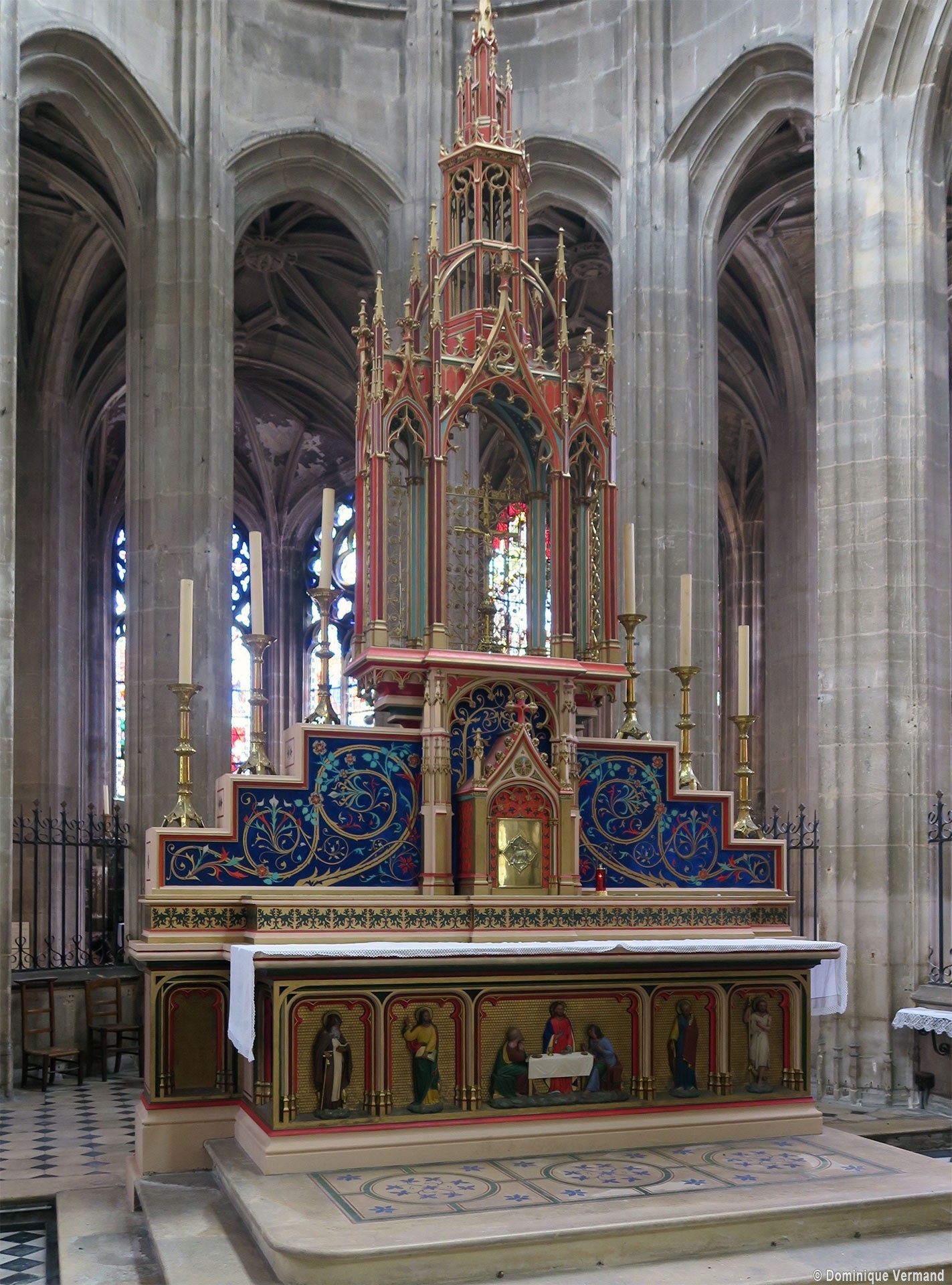 Homogène, contrairement à la nef, le choeur est remarquable par la hauteur de son vaisseau central. Légèrement plus tardif que la façade et que les reprises en sous-oeuvre de la nef, il intègre déjà les formes en plein cintre qui prévaudront à la Renaissance. D’une très grande sobriété, l’élévation du vaisseau central superpose simplement, et en parfaite symétrie, grandes arcades et fenêtres hautes. Aucun chapiteau ne vient souligner la retombée des voûtes ni celle des arcades. Ce dépouillement de l’élévation met d’autant plus en évidence la complexité des voûtes, aux nombreuses nervures secondaires (liernes et tiercerons). Le même contraste se retrouve à l’extérieur où à la netteté du parti général – haut vaisseau central dominant la masse compacte des chapelles des bas-côtés et du déambulatoire – répond le riche décor des balustrades, des arcs-boutants à double volée et de leurs culées.