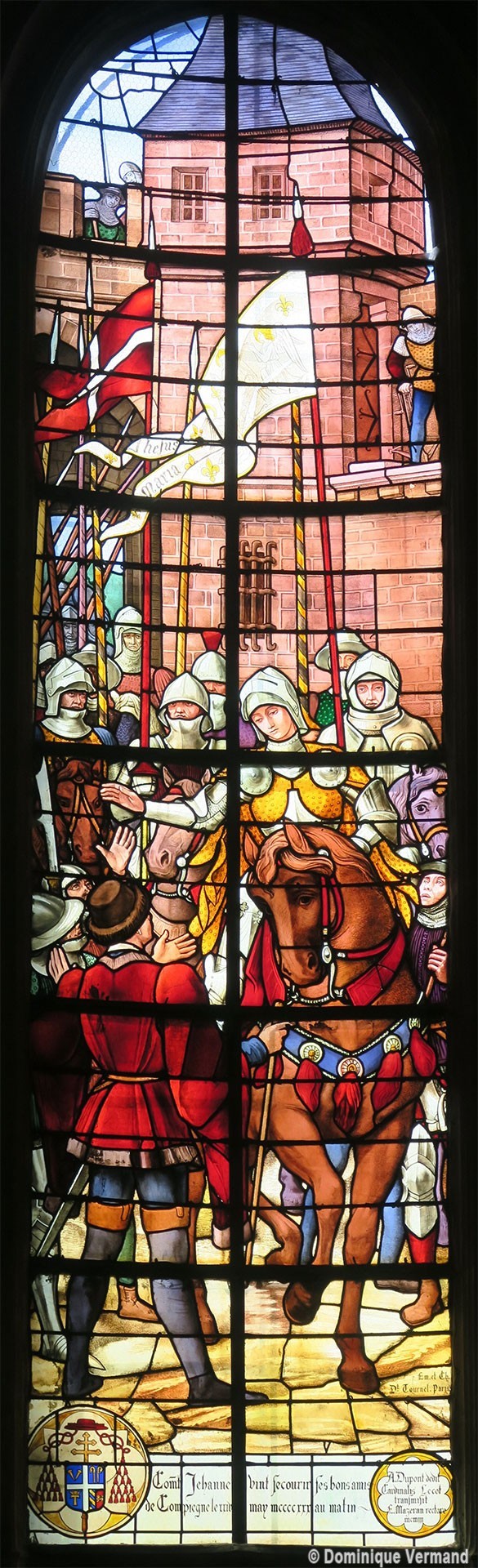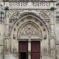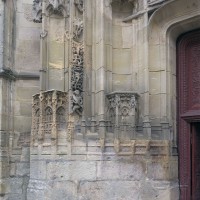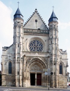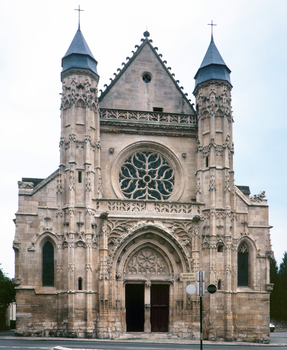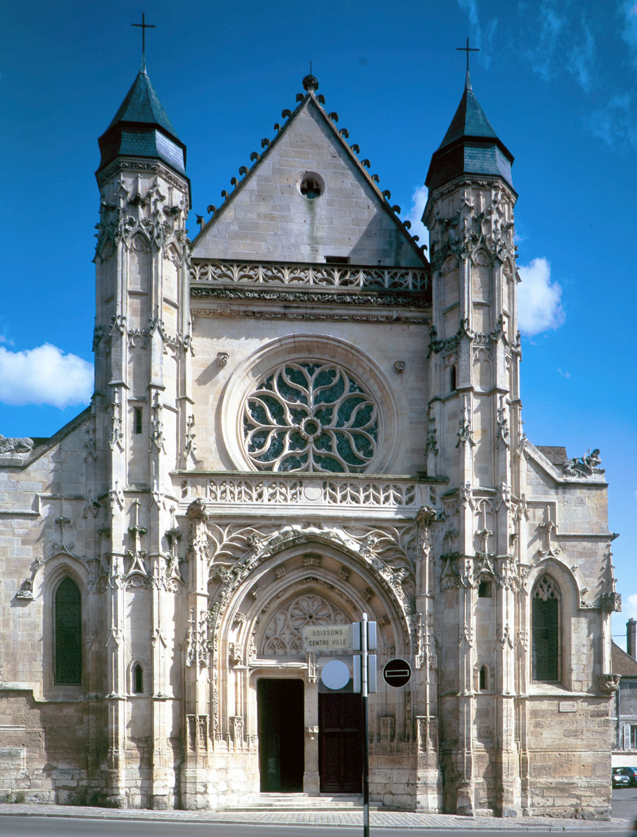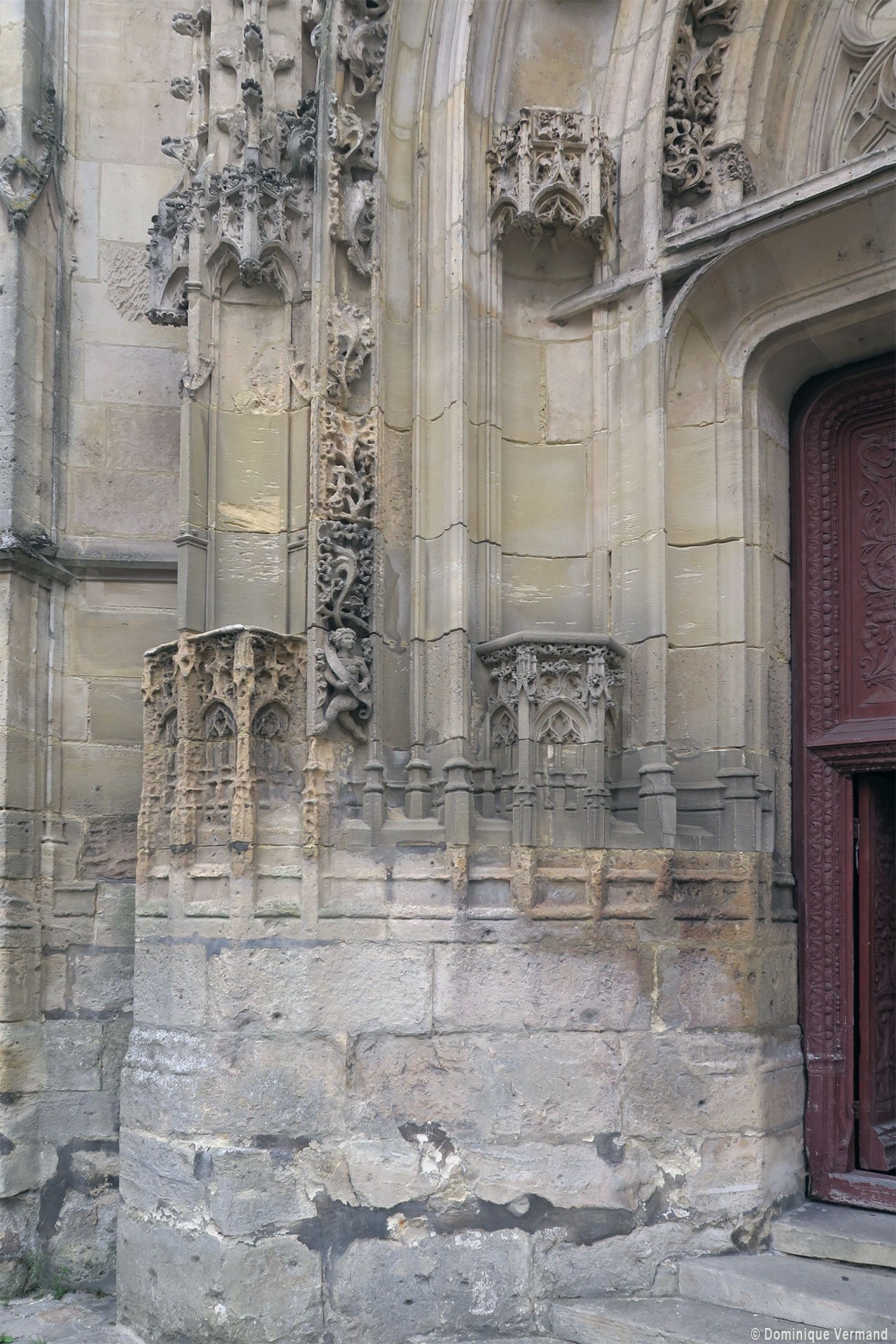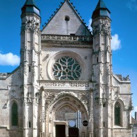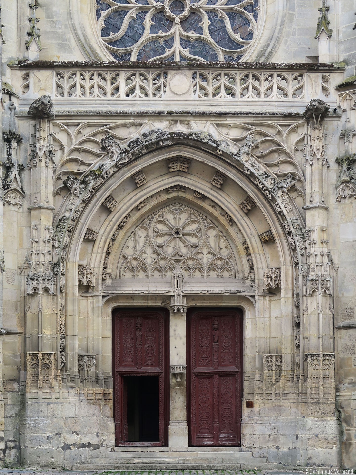 Complétant ces travaux rendus sans doute nécessaires par les destructions consécutives à la guerre de Cent Ans, la façade illustre magnifiquement le style gothique flamboyant. Deux tourelles d’escaliers saillantes et terminées par des clochetons en charpente imposent leur silhouette dans une composition rigoureuse correspondant aux trois vaisseaux de la nef. Très développée, la partie centrale superpose, de part et d’autre d’une balustrade ajourée, un portail – dont le tympan a été refait mais dont les vantaux sont ceux d’origine – et une grande rose. Riche, mais sans excès, le décor souligne les grandes lignes d’une composition qui se retrouvait à la façade de Saint-Corneille dans la même ville.