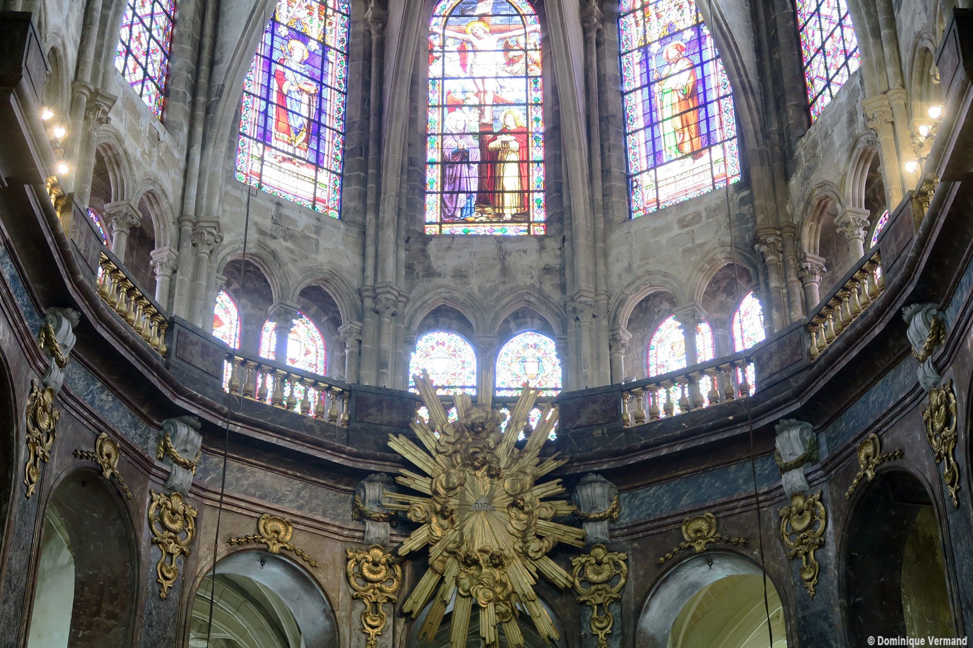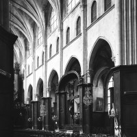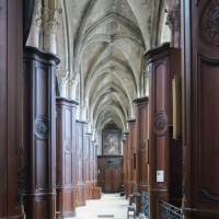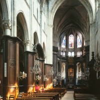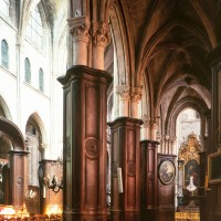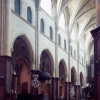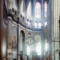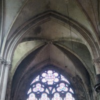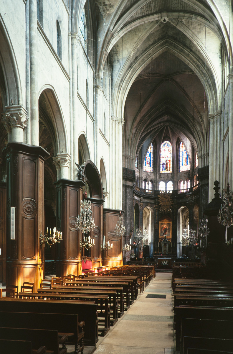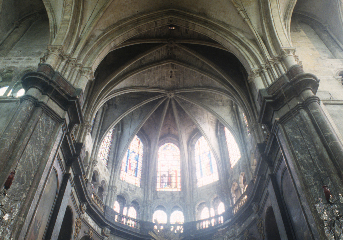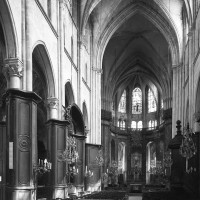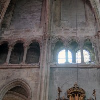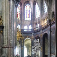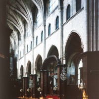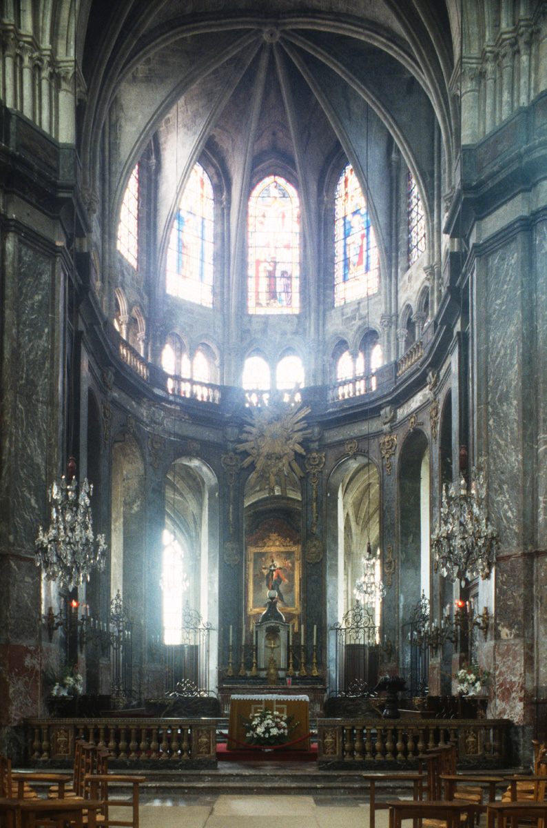 Profondément modifié par la construction du déambulatoire au 16ème siècle et un riche habillage de marbres en 1767-68, le choeur comprenait simplement une courte travée droite et une abside à sept pans. Il était éclairé par trois étages de fenêtres. Celles du premier niveau ont disparu au profit des arcades qui communiquent avec le déambulatoire. Les fenêtres du second niveau s’ouvrent derrière les arcatures du triforium, exemple précoce du triforium ajouré qui connaîtra un grand succès dans la période dite rayonnante de l’architecture gothique.