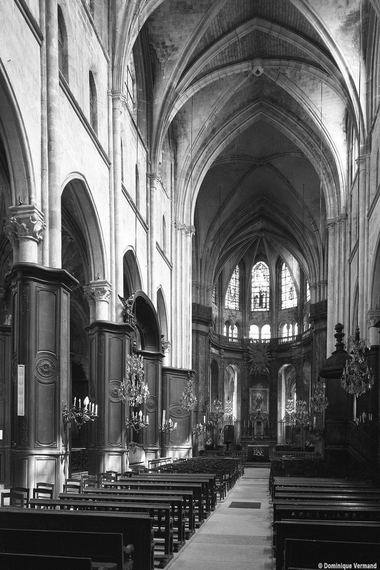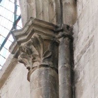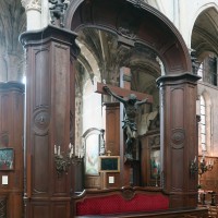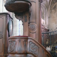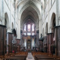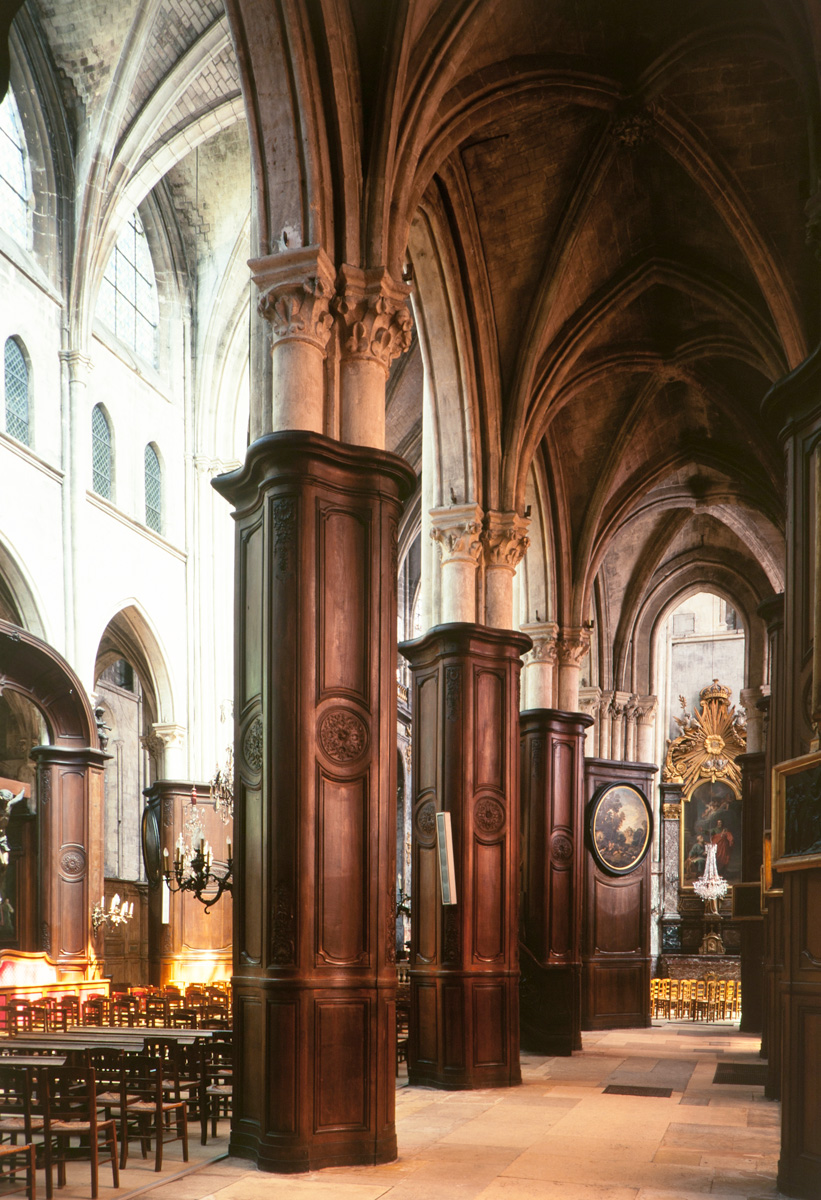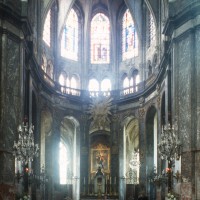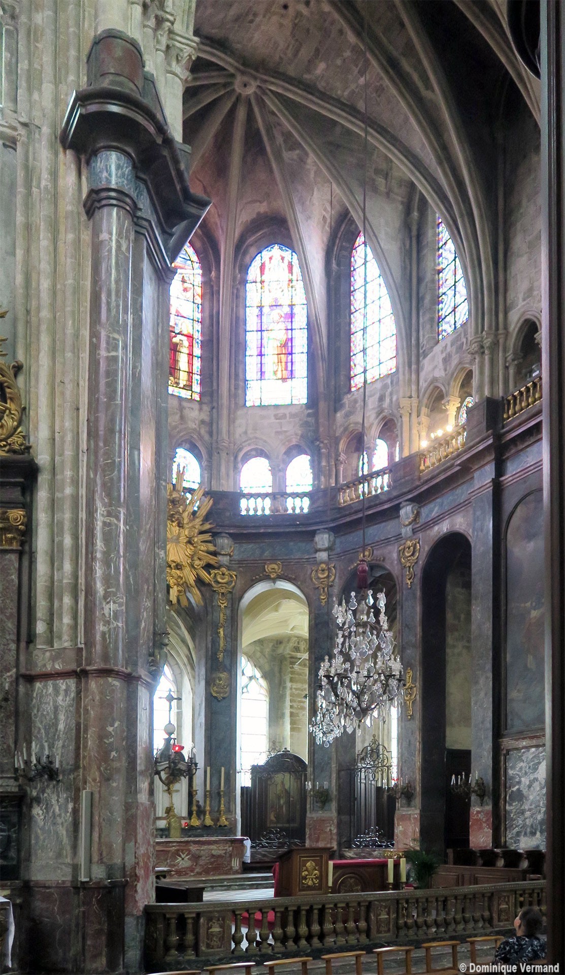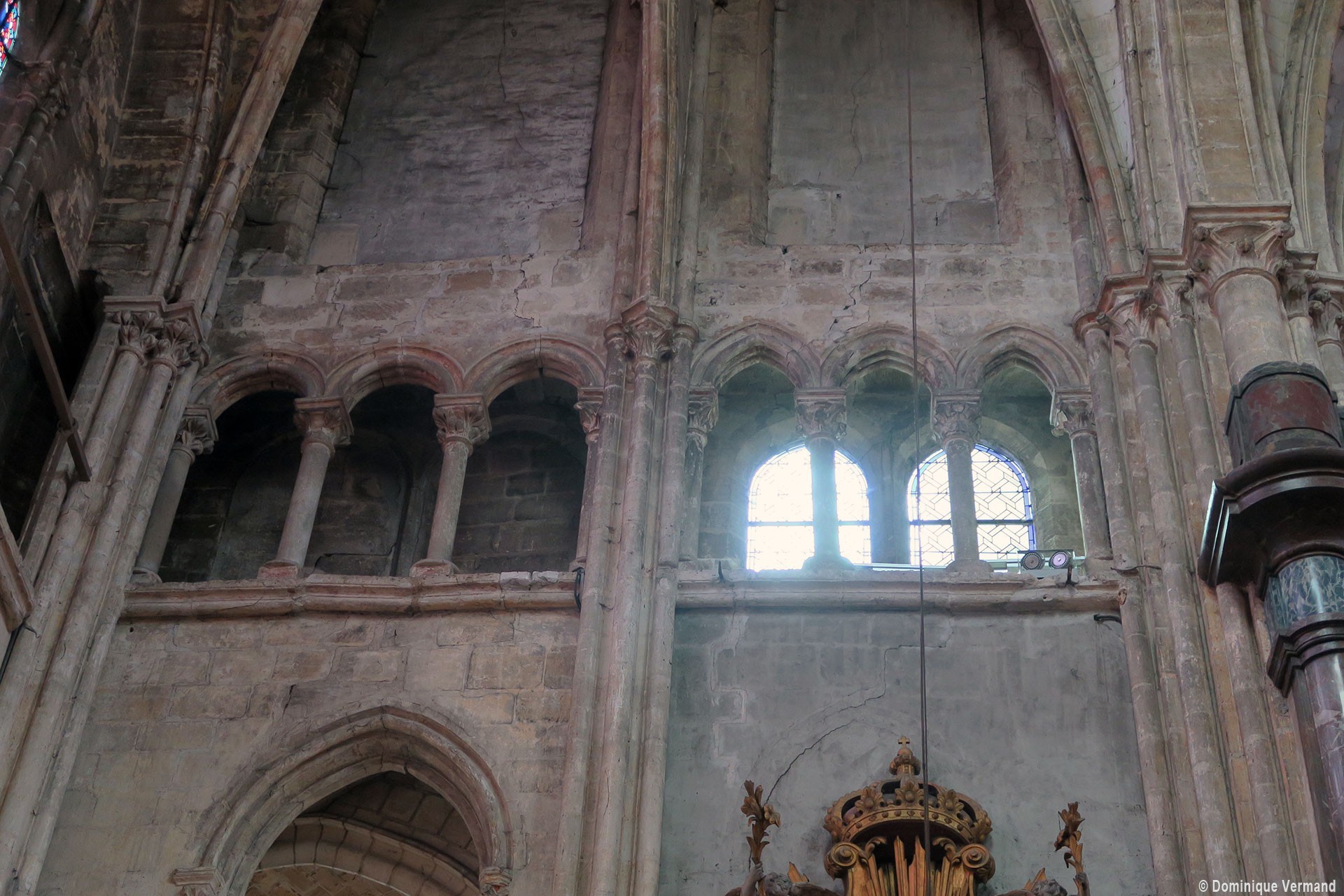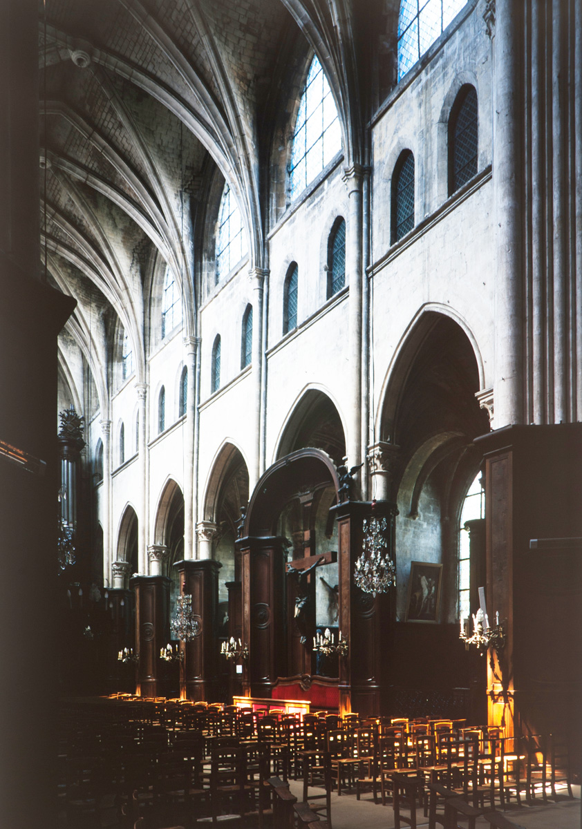 Profondément modifié par la construction du déambulatoire au 16ème siècle et un riche habillage de marbres en 1767-68, le choeur comprenait simplement une courte travée droite et une abside à sept pans. Il était éclairé par trois étages de fenêtres. Celles du premier niveau ont disparu au profit des arcades qui communiquent avec le déambulatoire. Les fenêtres du second niveau s’ouvrent derrière les arcatures du triforium, exemple précoce du triforium ajouré qui connaîtra un grand succès dans la période dite rayonnante de l’architecture gothique.