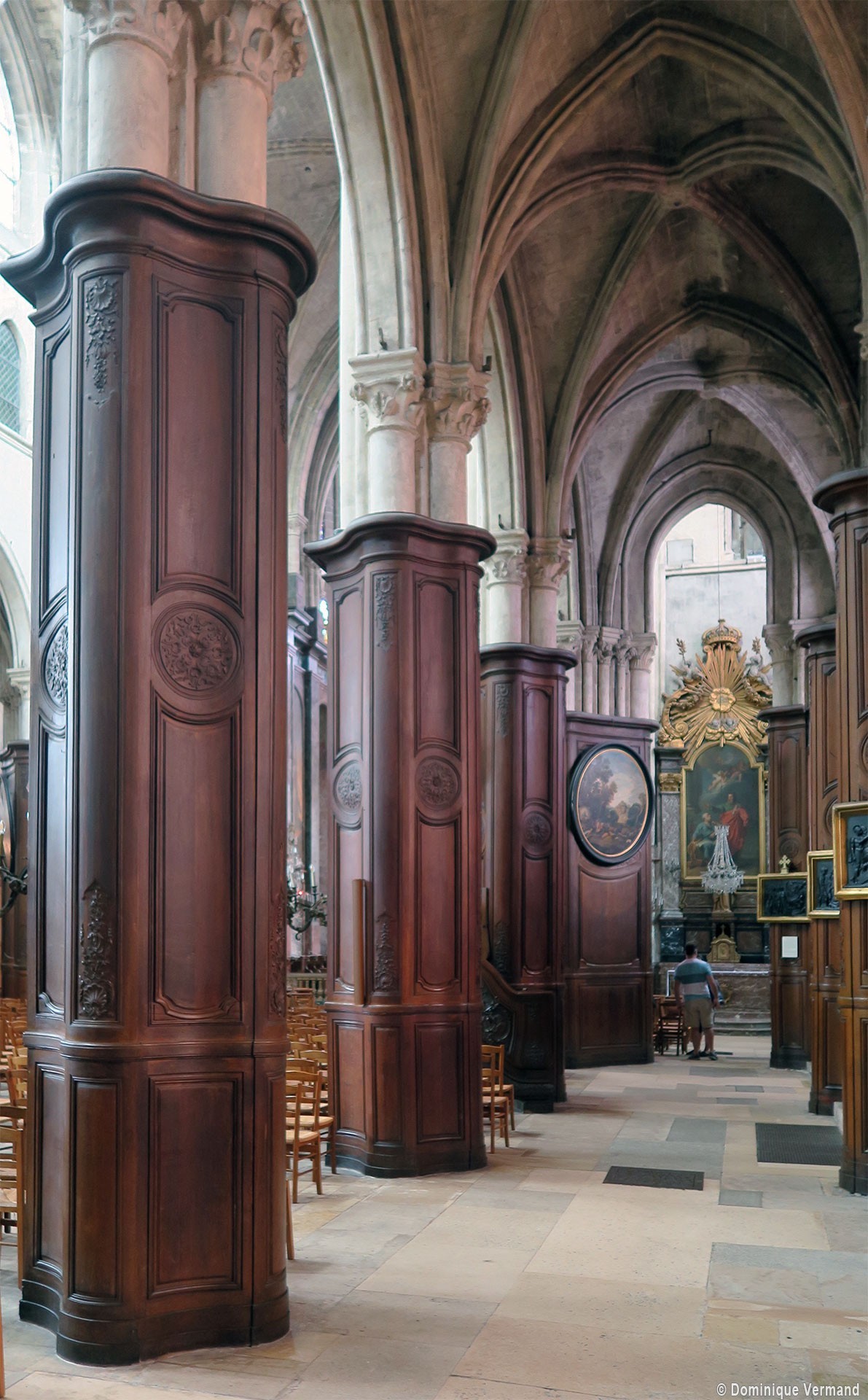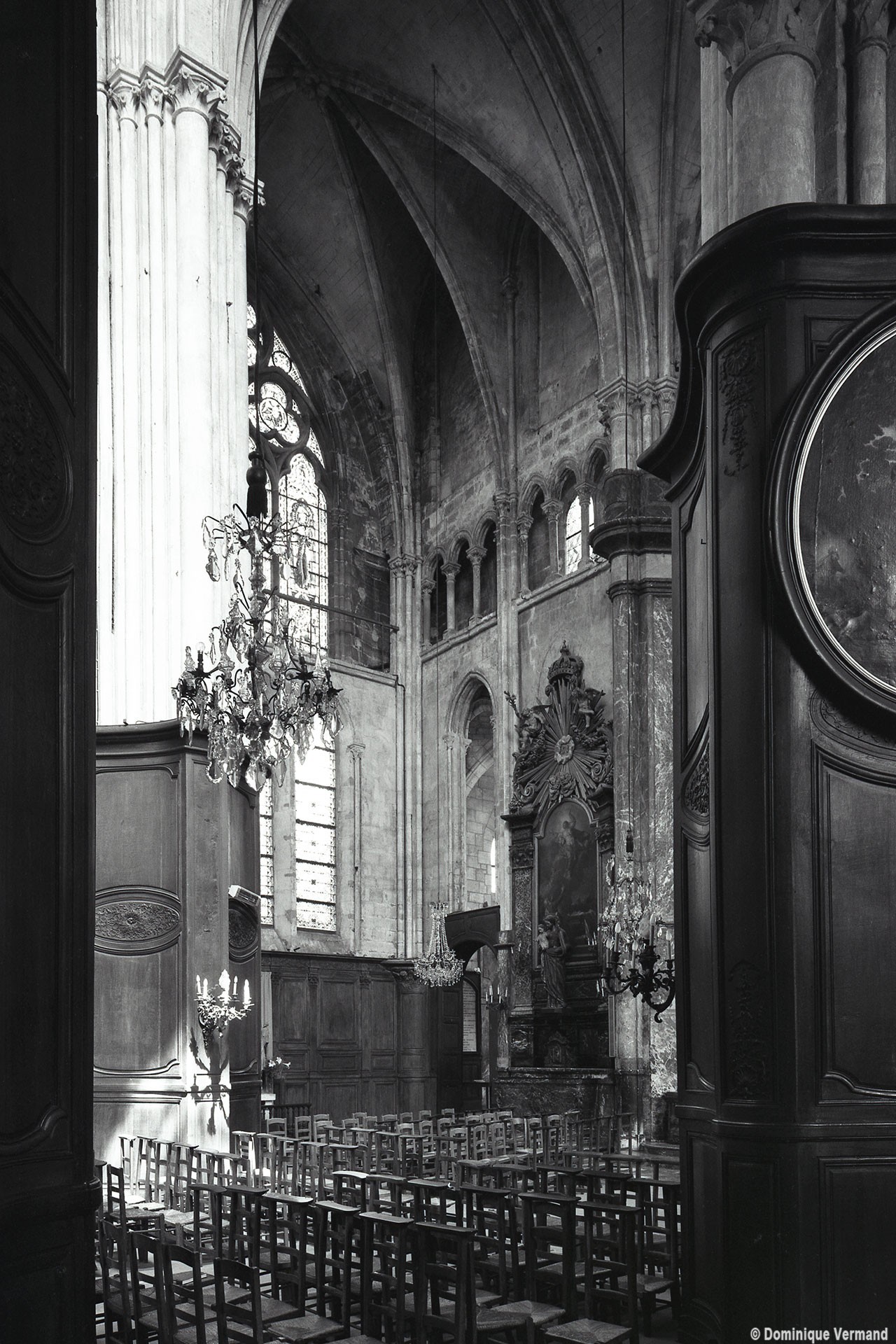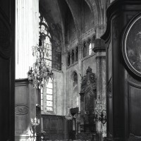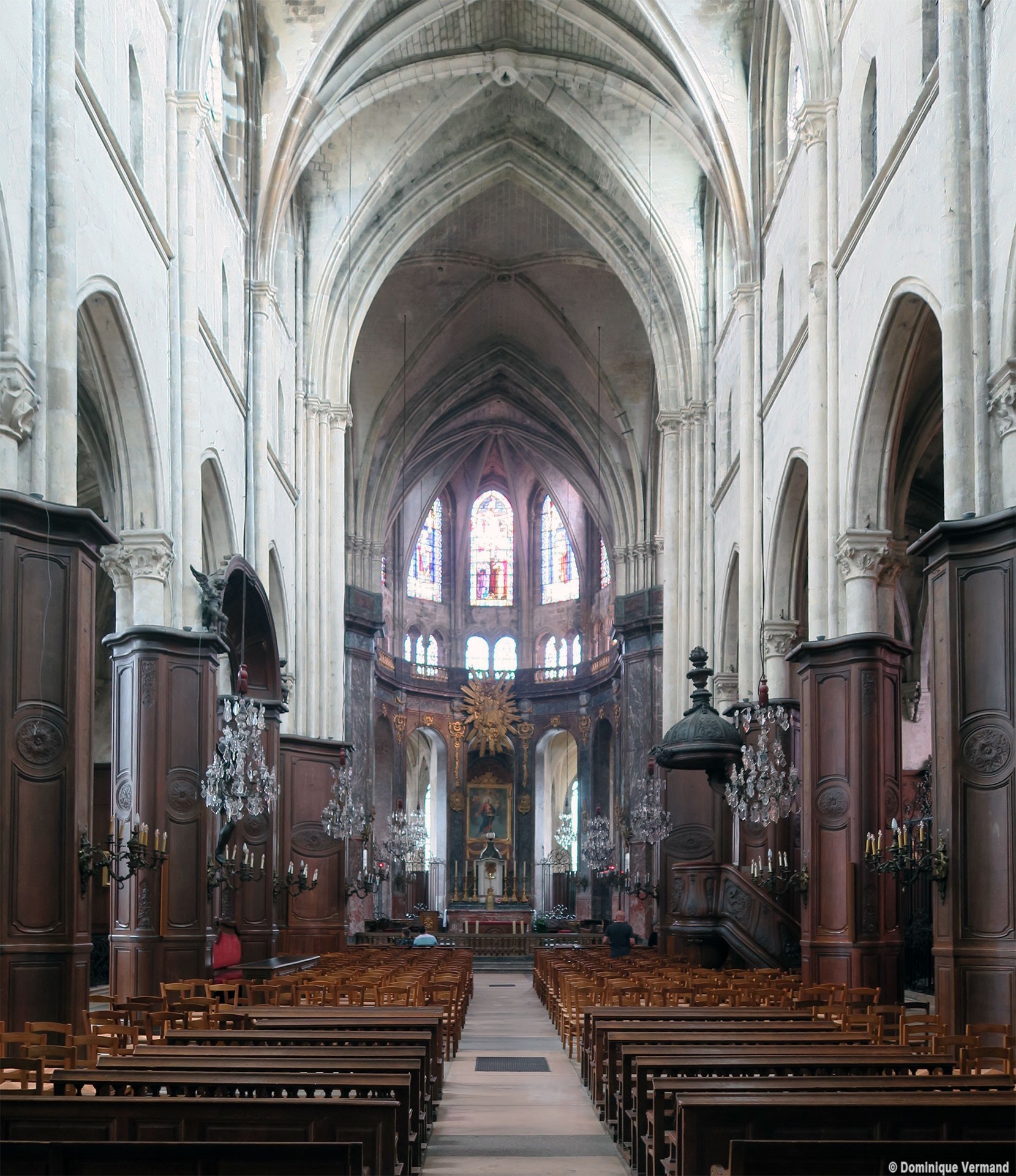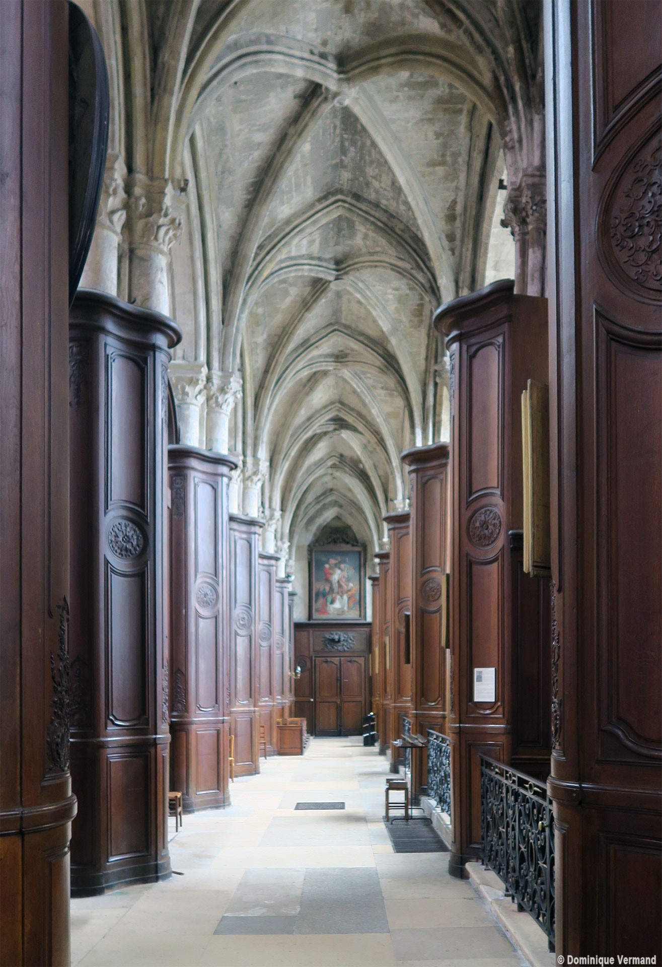 Profondément modifié par la construction du déambulatoire au 16ème siècle et un riche habillage de marbres en 1767-68, le choeur comprenait simplement une courte travée droite et une abside à sept pans. Il était éclairé par trois étages de fenêtres. Celles du premier niveau ont disparu au profit des arcades qui communiquent avec le déambulatoire. Les fenêtres du second niveau s’ouvrent derrière les arcatures du triforium, exemple précoce du triforium ajouré qui connaîtra un grand succès dans la période dite rayonnante de l’architecture gothique.