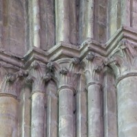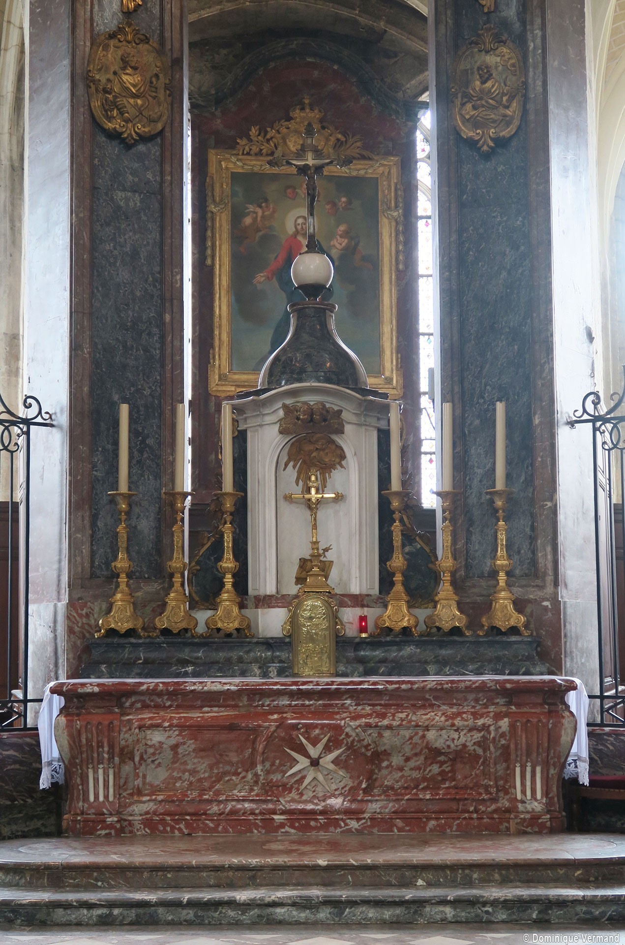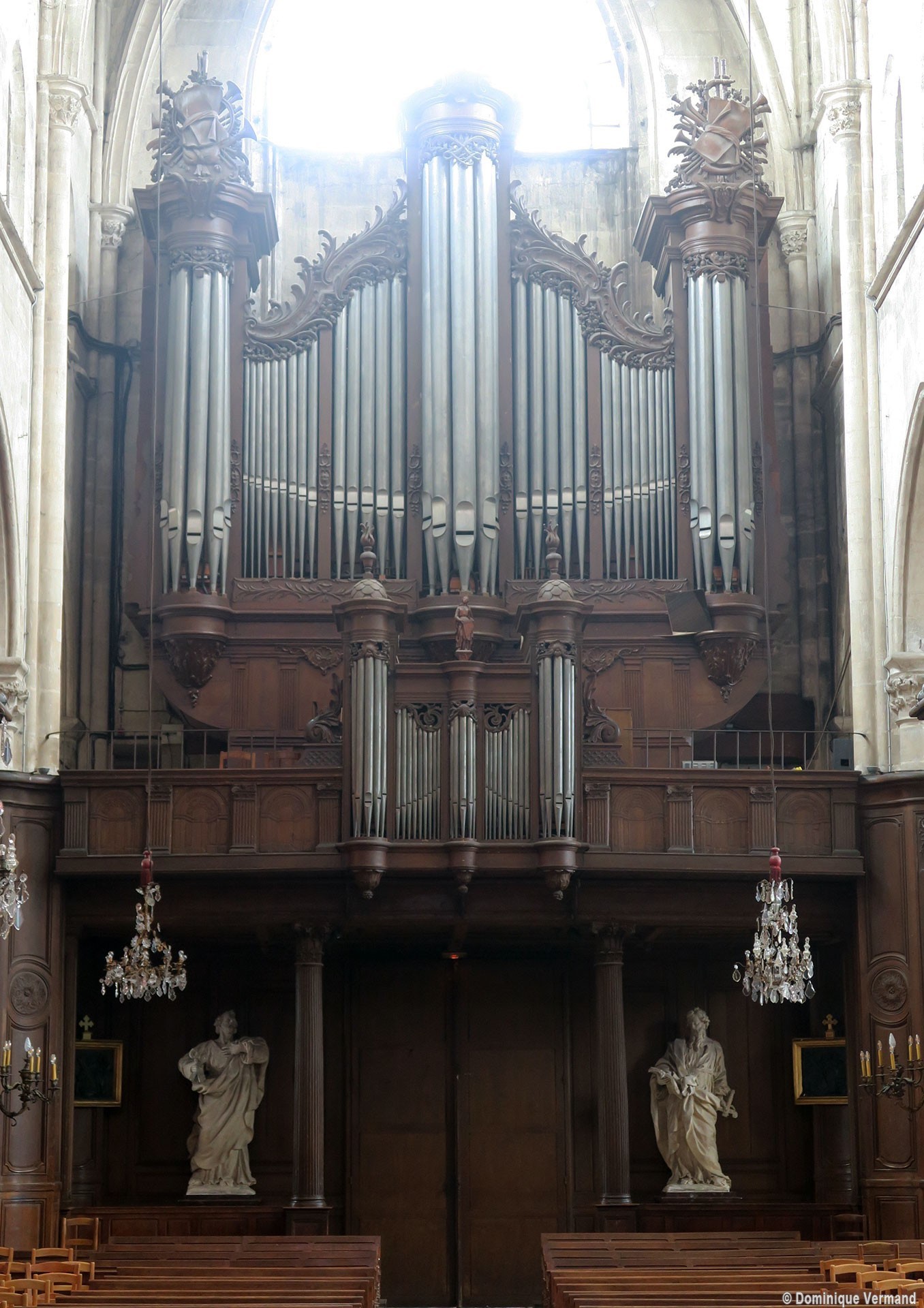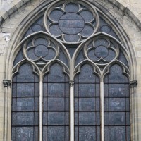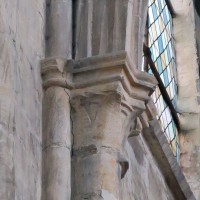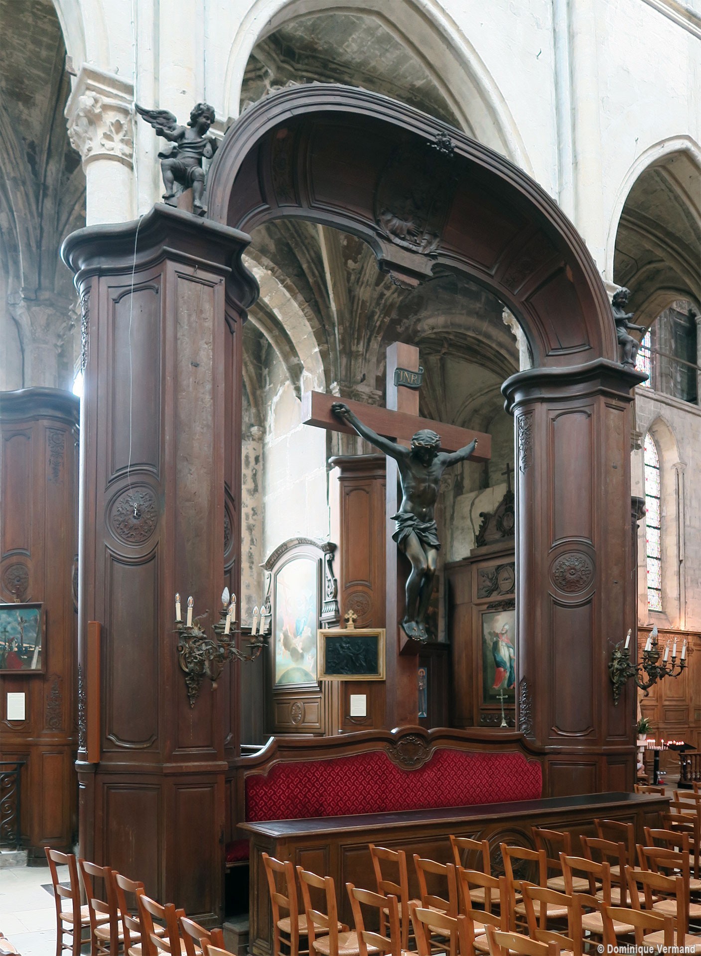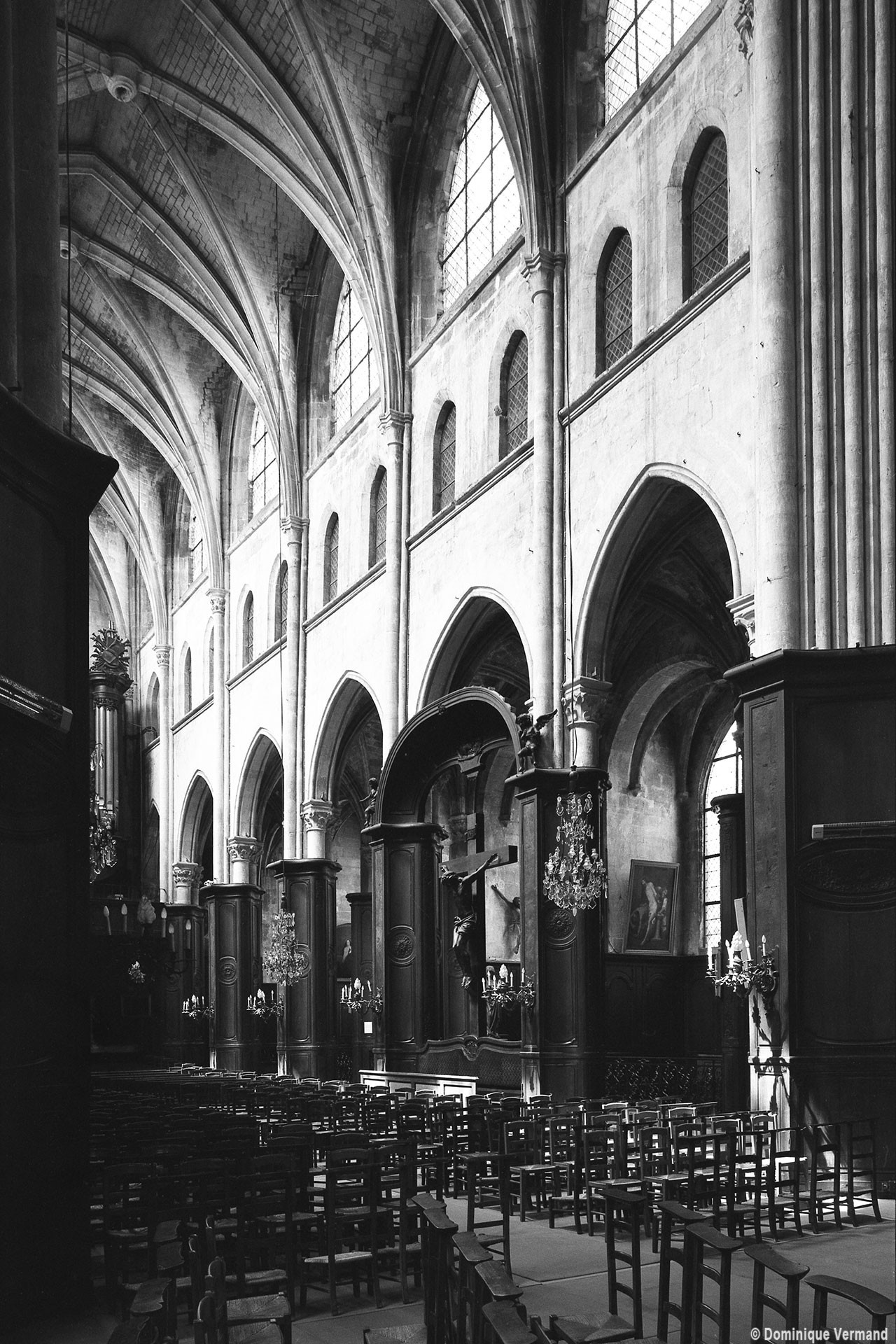 Profondément modifié par la construction du déambulatoire au 16ème siècle et un riche habillage de marbres en 1767-68, le choeur comprenait simplement une courte travée droite et une abside à sept pans. Il était éclairé par trois étages de fenêtres. Celles du premier niveau ont disparu au profit des arcades qui communiquent avec le déambulatoire. Les fenêtres du second niveau s’ouvrent derrière les arcatures du triforium, exemple précoce du triforium ajouré qui connaîtra un grand succès dans la période dite rayonnante de l’architecture gothique.