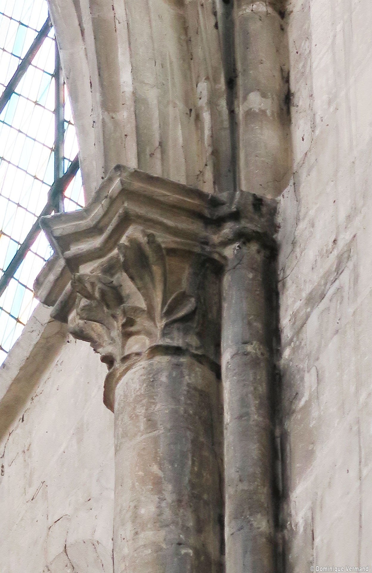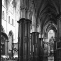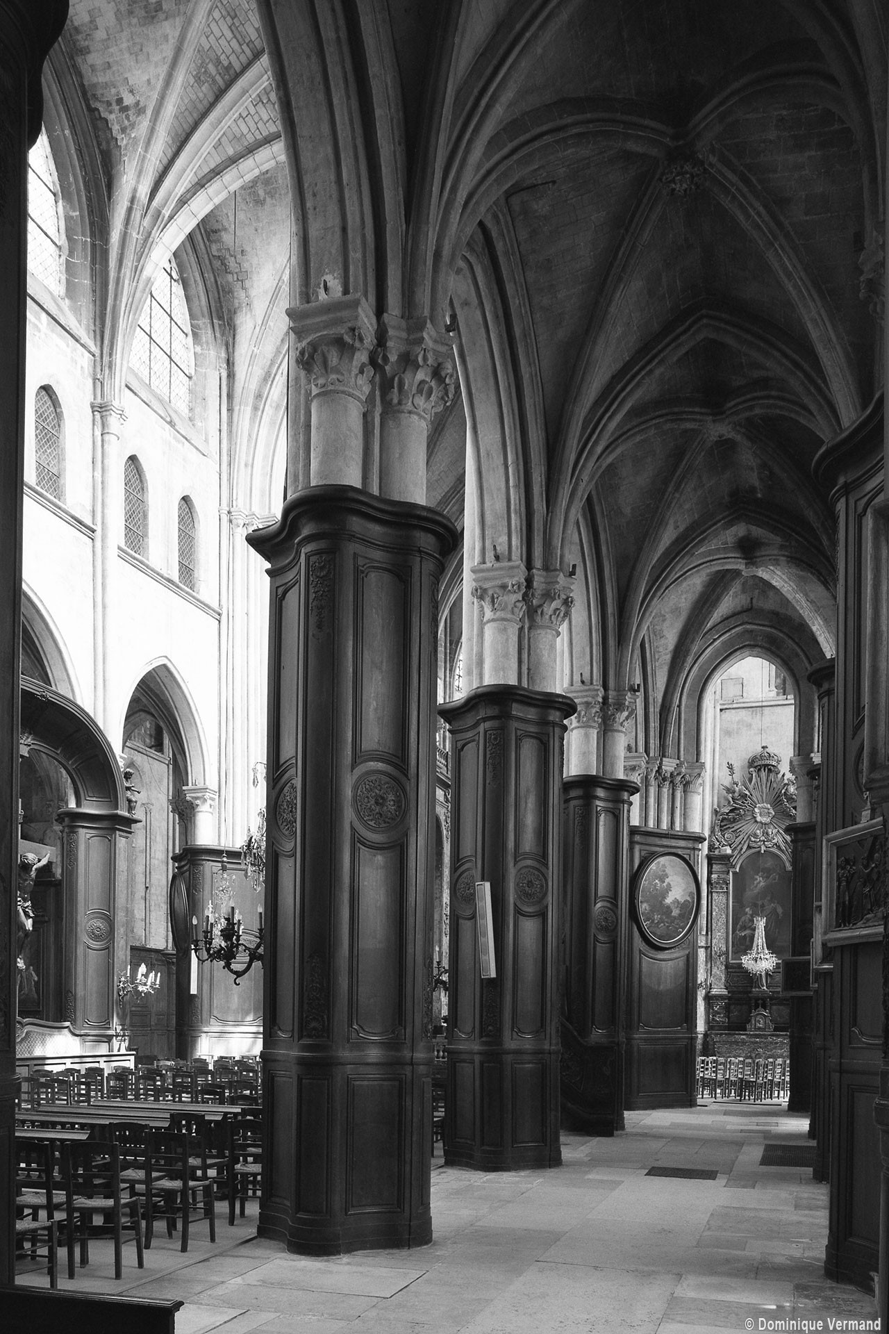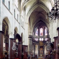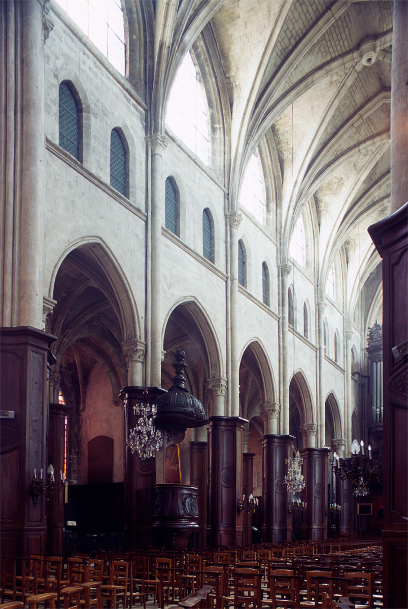 Construite d’est en ouest entre 1240 et 1270 environ, la nef ne reçut ses voûtes que sous Louis XI, en 1476-1477. Malgré des qualités indéniables, les boiseries du 18ème siècle qui habillent les piliers ne permettent plus d’apprécier à sa juste valeur la belle architecture de cette nef, à la fois sobre et raffinée. Visibles seulement en partie haute, les piliers sont remarquables de minceur, le noyau central ayant pratiquement disparu au profit des demi-colonnes associées à la retombée des arcades et des voûtes. On observera tout particulièrement l’unique chapiteau à tailloir en étoile qui, vers le bas-côté, reçoit ogives, doubleau et formerets, tous de même importance et de profil identique. A la même époque, l’extraordinaire église abbatiale de Saint-Martin-aux-Bois, au nord-ouest de Compiègne, en proposera une variante encore plus aboutie et raffinée. Au-dessus des grandes arcades, les parties hautes sont traitées avec une grande sobriété : étage intermédiaire ajouré simplement de deux lancettes donnant sur les combles et étage supérieur – de la fin du 15ème siècle – assez court et occupé tout entier par une fenêtre sans réseau.