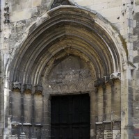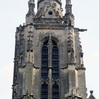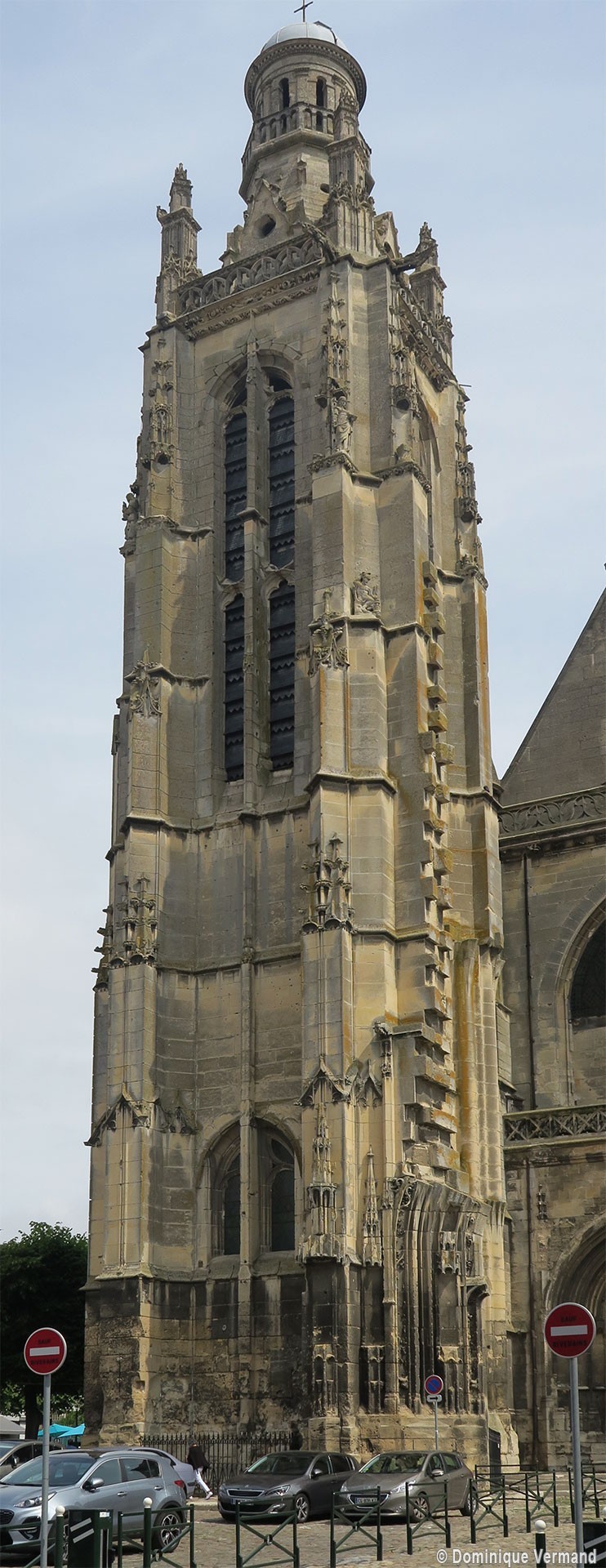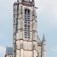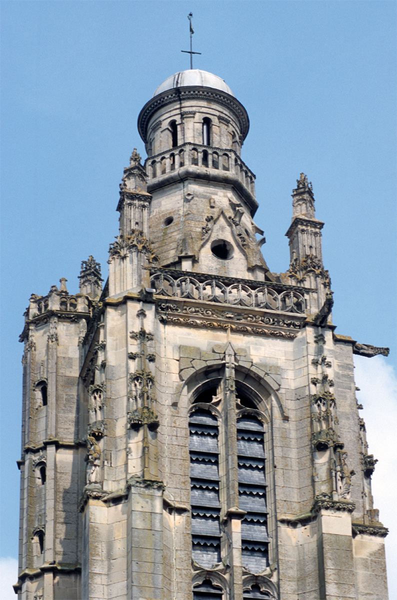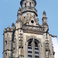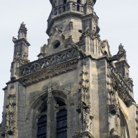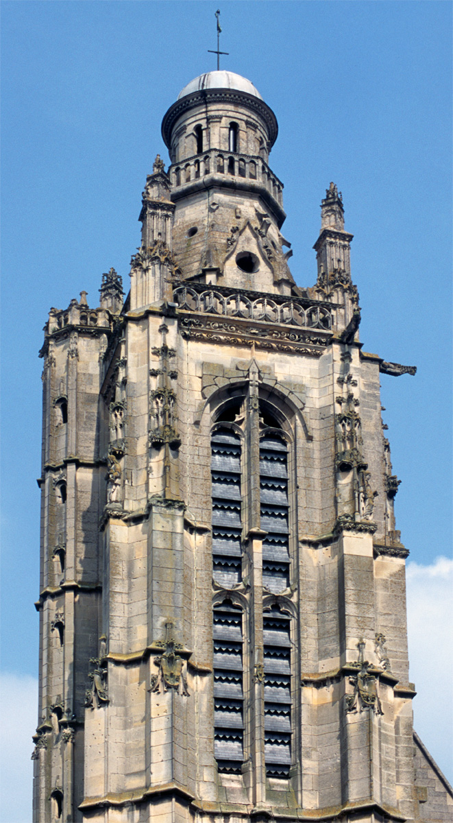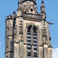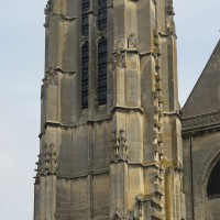 Inachevée (un porche et une seconde tour était sans doute prévus) et mutilée (la Résurrection qui ornait le tympan du portail a été détruite à la Révolution), la façade est dominée par la haute tour à balustrade – dite tour Saint-Jacques – entreprise vers 1460 dans le style gothique flamboyant et terminée par la construction d’un lanternon à deux étages au 17ème siècle. Une immense baie recoupée par un meneau intermédiaire l’ajoure sur chacune de ses faces.