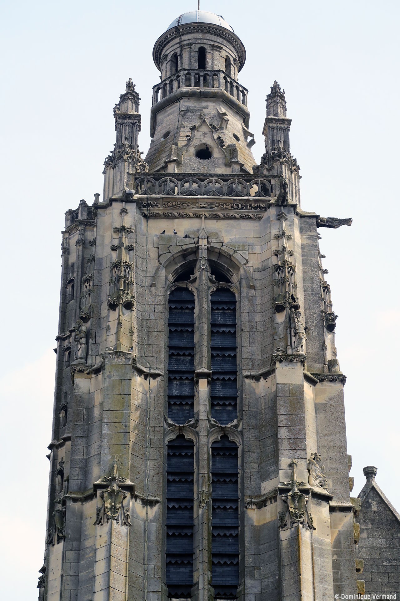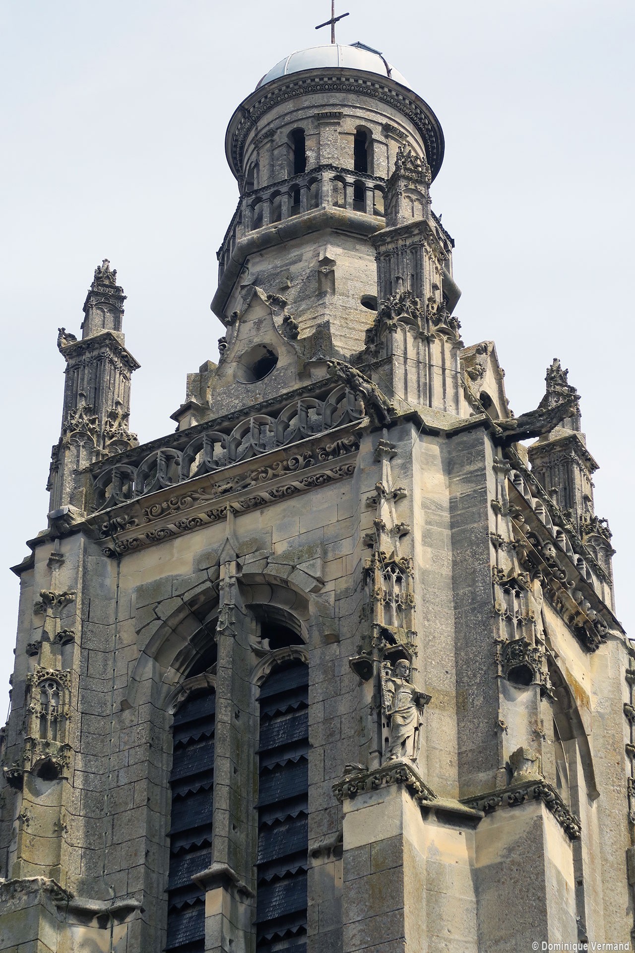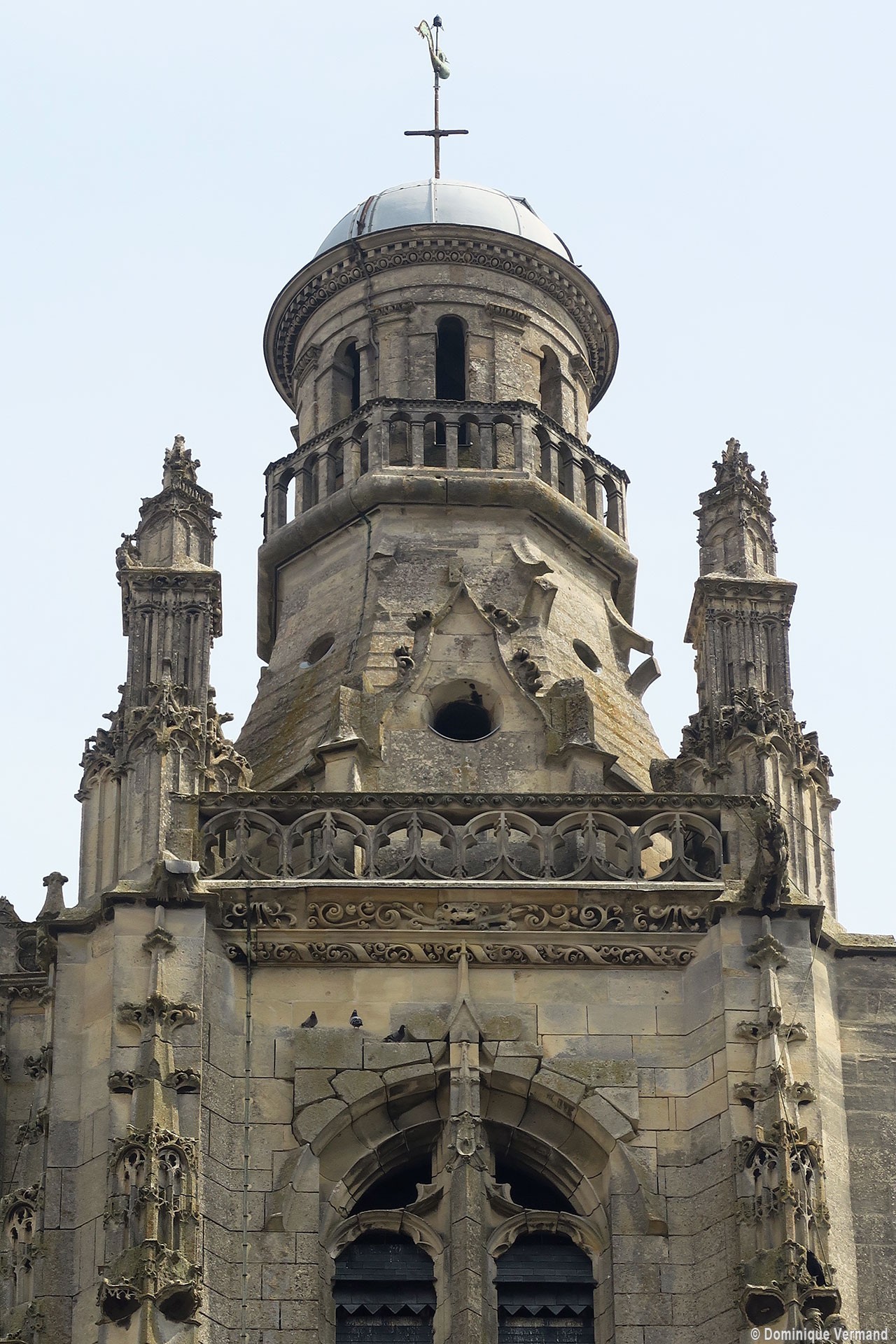 Inachevée (un porche et une seconde tour était sans doute prévus) et mutilée (la Résurrection qui ornait le tympan du portail a été détruite à la Révolution), la façade est dominée par la haute tour à balustrade – dite tour Saint-Jacques – entreprise vers 1460 dans le style gothique flamboyant et terminée par la construction d’un lanternon à deux étages au 17ème siècle. Une immense baie recoupée par un meneau intermédiaire l’ajoure sur chacune de ses faces.