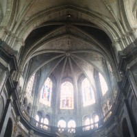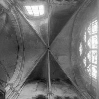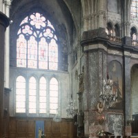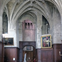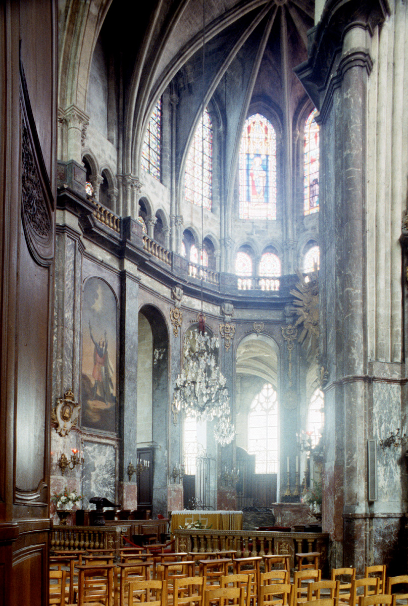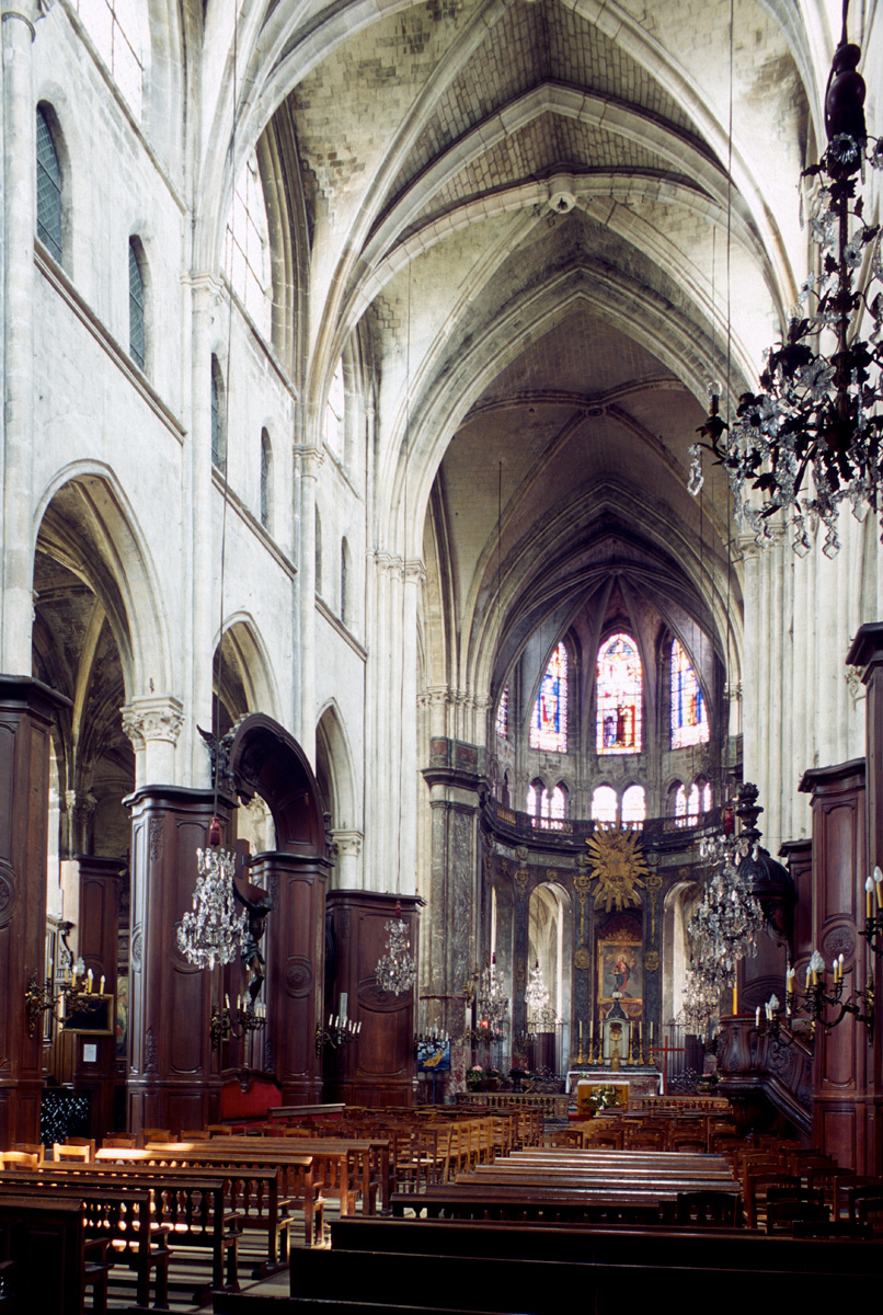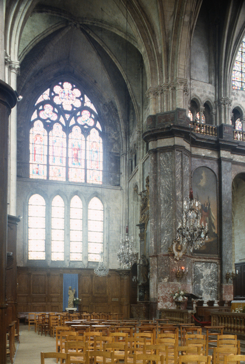 Dans ses dispositions premières, cette abside est à rapprocher de plusieurs réalisations du début du 13ème siècle comme Saint-Léger de Soissons et Saint-Yved de Braine, dans l’Aisne, ou encore La Chapelle-sur-Crécy et Vaudoy-en-Brie, en Seine-et-Marne. Les bras du transept, dont les deux niveaux supérieurs continuent l’élévation du choeur, présentent la particularité d’être couverts chacun d’une voûte sexpartite (c’est-à-dire à six compartiments), un type courant durant la seconde moitié du 12ème siècle mais dont l’usage a pratiquement disparu à l’époque de la construction de Saint-Jacques. Les grandes baies de style rayonnant qui ajourent le mur de fond de chacun de ces croisillons sont une invention du 19ème siècle.