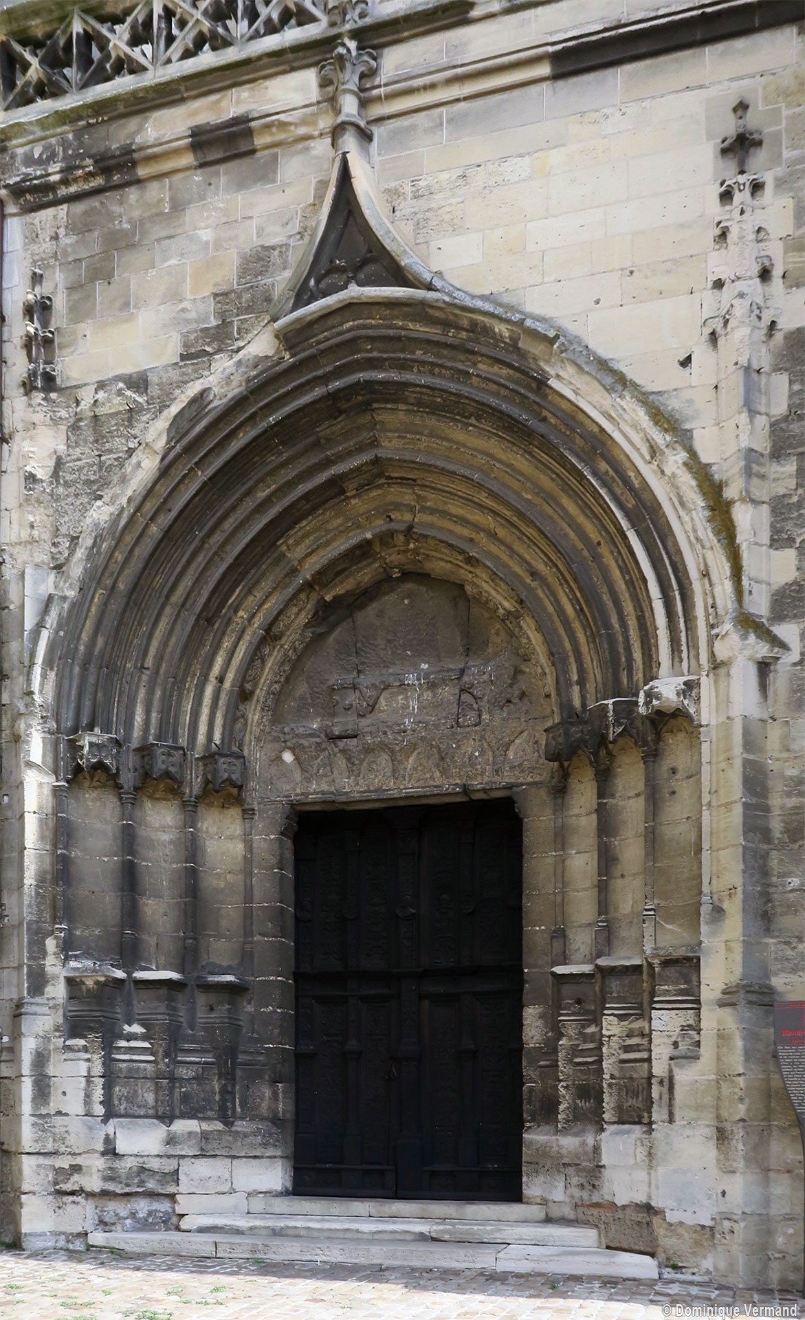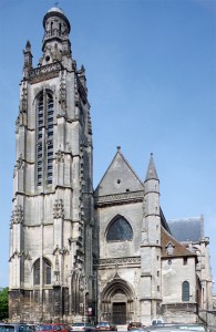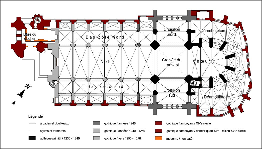 Longue de 51 mètres, l’église comprend une nef de six travées avec bas-côtés et chapelles établies postérieurement entre les contreforts, un transept autrefois débordant et une abside qu’entoure un large déambulatoire plus tardif dont le plan très irrégulier est à mettre en relation avec le milieu urbain très dense qui existait lorsqu’il fut construit. Une haute tour est bâtie pratiquement en hors oeuvre à l’ouest du bas-côté nord. Comme bien souvent, ce plan reflète les vicissitudes qui ont jalonné l’histoire de l’édifice, inachevé lorsque survint la Guerre de Cent Ans et objet de nombreux ajouts, modifications et restaurations ensuite. Si le style gothique tardif domine à l’extérieur, l’église n’en est pas moins, pour l’essentiel, une construction du 13ème siècle, réalisée en trois campagnes principales de 1230 (choeur et transept) à 1270 environ (travées ouest de la nef).