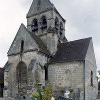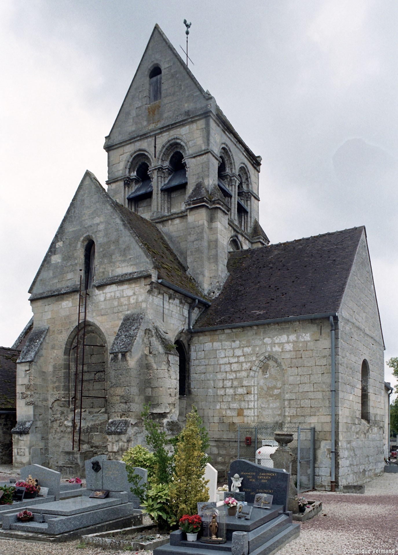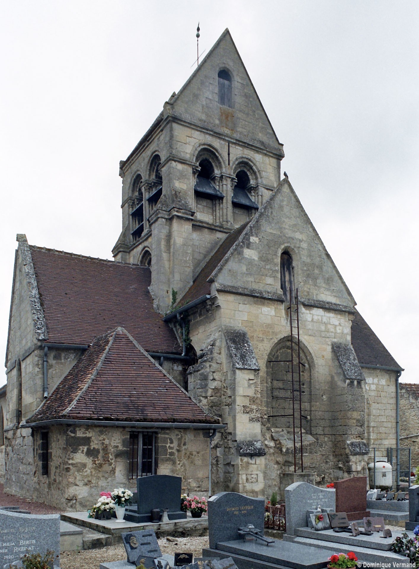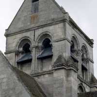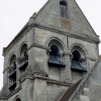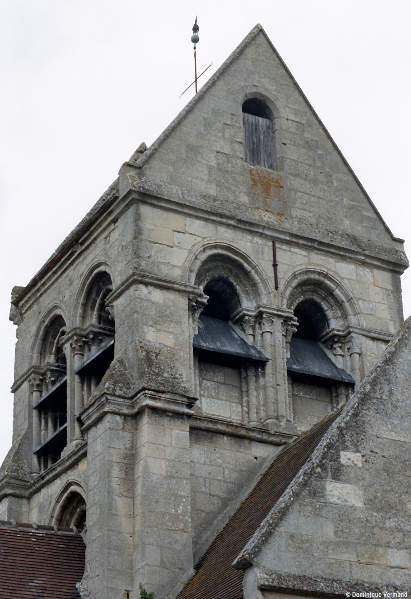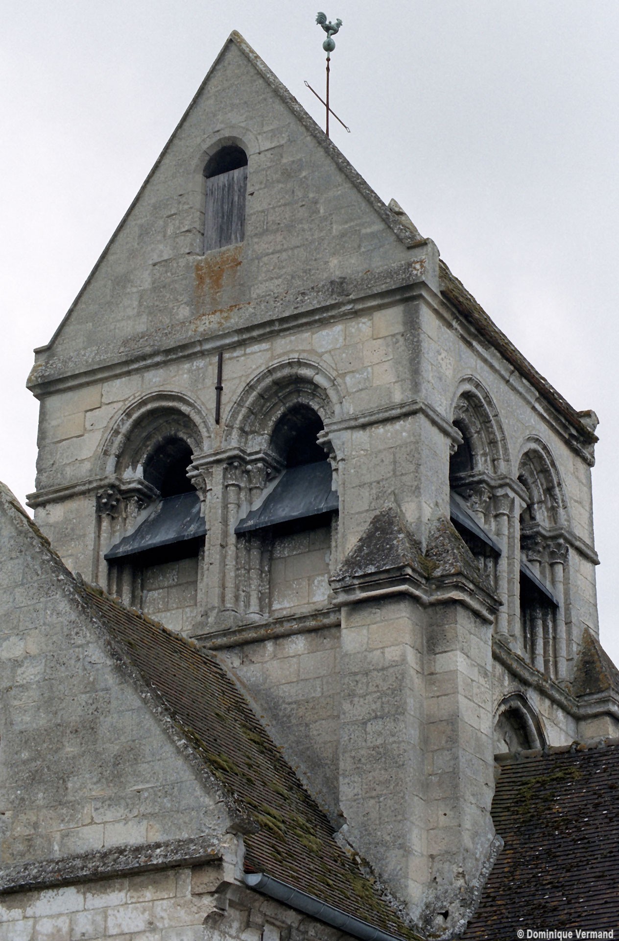 La même qualité prévaut au clocher, à l’origine bien mieux dégagé puisque l’église ne comportait pas de croisillons. Couvert d’un toit en bâtière, il comporte deux étages. Le premier, qui forme soubassement, est percé sur ses faces nord et sud d’une baie en partie masquée par la toiture des croisillons. Les contreforts d’angle se terminent dès ce niveau, où ils s’amortissent d’une manière élégante par un petit glacis triangulaire. L’étage du beffroi est percé de deux baies géminées sur chaque face. Comme au portail, chaque baie comporte deux ressauts adoucis par un tore et reçus sur quatre colonnettes par l’intermédiaire de chapiteaux à crochets. Bien que de dimensions modestes, Notre-Dame est un excellent exemple de l’exceptionnelle qualité atteinte par l’architecture religieuse du Soissonnais au 12ème siècle (2009).