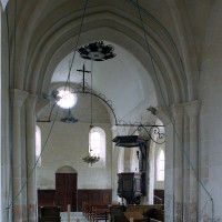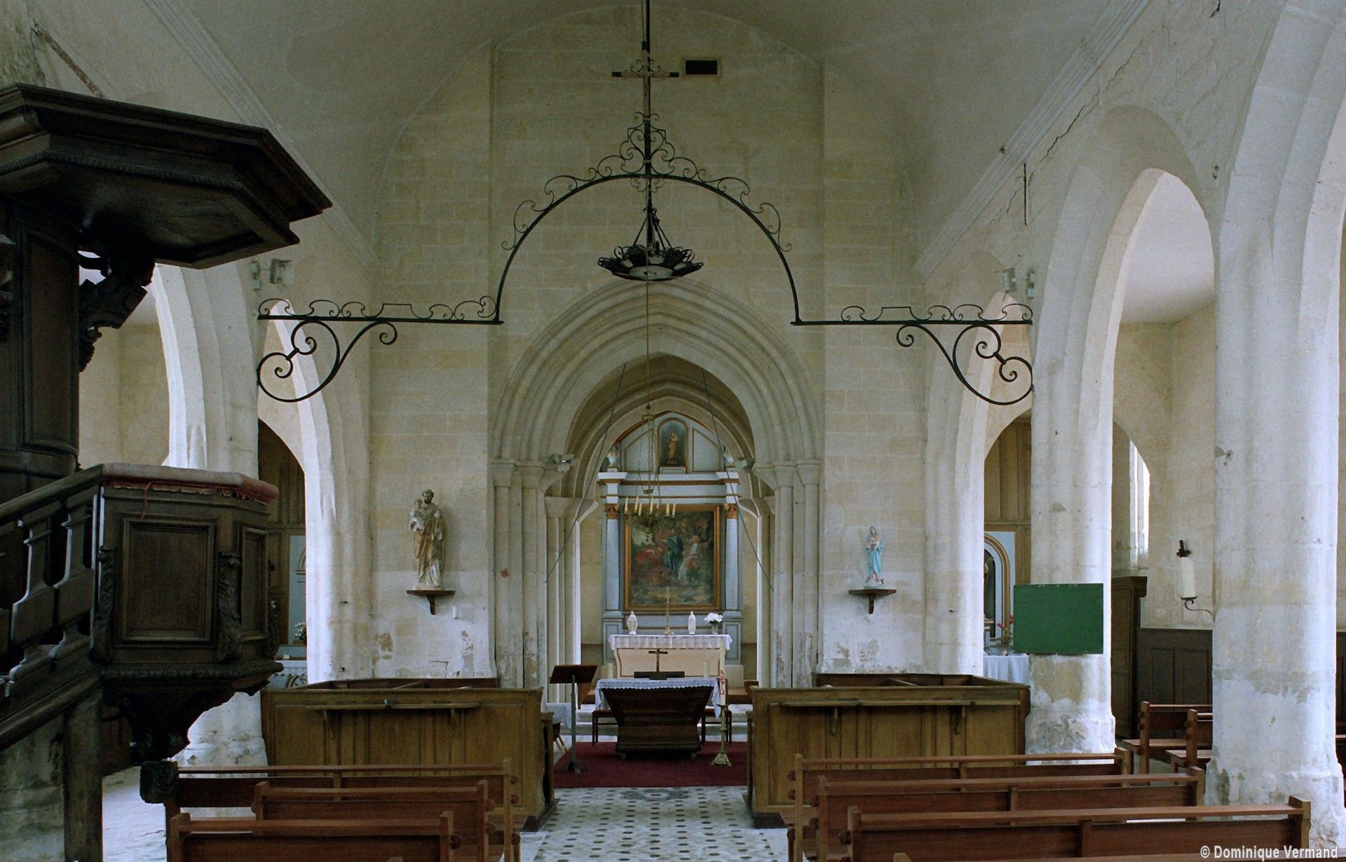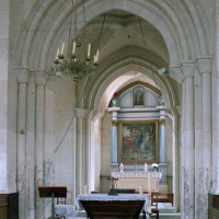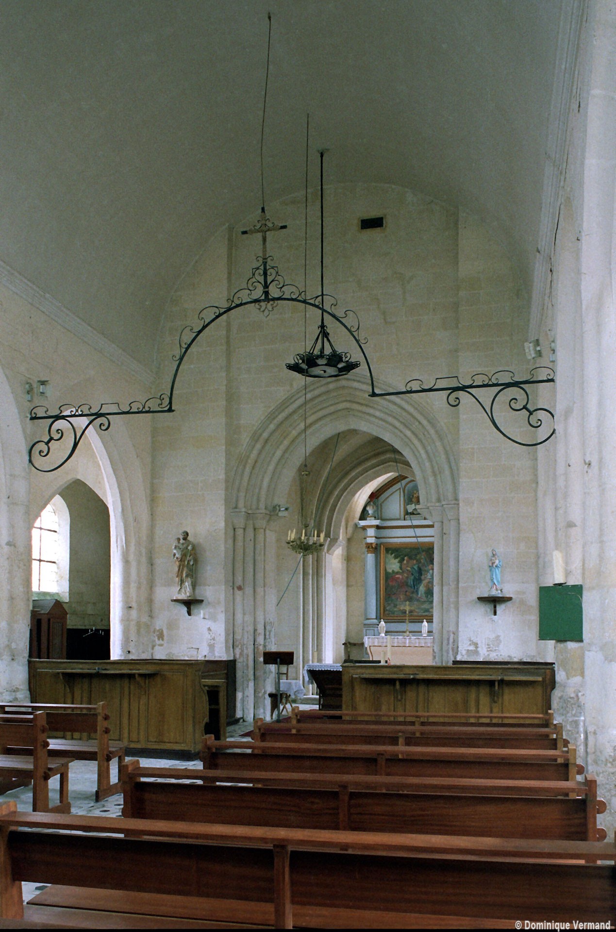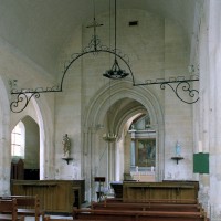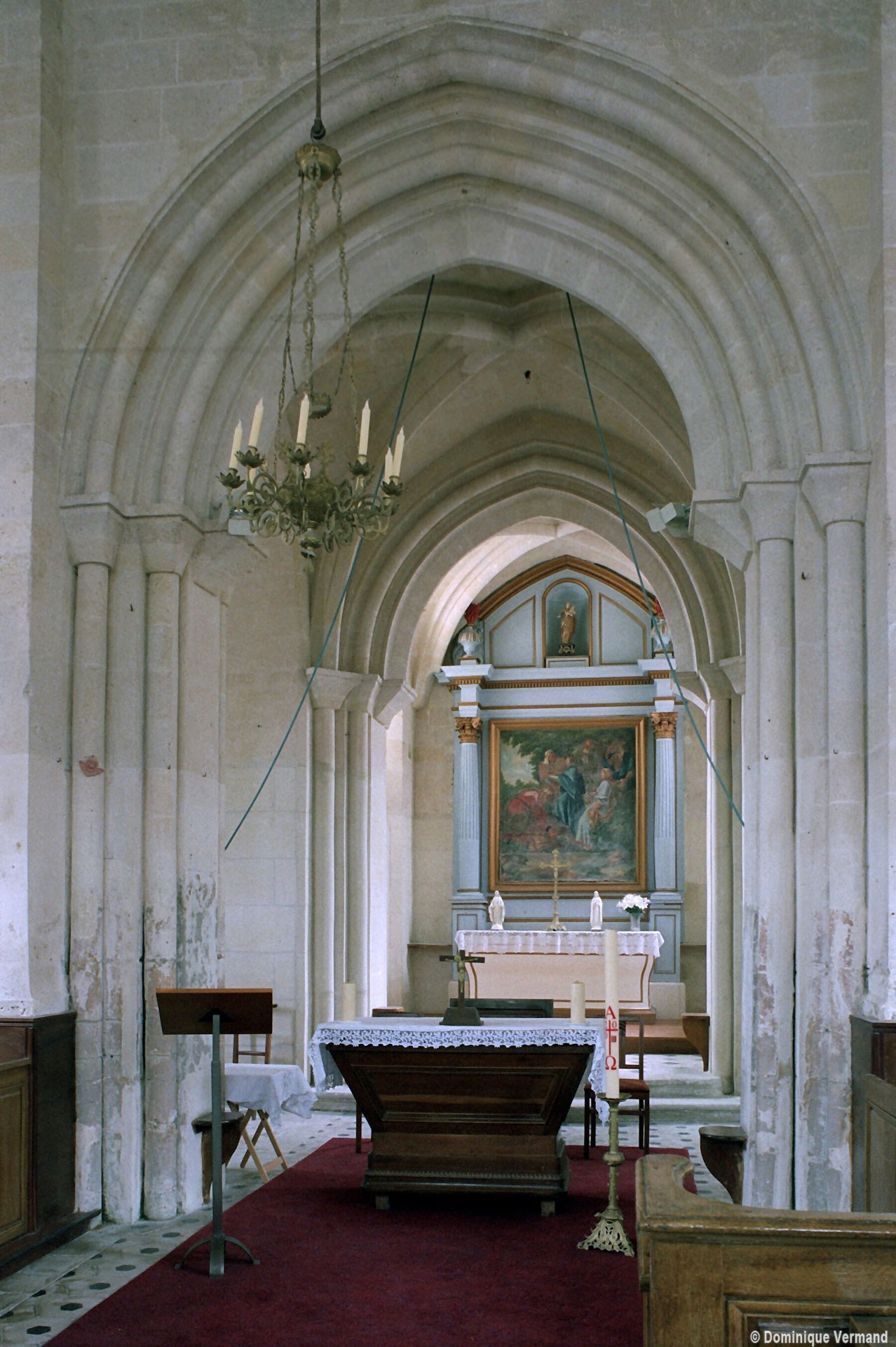 L’édifice du 12ème siècle vaut avant tout pour sa façade et son clocher car le chœur a subi une restauration tellement drastique à la fin du 19ème siècle qu’il en a perdu toute authenticité, tous les chapiteaux d’origine, notamment, ayant disparu. Tout au plus peut-on noter la riche mouluration de l’arc triomphal (arc qui ouvre le chœur sur la nef).