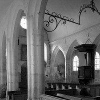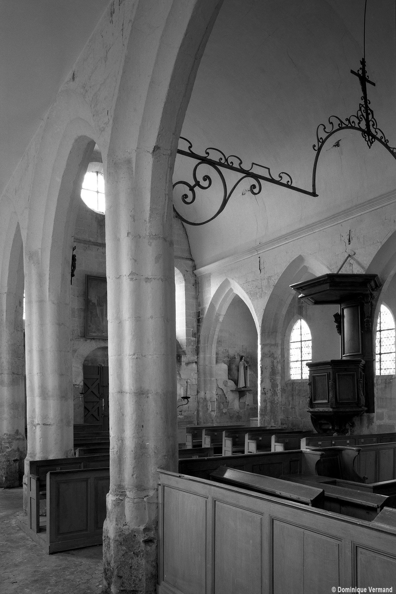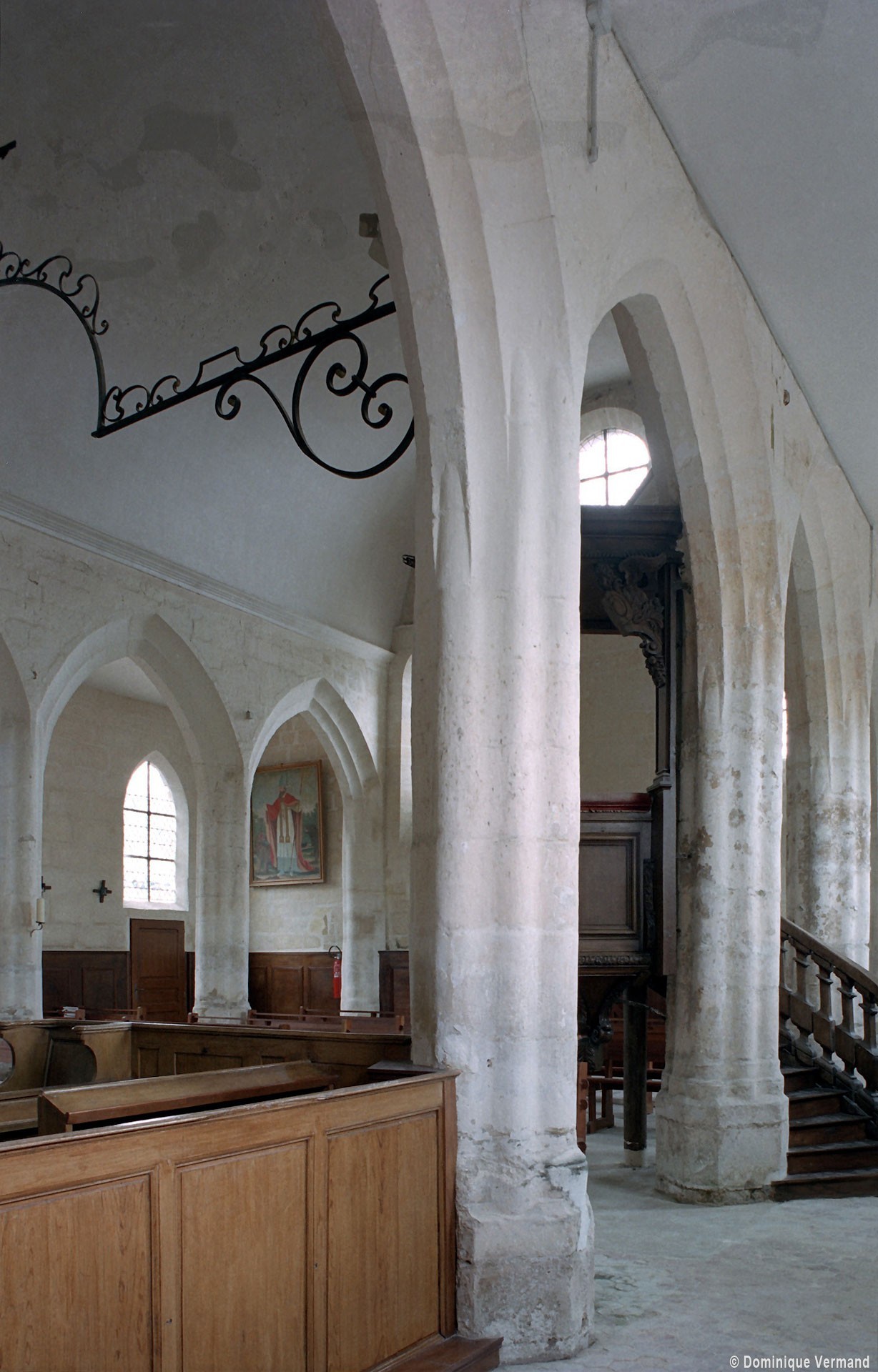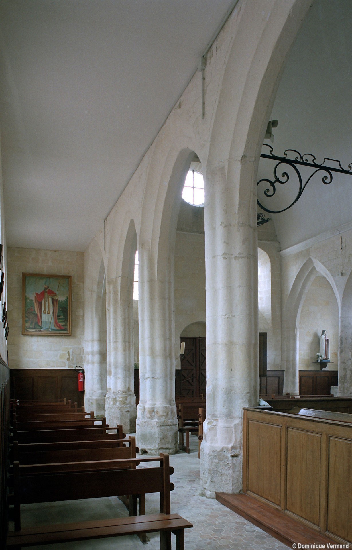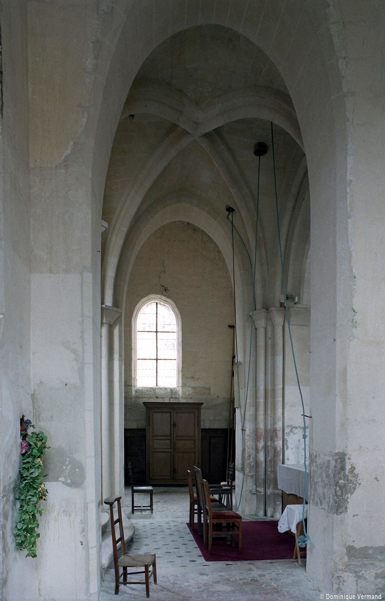 L’édifice du 12ème siècle vaut avant tout pour sa façade et son clocher car le chœur a subi une restauration tellement drastique à la fin du 19ème siècle qu’il en a perdu toute authenticité, tous les chapiteaux d’origine, notamment, ayant disparu. Tout au plus peut-on noter la riche mouluration de l’arc triomphal (arc qui ouvre le chœur sur la nef).