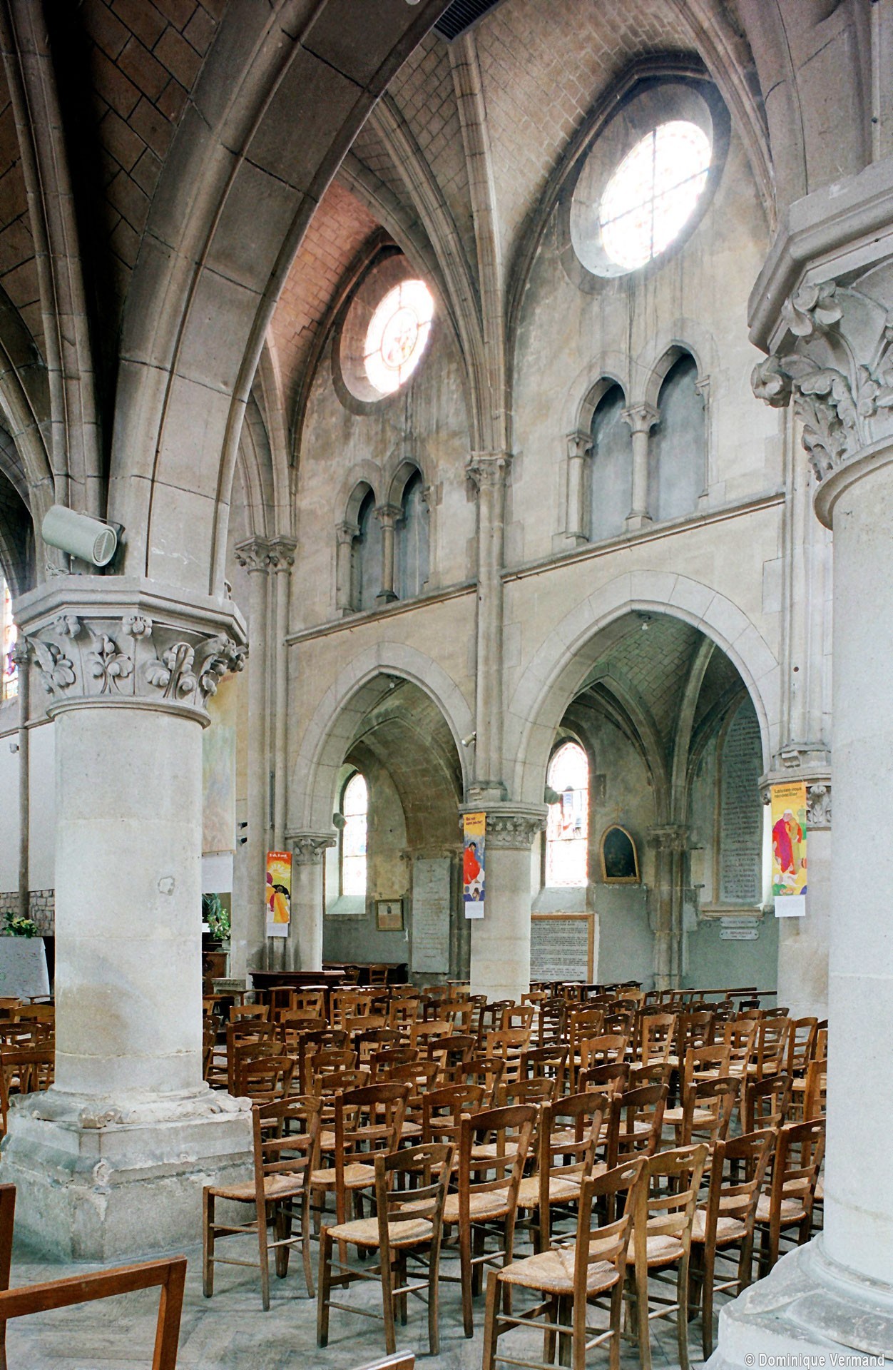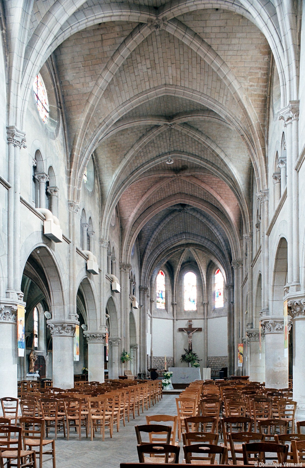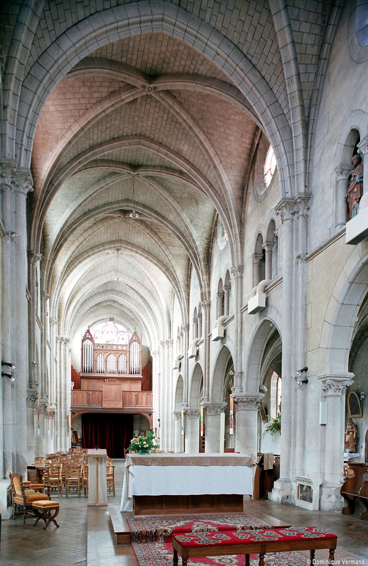 L’édifice comporte sept travées avec bas-côtés. Un chevet à cinq pans le termine à l’est et le clocher, assis sur la base du 15ème siècle, s’élève à l’angle nord-ouest. Inspirée de l’architecture gothique de l’Ile-de-France de la fin du 12ème et du début du 13ème siècle, elle-même fortement influencée par Notre-Dame de Paris, l’élévation superpose trois étages : grandes arcades retombant sur des piles circulaires, arcatures aveugles correspondant aux combles des bas-côtés et fenêtres circulaires. Les travées extrêmes comportent toutefois des piles composées.