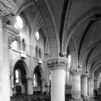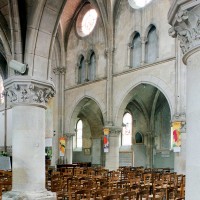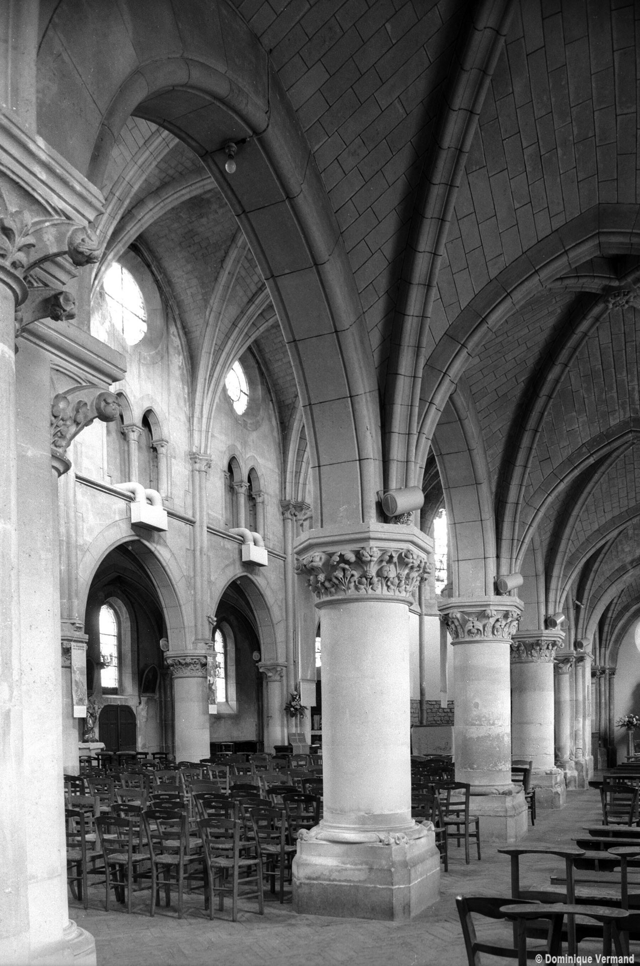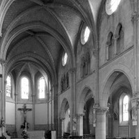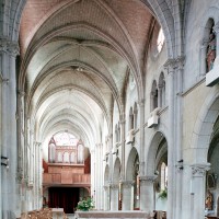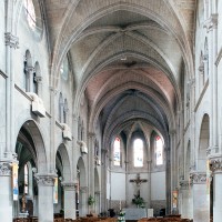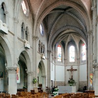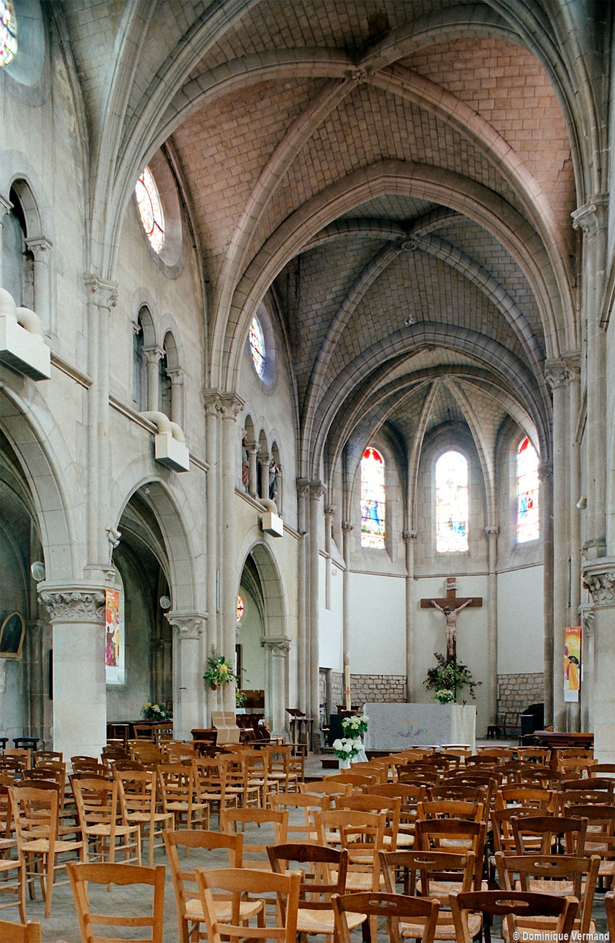 L’édifice comporte sept travées avec bas-côtés. Un chevet à cinq pans le termine à l’est et le clocher, assis sur la base du 15ème siècle, s’élève à l’angle nord-ouest. Inspirée de l’architecture gothique de l’Ile-de-France de la fin du 12ème et du début du 13ème siècle, elle-même fortement influencée par Notre-Dame de Paris, l’élévation superpose trois étages : grandes arcades retombant sur des piles circulaires, arcatures aveugles correspondant aux combles des bas-côtés et fenêtres circulaires. Les travées extrêmes comportent toutefois des piles composées.
