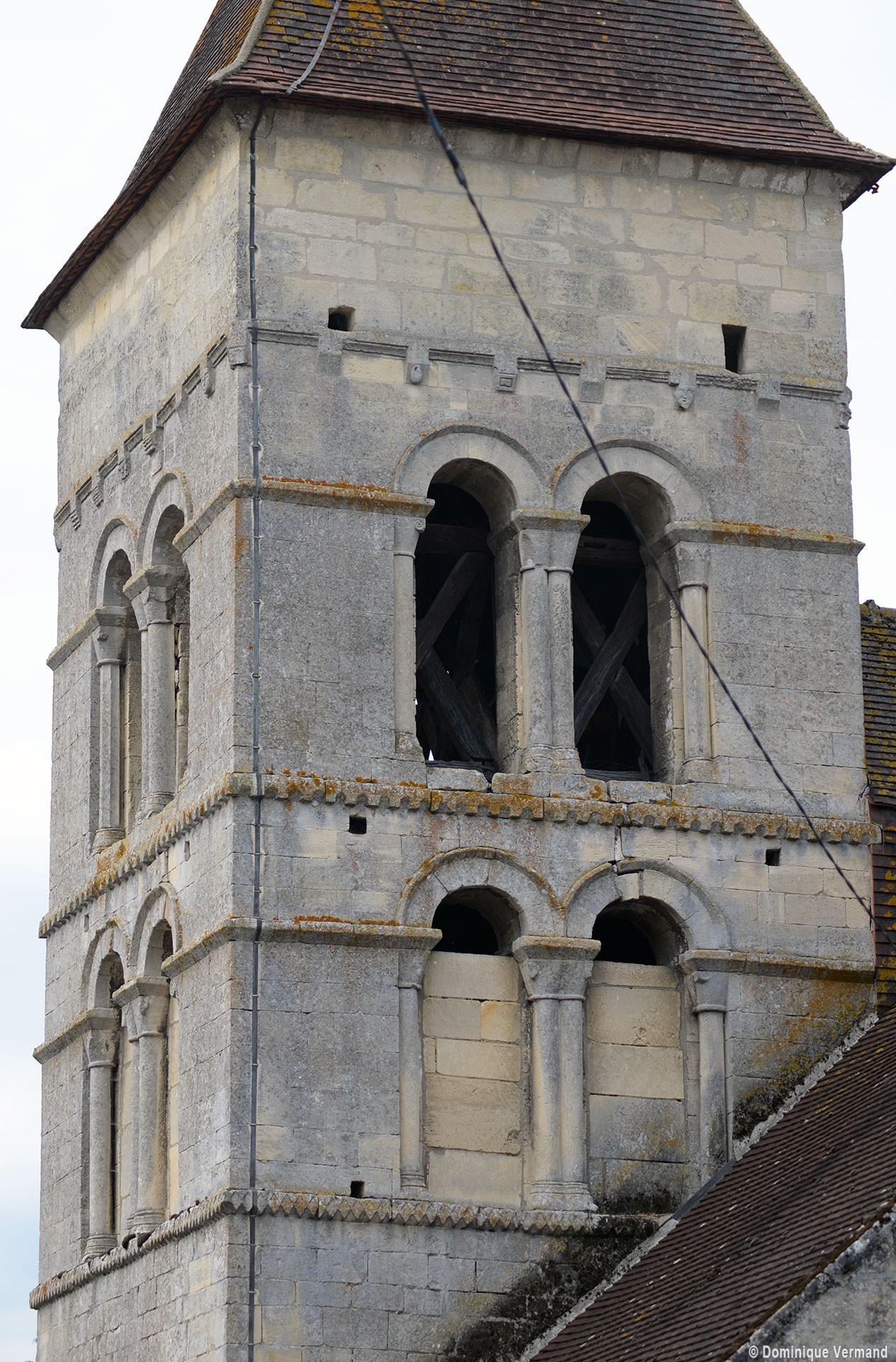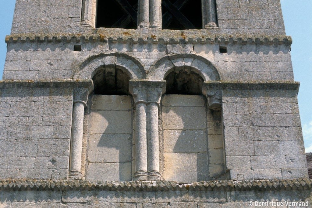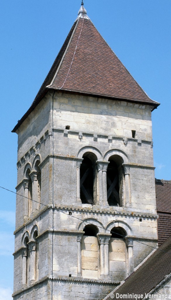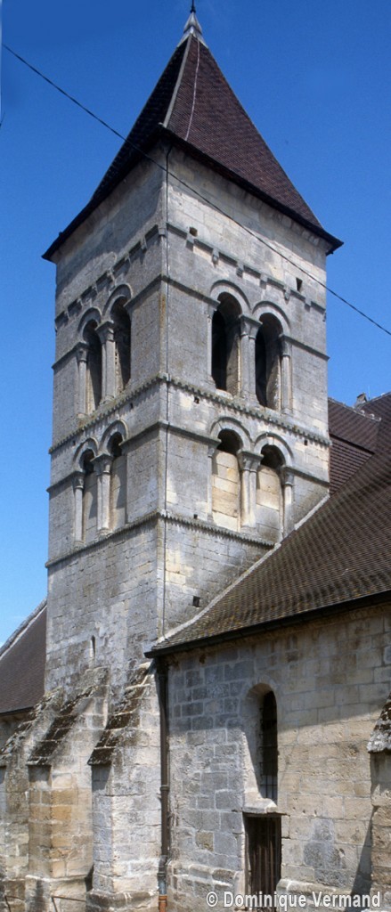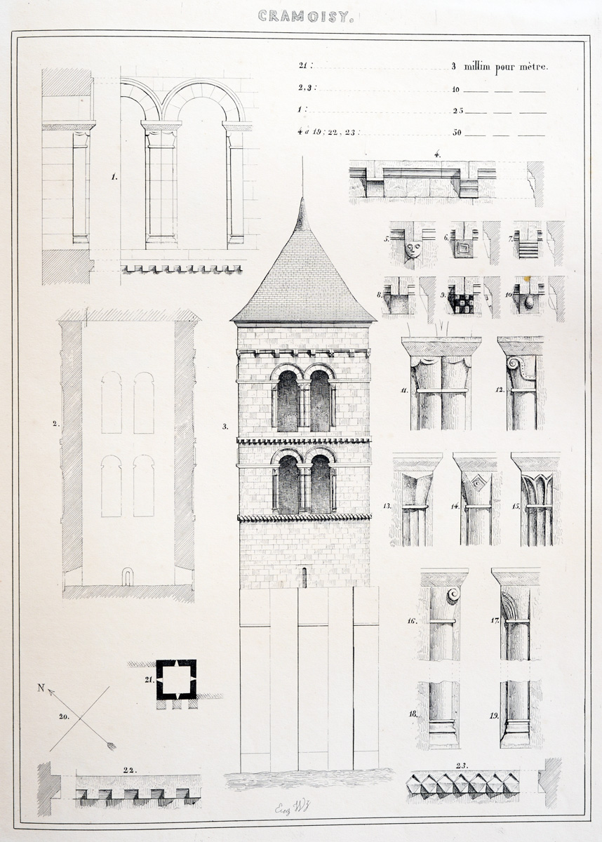 Accroché au raide versant sud de la vallée du Thérain, le petit bourg, autrefois fortifié, de Cramoisy a conservé une intéressante église des 12e et 13e siècles. L’édifice construit au tout début du 12e siècle comprenait une nef unique (il en reste un contrefort en façade) et un chœur plus étroit sur lequel venait s’appuyer, au sud, le clocher. Les reconstructions gothiques n’ont laissé subsister que ce dernier. C’est une tour de deux étages de baies géminées en plein cintre, qu’aucun contrefort ne vient épauler aux angles. Associant billettes, moulure biseautée et dents de scie, son répertoire décoratif la situe bien à la charnière des 11e et 12e siècles. Au-dessus de la corniche à modillons, on remarque une surélévation tardive, peut-être à usage de tour de guet. A l’intérieur, un chapiteau à grosses volutes d’angle et tailloir à décor de billettes et d’étoiles recevait à l’origine l’arc triomphal du chœur roman.