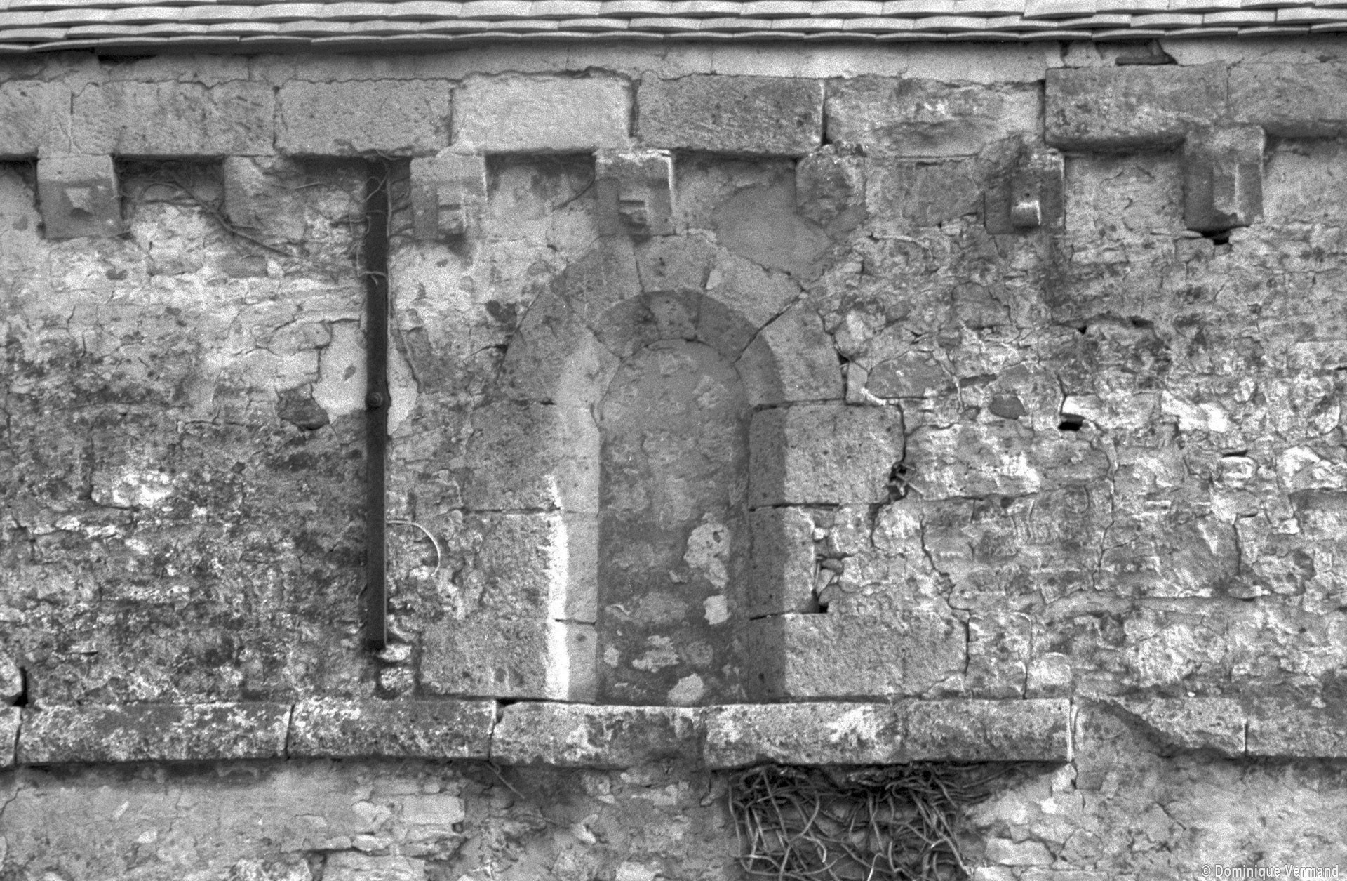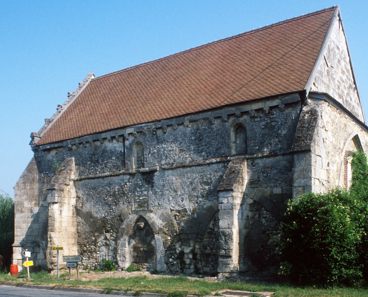 Maintenant simple construction rectangulaire, longtemps utilisé comme grange, cet édifice avait été bâti dans les années 1130 comme le montre le mur sud de la nef avec ses trois arcades brisées – elles sont aujourd’hui bouchées et masquées en partie basse par un sol fortement surhaussé -, les petites fenêtres en plein cintre qui les surmontent et la corniche romane à modillons. L’église comportait donc des bas-côtés et le choeur, encore debout au siècle dernier, était constitué de deux travées et terminé par un chevet plat éclairé par un triplet. Un clocher, en partie reconstruit par la suite, s’élevait au nord de la première travée du choeur.