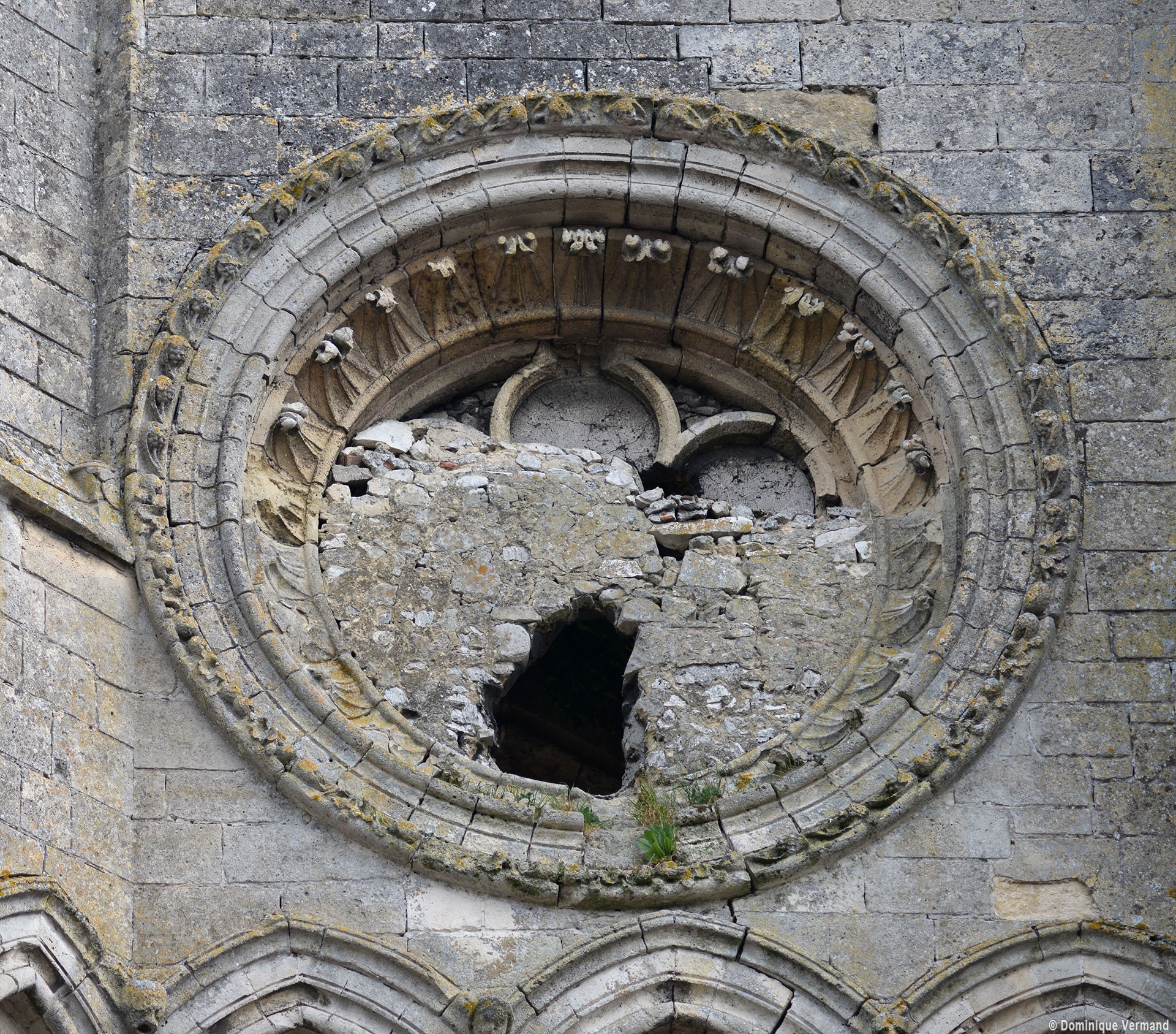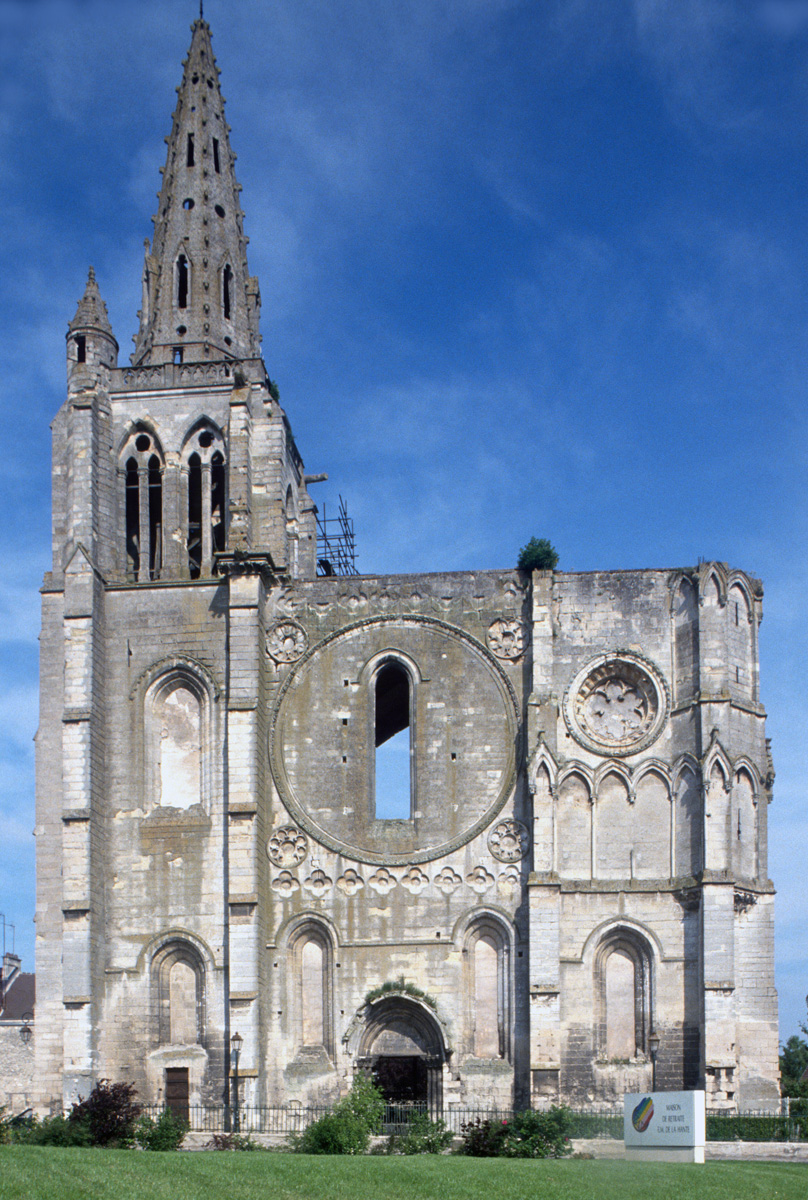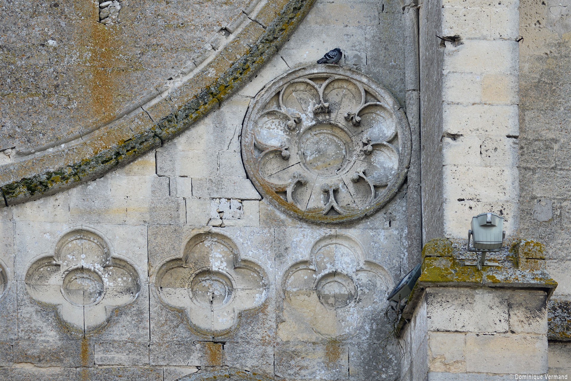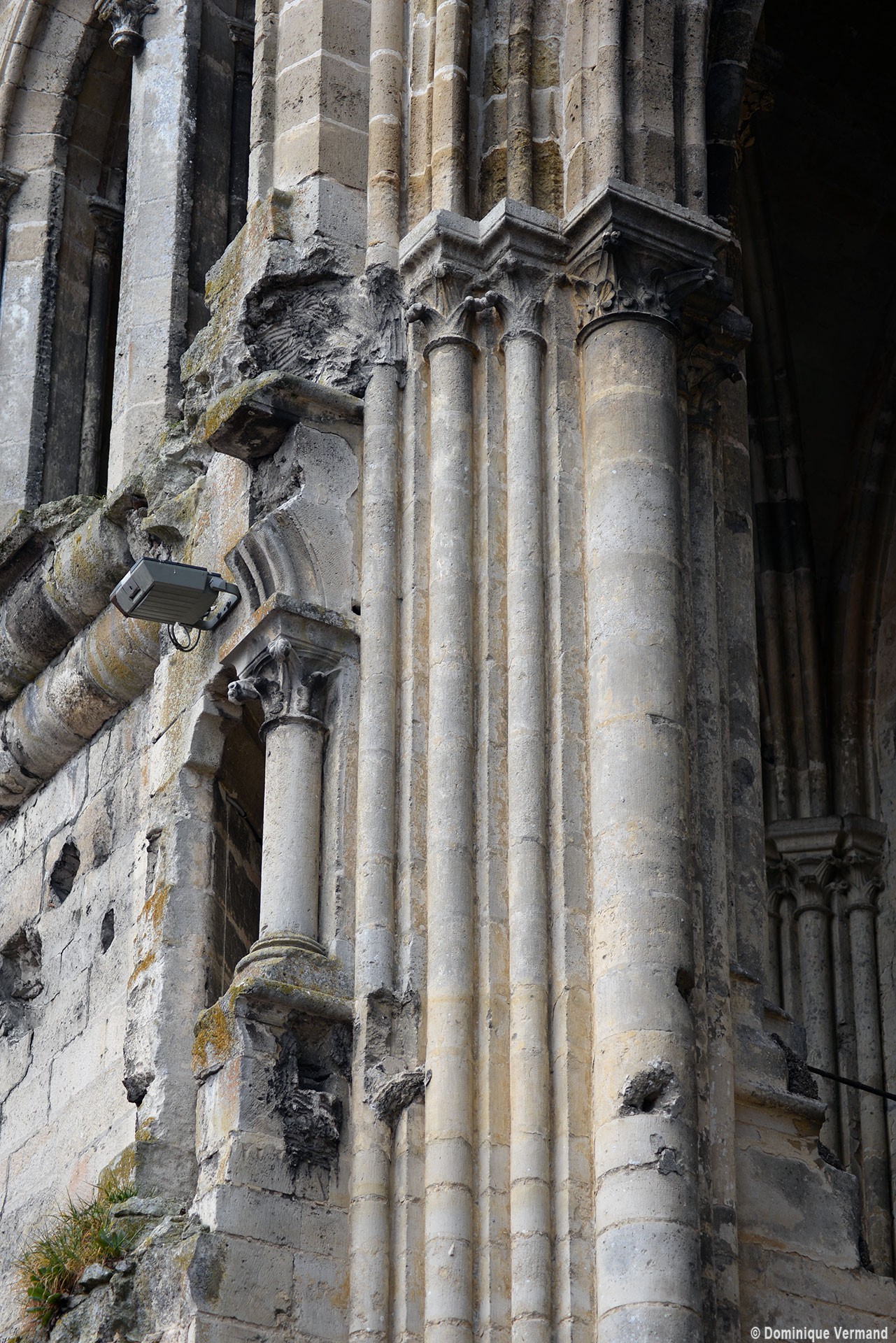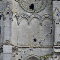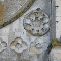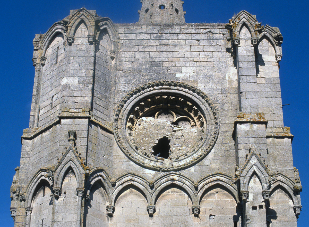 Le parti pris d’austérité qui prévaut au niveau inférieur et à la tour nord, les premiers bâtis, semble progressivement abandonné ensuite. En partie centrale, l’immense rose – malheureusement privée de son réseau – est en effet inscrite entre deux rangs de quatre feuilles tandis que des rosaces à huit lobes l’accompagnent dans les angles. Aux parties supérieures de la tour sud, bâties en dernier, un réseau d’arcatures aveugles retombant sur des colonnettes en délit et deux petites roses à six lobes habillent et ajourent les faces ouest et sud dans une recherche décorative encore plus poussée. De même, la fenêtre qui s’ouvre à l’est, formée de deux lancettes et d’une rose, appartient à un type qui, inauguré à la cathédrale de Soissons, sera repris dans tous les grands édifices du premier quart du 13ème siècle tandis que celles de la tour nord, formée d’une simple lancette, restent dans la tradition du siècle précédent.