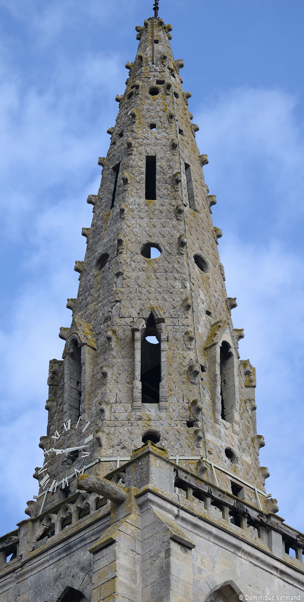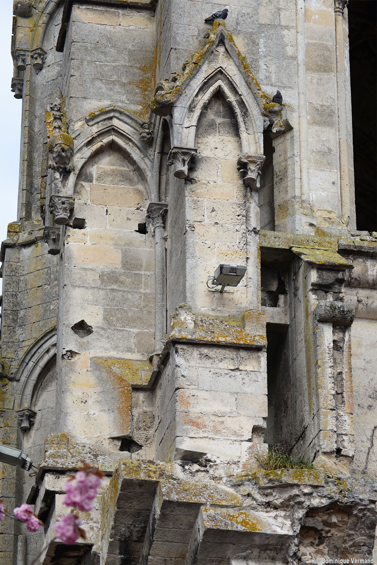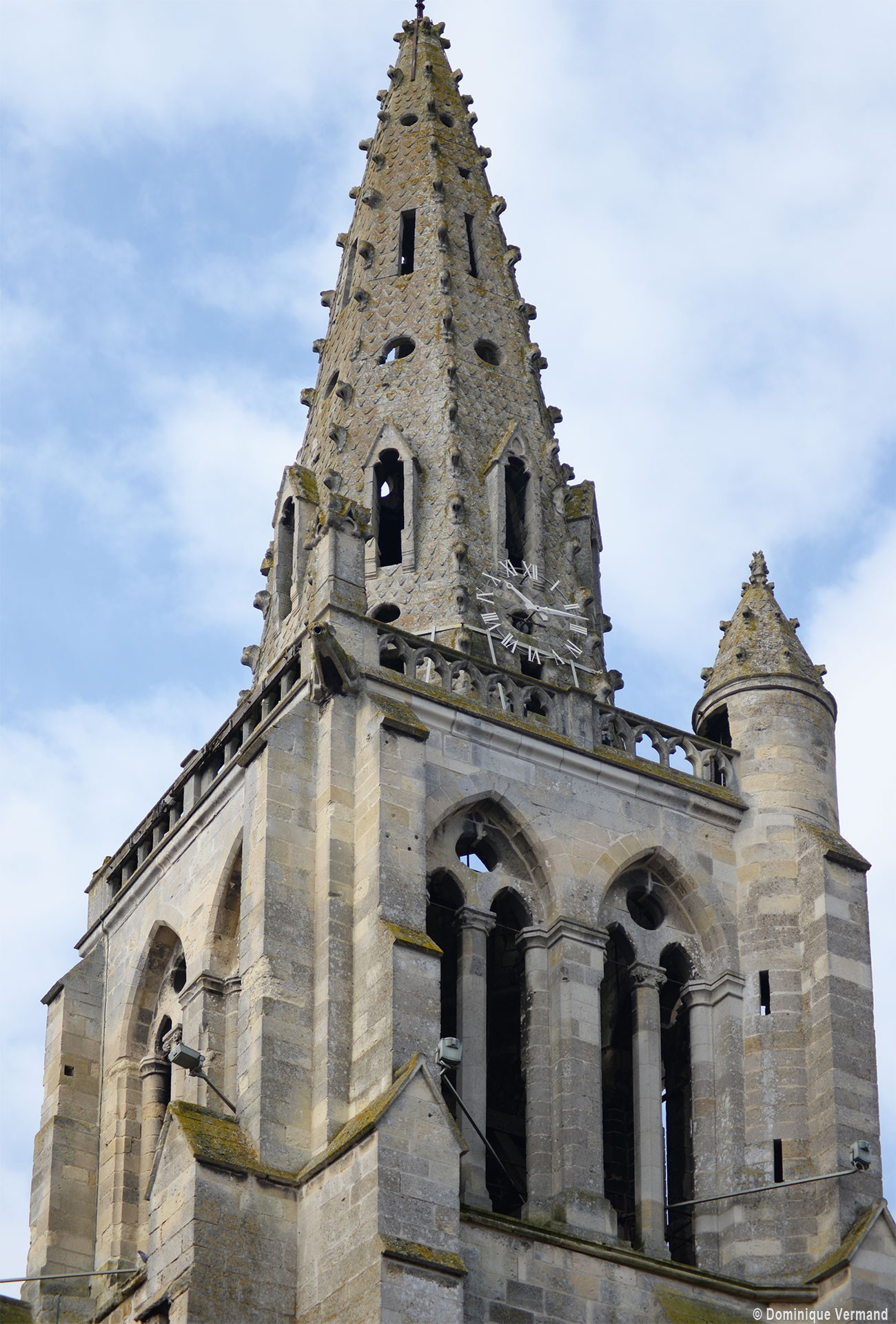 La construction de l’édifice devait connaître ensuite un long arrêt, le transept et le choeur n’étant entrepris qu’au 14ème siècle. La tour sud a perdu l’étage correspondant au beffroi et sa flèche lors du siège de Crépy par les Anglais en 1434 tandis que la flèche de la tour nord, écho lointain et modeste de celle de la cathédrale de Senlis, a été reconstruite entre 1520 et 1528. Trop grèle pour la plate-forme qui la reçoit, elle appartient à la nombreuse famille des flèches gothiques du Valois.