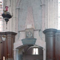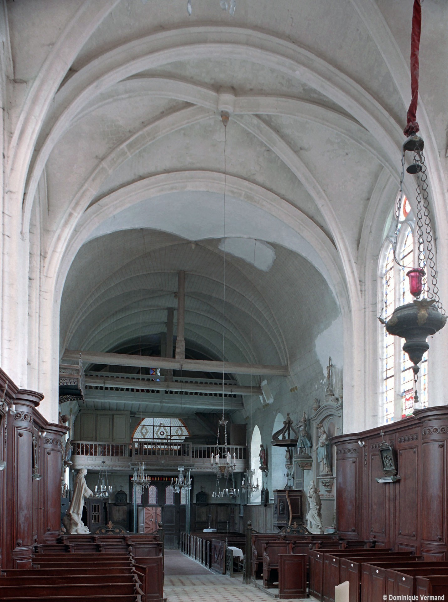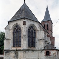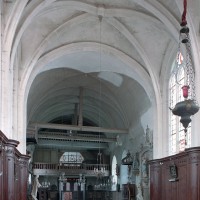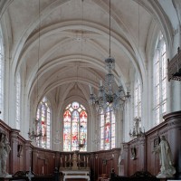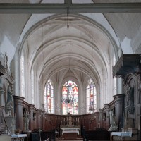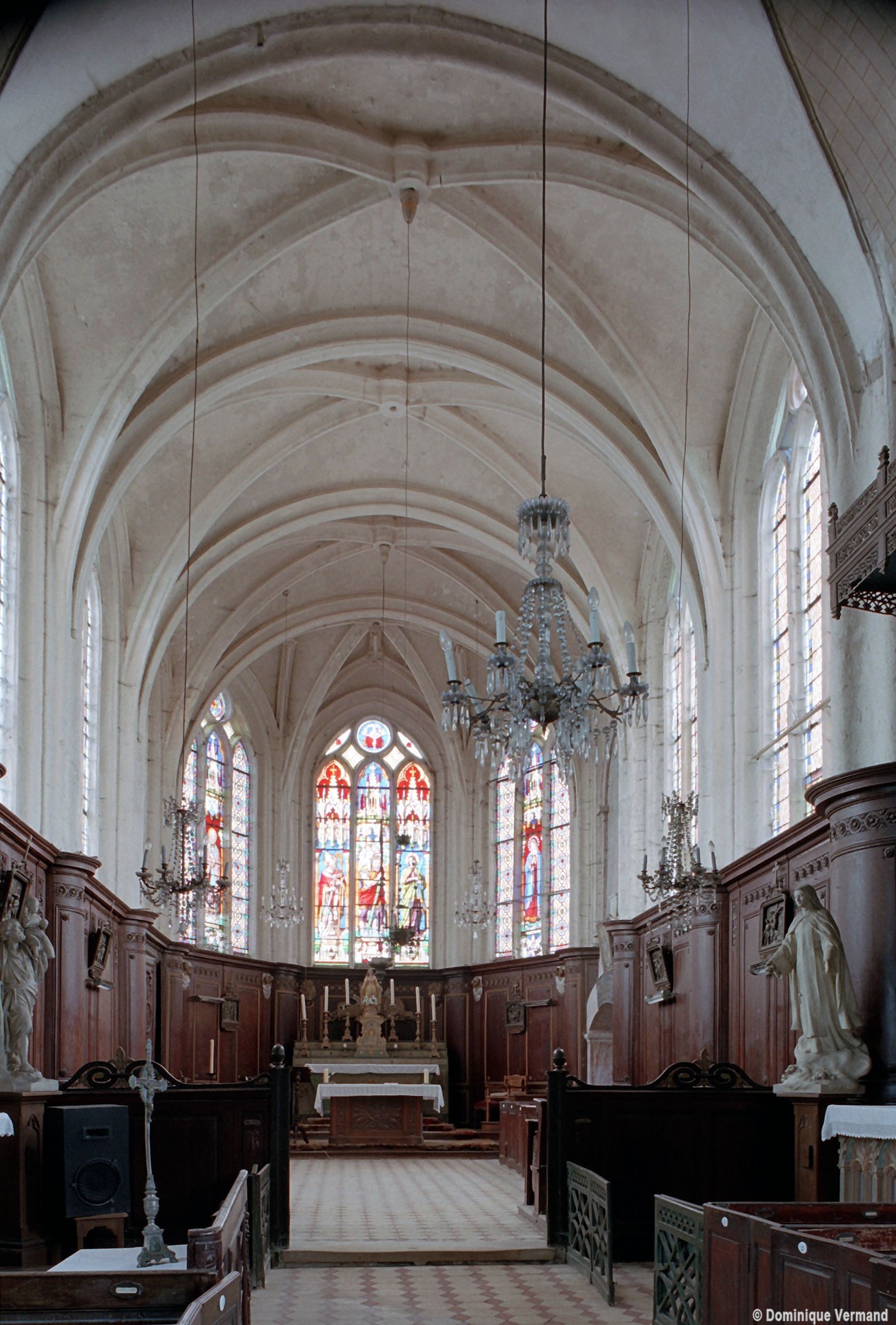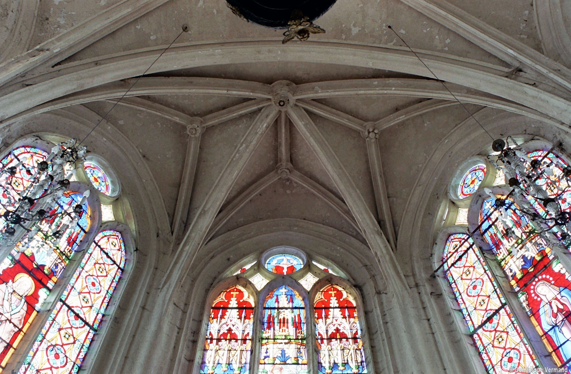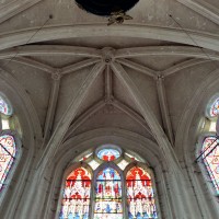 A l’image de beaucoup d’édifices de la région, le choeur sera reconstruit au 16ème siècle dans le style gothique flamboyant, ici très assagi. Long de trois travées, il s’achève par une abside à trois pans. Les fenêtres ont toutes le même réseau très sobre à trois lancettes surmontées d’une petite rose. L’intérieur est tout aussi dépouillé – les retombées des voûtes d’ogives s’effectuent par simple pénétration dans les murs – et la seule note moins austère est donnée par la voûte de l’abside, qui comporte des nervures secondaires (liernes et tiercerons). Les vitraux qui garnissaient les neuf grandes fenêtres au 16ème siècle, aujourd’hui disparus, devaient toutefois modifier complètement la perception de cette partie du monument.