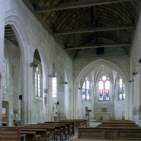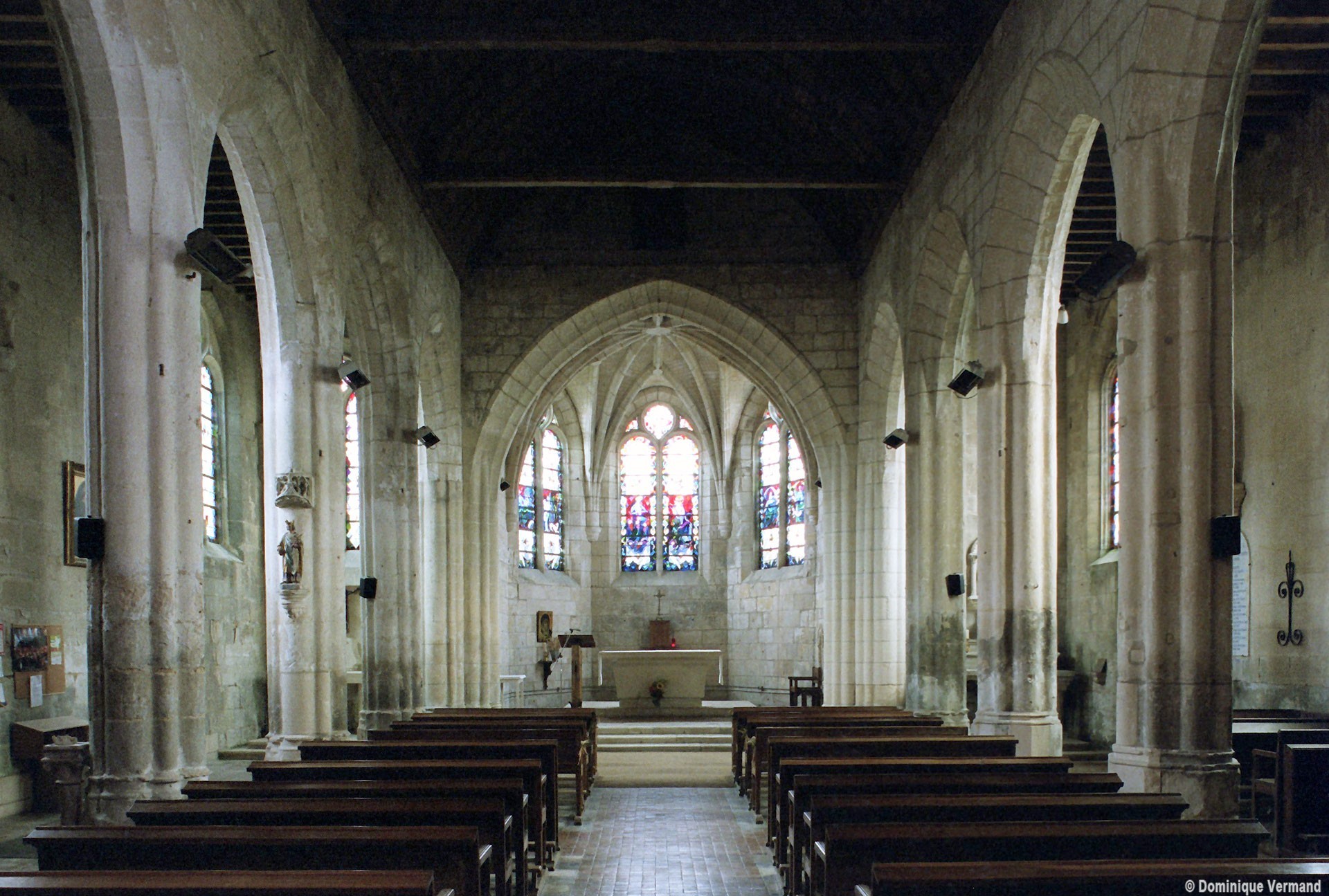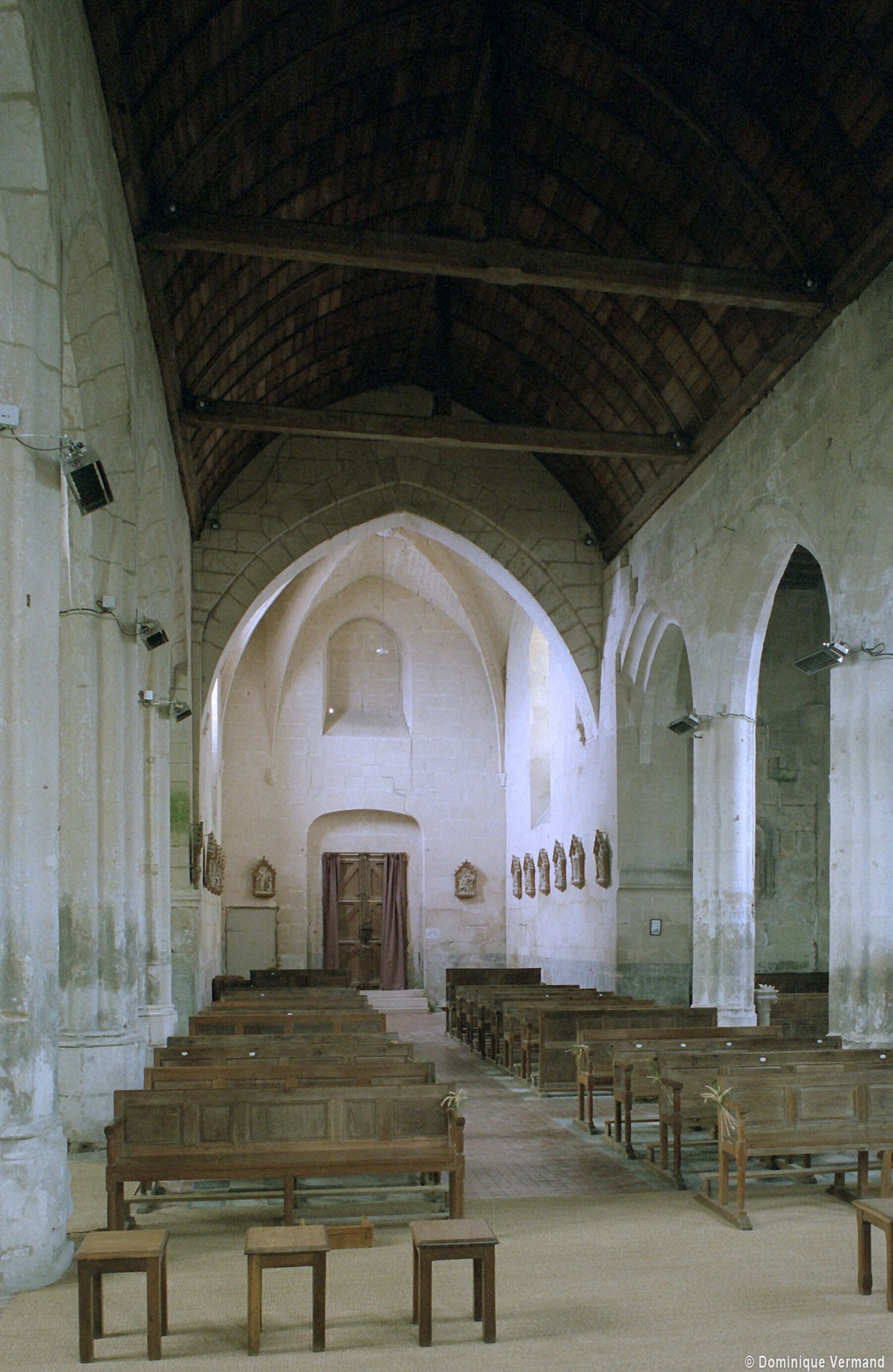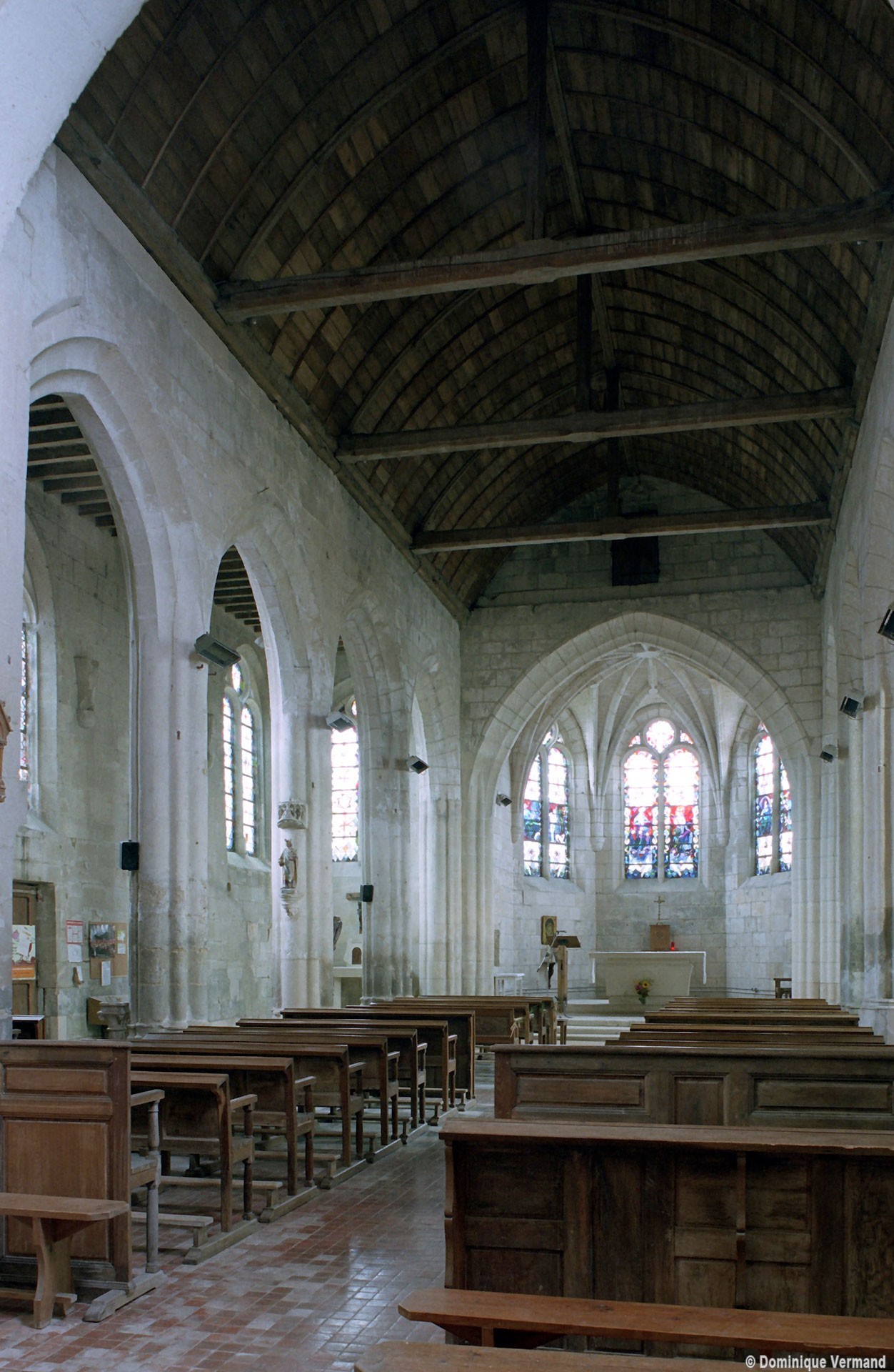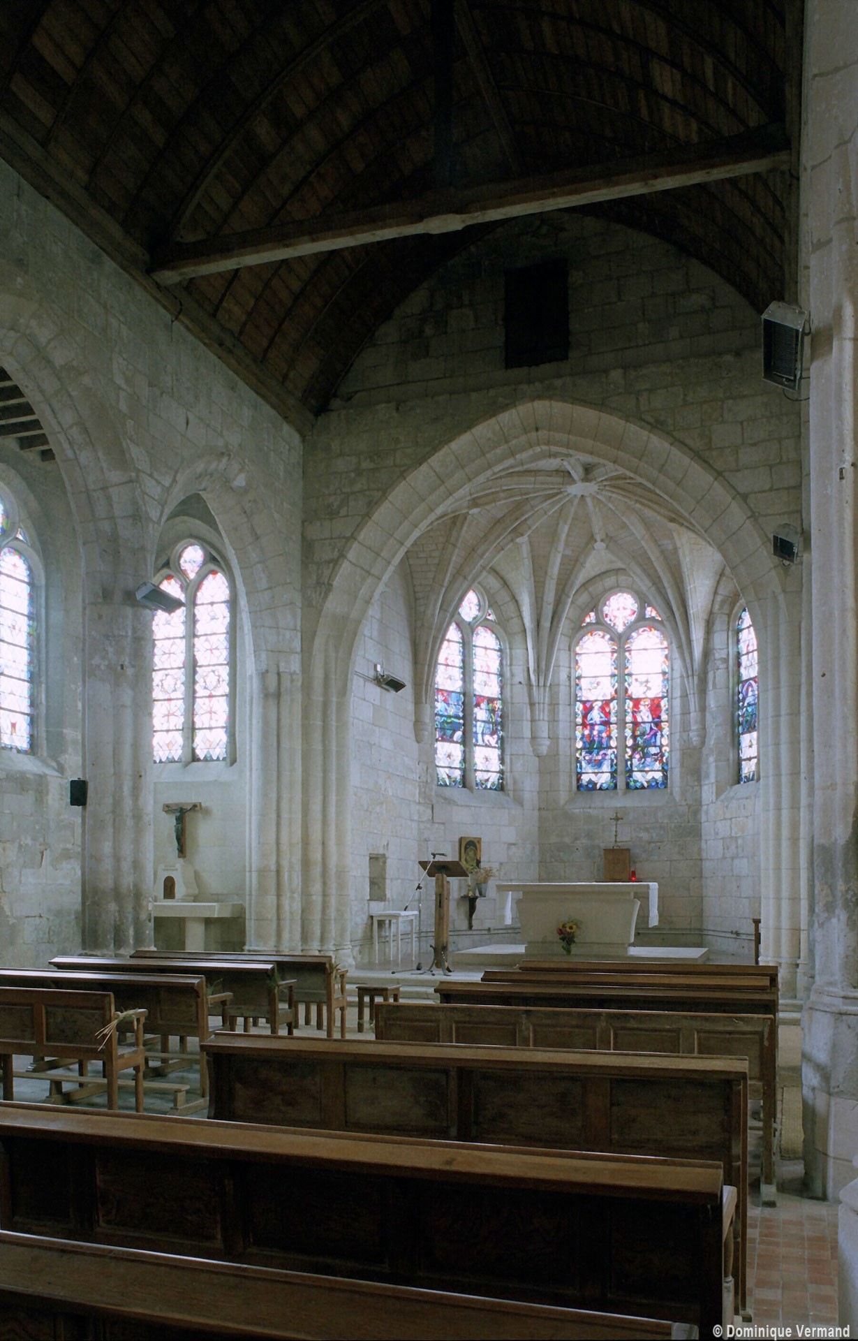 Couverte d’une charpente en carène et ouvrant largement sur les bas-côtés, la nef ne manque pas d’élégance avec ses hautes arcades à profil prismatique, reçues sur des piles ondulées sans l’intermédiaire de chapiteaux. Le bas-côté nord montre des retombées de voûtes jamais construites. L’abside est surtout remarquable pour la belle voûte qui la couvre, dont le réseau des nervures, reçues sur des cul-de-lampe, se complète de liernes et de tiercerons. On note la présence, dans le mur sud, d’une petite piscine liturgique décorée d’une coquille Saint-Jacques.