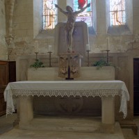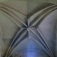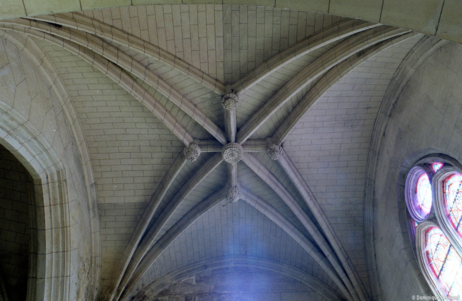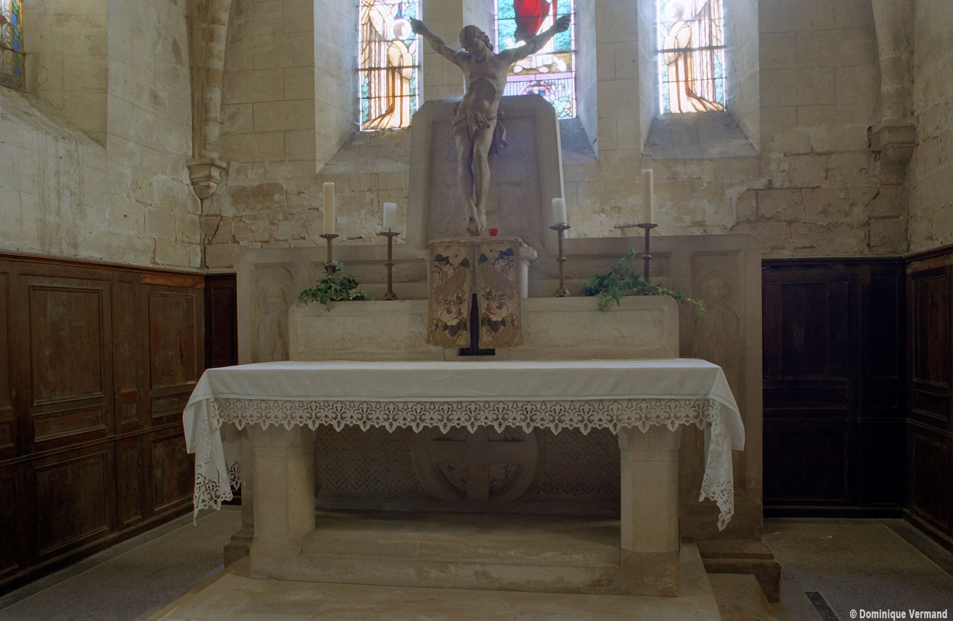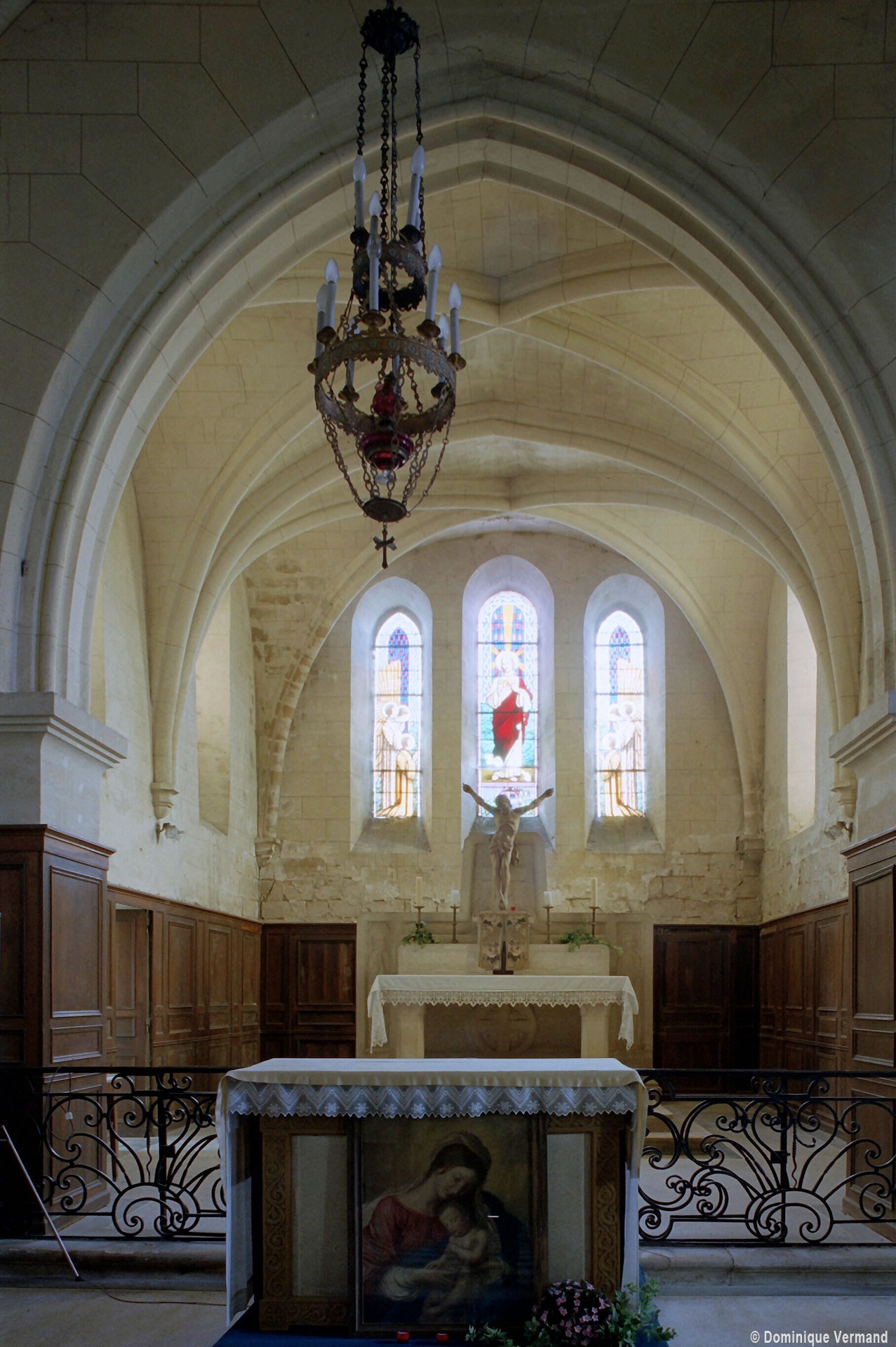 Seuls celle-ci et le choeur ont trouvé grâce lors de ces importants travaux. Datant du tout début du 13ème siècle, le choeur est une construction très simple, ajouré à l’est par un triplet de fenêtres longues et étroites, sans décor. Des fenêtres identiques sont percées dans les murs nord et sud. L’intérieur est couvert de deux voûtes d’ogives à l’authenticité douteuse, reçues sur des culs-de-lampe.