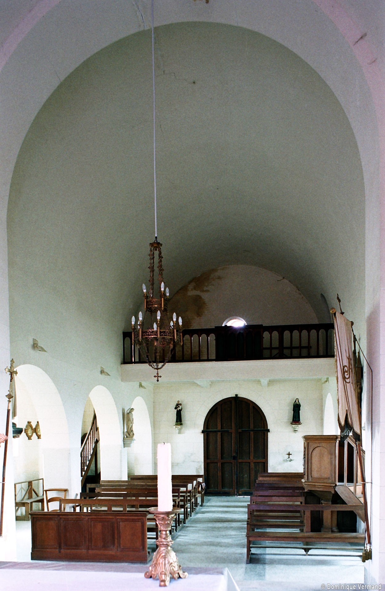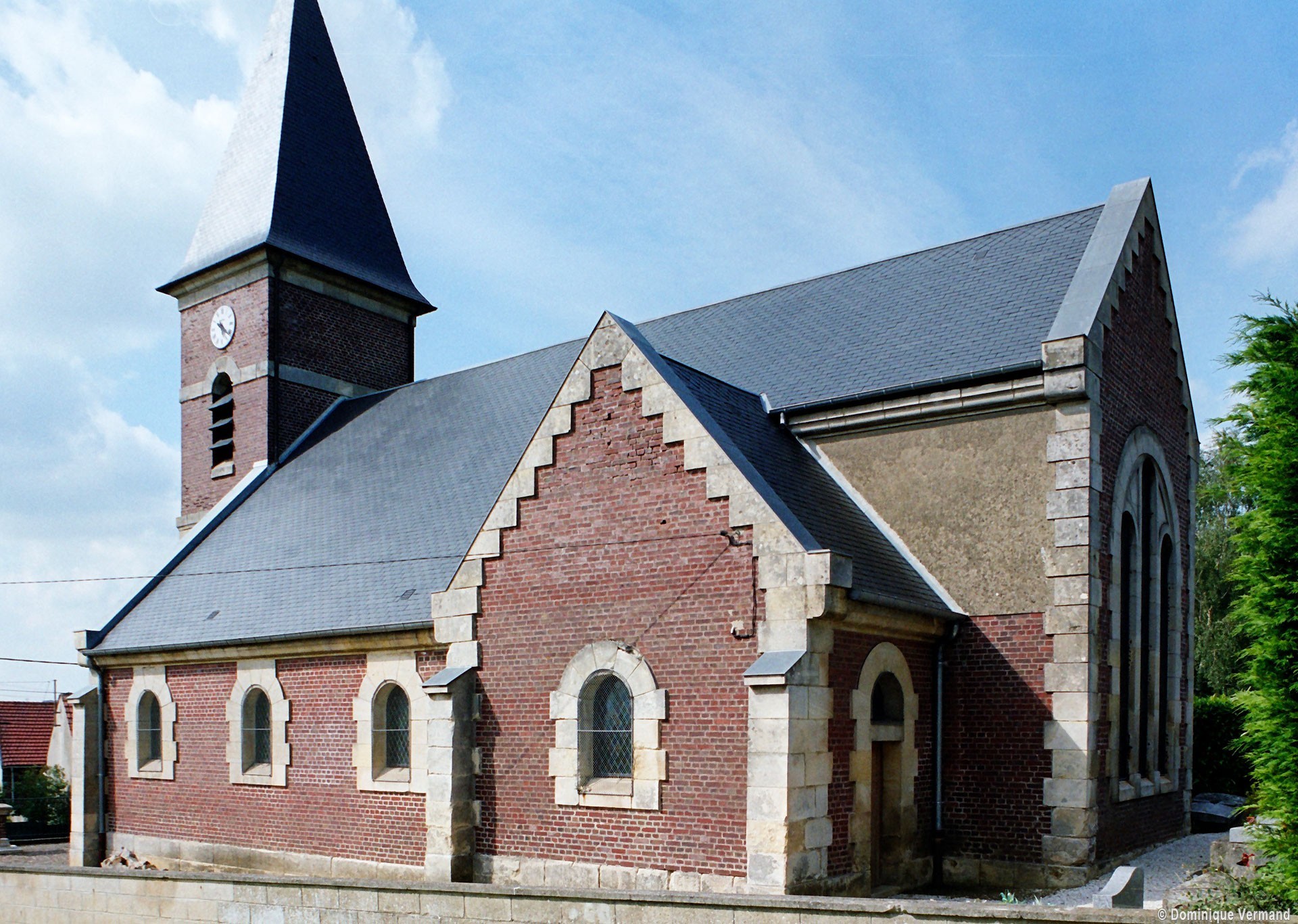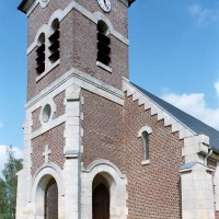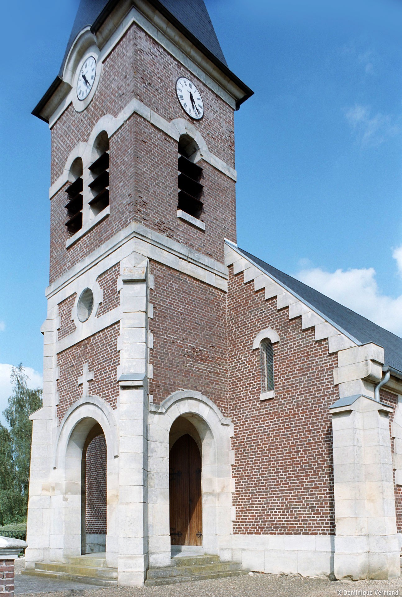 Totalement détruite durant la Guerre 14-18, Notre-Dame a été rebâtie dans les années 1920. Reconstruite en briques et pierre comme souvent dans la région, et bien que de petites dimensions, elle adopte un plan assez complet comprenant une nef avec bas-côtés, de trois travées, un choeur à chevet plat flanqué de deux croisillons et, en façade, un clocher porche qui communique avec une tribune occupant la première travée de la nef. Toutes les ouvertures – fenêtres comme arcades – sont en plein cintre et l’ensemble est de style néo-roman. Le clocher porche et le faux transept (les croisillons sont de simples annexes) font écho aux traditions régionales romanes.