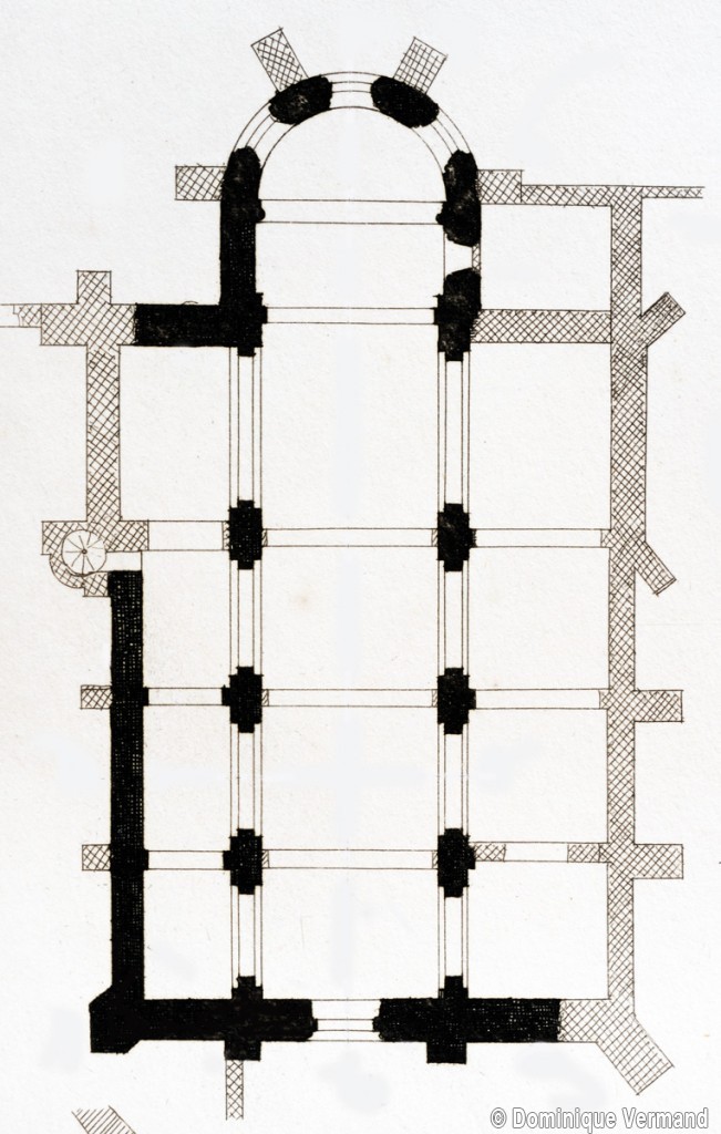 Bâti au milieu du 12ème siècle, il comprenait – comme aujourd’hui car les travaux du 19ème siècle n’en ont pas modifié le plan – une nef de trois travées avec bas-côtés, un transept, et un choeur formé d’une travée droite et d’une abside en hémicycle. Le croisillon et le bas-côté sud, ainsi que la façade du croisillon nord, résultent d’une reconstruction effectuée au 16ème siècle. Implanté à l’angle sud-ouest, le clocher remplace celui d’origine qui, assis sur la croisée du transept, s’est effondré en 1745 suite à un incendie.