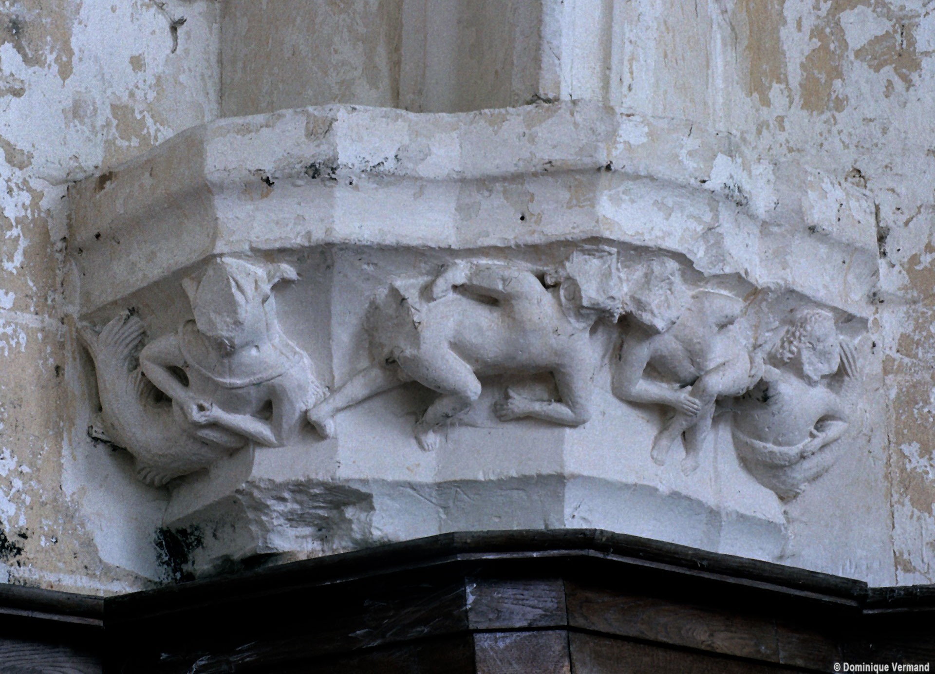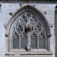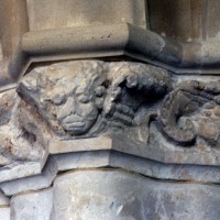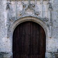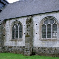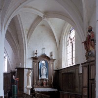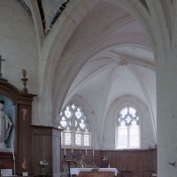 Le transept est la partie la plus originale : de part et d’autre de la croisée, constituée de quatre fortes piles cylindriques qui devaient supporter autrefois un clocher en pierre, se développent en effet deux croisillons qui étaient en réalité des chapelles seigneuriales comme l’attestent leurs clefs de voûte à blason sculpté. Ces chapelles ouvrent vers la nef par deux petits passages ménagés de part et d’autre des piles ouest. A l’est, elles comportent une courte seconde travée qui déborde les piles orientales de la croisée et ouvrent directement sur le choeur par une large arcade disposée de biais. Malgré la présence des piles de la croisée, l’espace intérieur de l’édifice apparaît ainsi comme très ouvert. Les voûtes d’ogives retombent, soit par pénétration directe dans les maçonneries (croisée et chapelles), soit sur des chapiteaux formant comme une frise sculptée continue dont les thèmes sont d’une grande variété – créatures fantastiques, masques, anges, flore…- et méritent d’être détaillés.