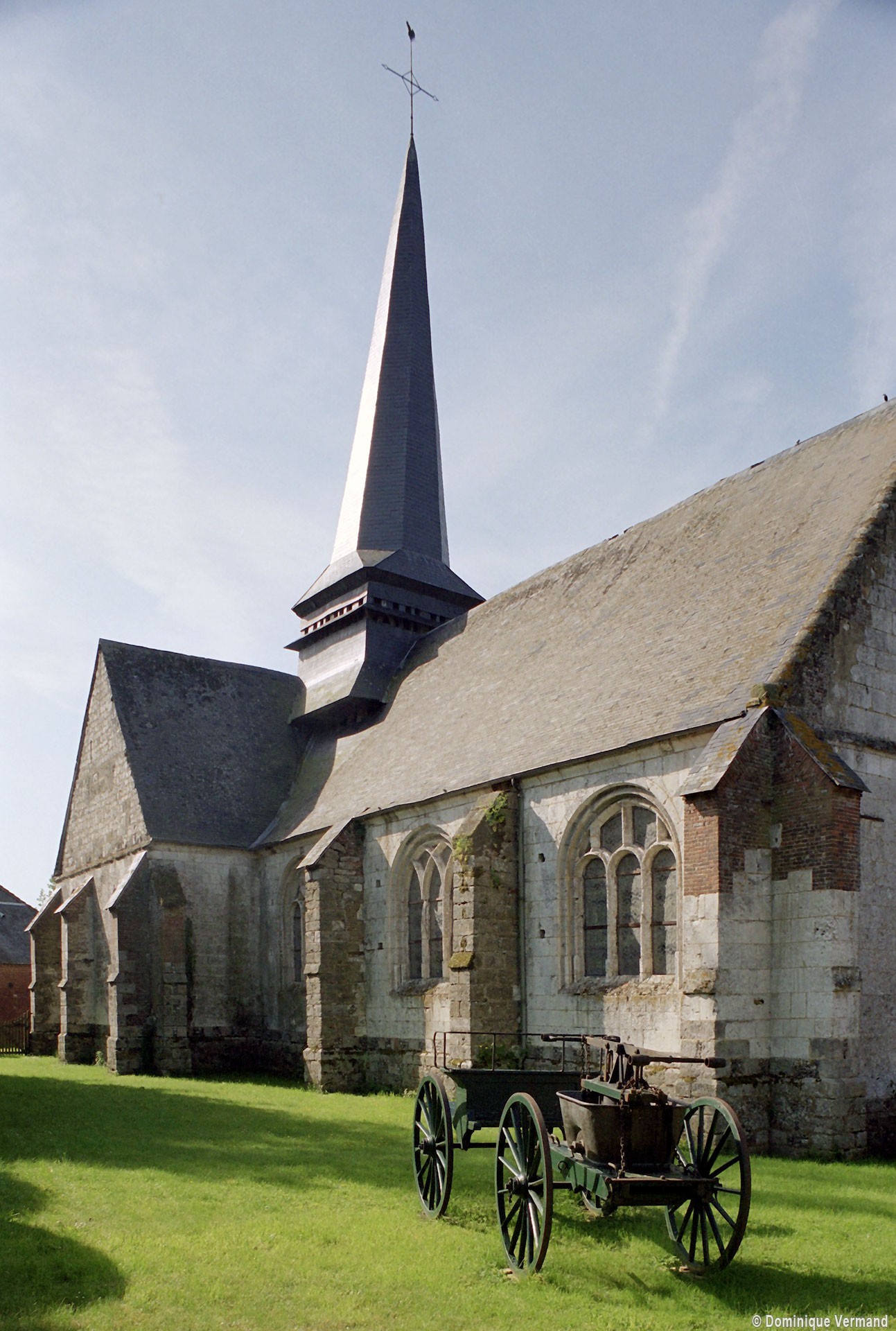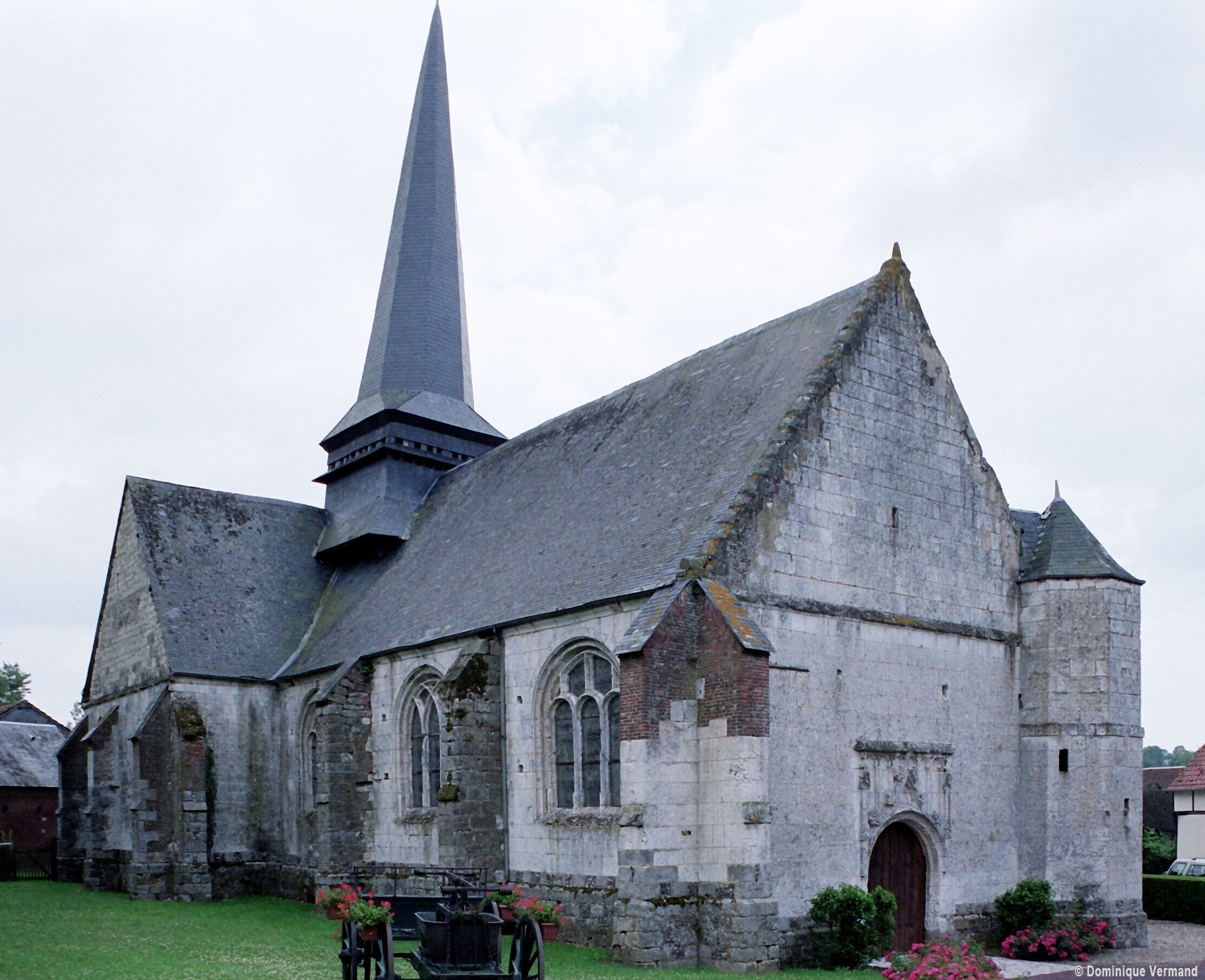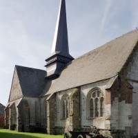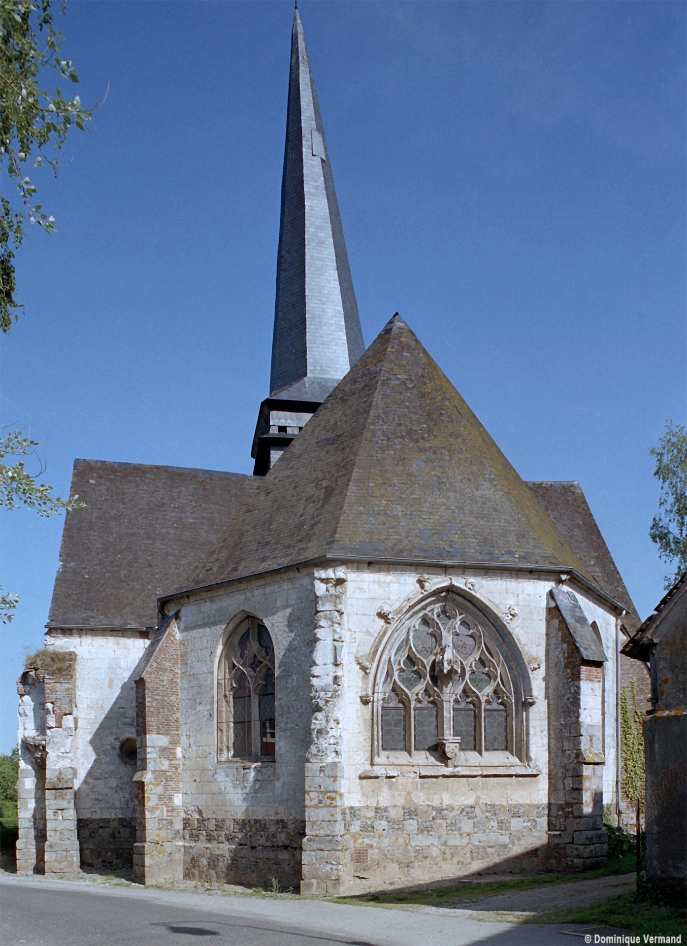 L’église est construite en blocs de pierre crayeuse bien appareillés – mais comportant souvent des rognons de silex – sur un soubassement constitué par un damier de grès et de silex. Par leur tracé en plein cintre et le dessin de leur remplage, les fenêtres de la nef appartiennent déjà à la Renaissance alors que les deux portails restent encore imprégnés du style gothique flamboyant. Celui de l’ouest est surmonté d’un arc en accolade décoré de feuilles de choux et le portail méridional était encadré par deux statues aujourd’hui disparues. Dans les deux cas, un réseau d’arcatures aveugles les couronnent. Mais l’élément le plus spectaculaire est la fenêtre du chevet, dont le réseau en courbes et contre-courbes est d’une grande virtuosité. Six petits éléments sculptés sont comme accrochés à son archivolte tandis que le meneau central, pourvu d’un piédestal et d’un dais, accueillait autrefois une statue.